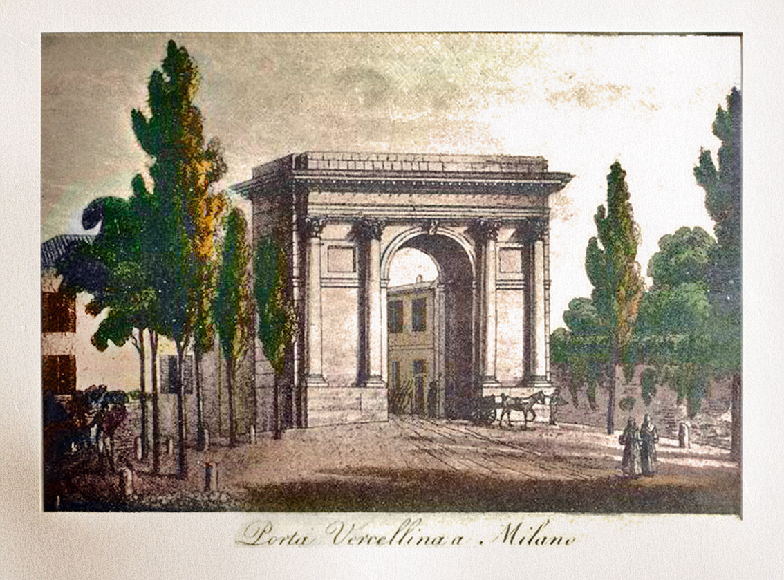 Porta Vercellina fu una delle prime a essere realizzate, in vista dell’ingresso trionfale di Napoleone a Milano l’8 maggio 1805, in occasione della sua incoronazione come Re d’Italia il 26 maggio dello stesso anno. Luigi Canonica, allievo di Piermarini e architetto di Stato dal 1797, fu incaricato di progettare un arco trionfale in stile neoclassico, caratterizzato da un unico fornice centrale e decorato con mezze colonne corinzie sul lato di campagna (mentre il lato cittadino era più semplice) e una trabeazione imponente.