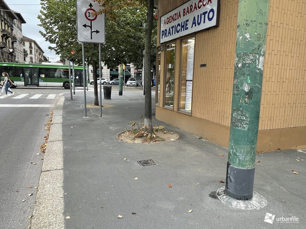 La prima isola ospita chioschi, edicole e una vecchia struttura curva (costruita negli anni Cinquanta), un tempo rivendita di biglietti per le linee urbane e extraurbane oggi ufficio per pratiche automobilistiche. La disposizione di pali, cartelli e piante sembra casuale, creando un ambiente caotico e poco funzionale per i passanti, costretti a muoversi tra ostacoli. Inoltre, la presenza di auto parcheggiate in modo disordinato contribuisce al degrado visivo dell’area. Tra queste si trova anche un furgoncino malconcio utilizzato come “magazzino” per il venditore ambulante fisso verso via San Michele del Carso (possibile non poter costringere fioristi e rivenditori ad usare un chiosco decente e fisso per la vendita in strada? Possibile non ci sia una soluzione?).