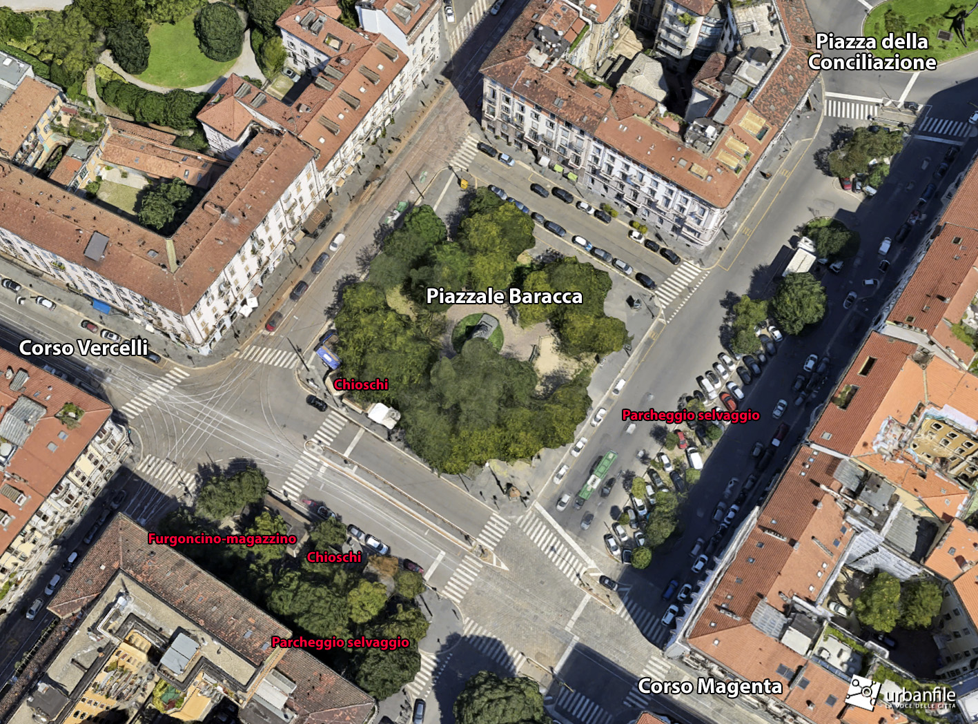 Nonostante Piazzale Baracca si trovi in una delle zone più eleganti di Milano, caratterizzata da palazzi d’epoca e grande storia, il disordine urbano accumulatosi nel corso dei decenni ne penalizza il fascino. La mancanza di una visione coordinata e di interventi di riqualificazione è evidente, con ogni elemento aggiunto senza armonia rispetto al contesto.