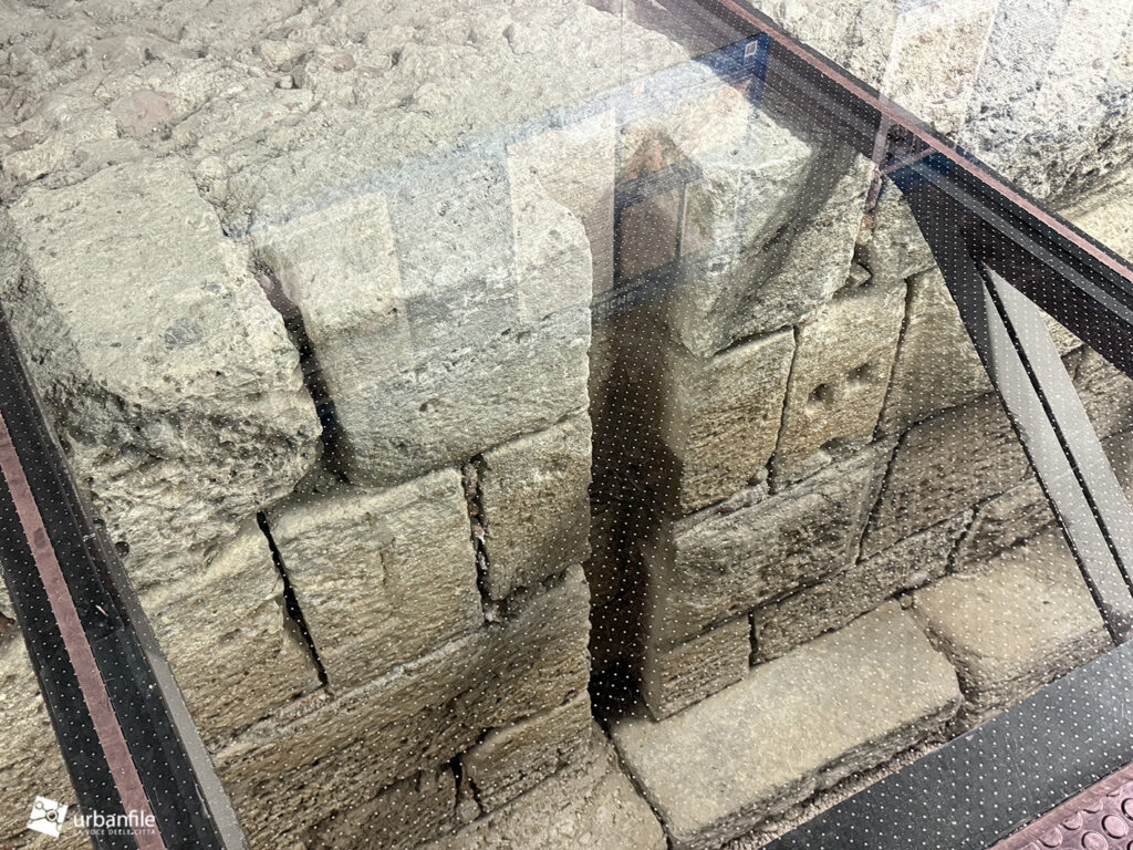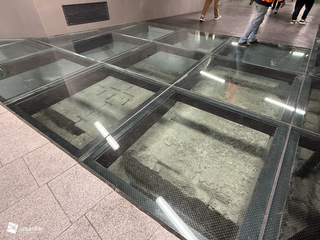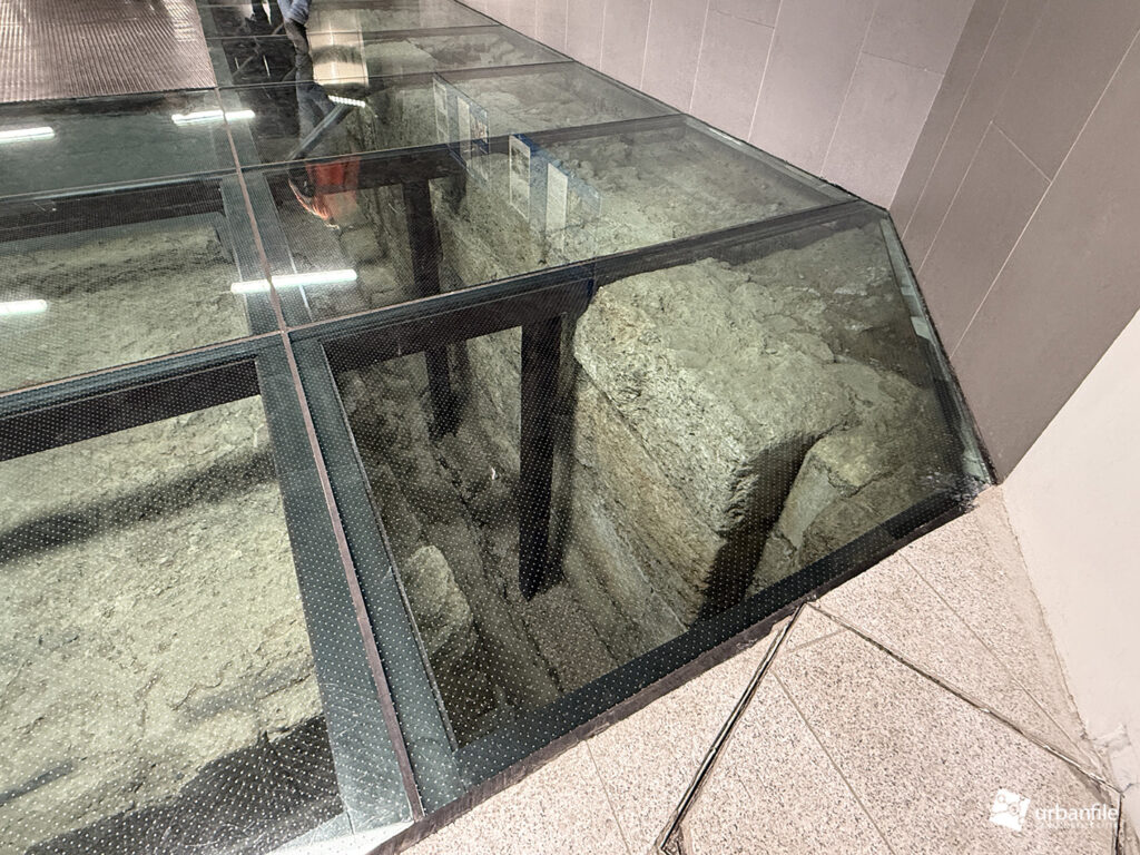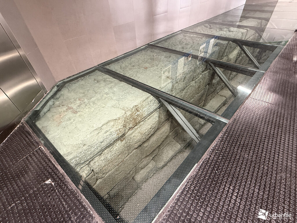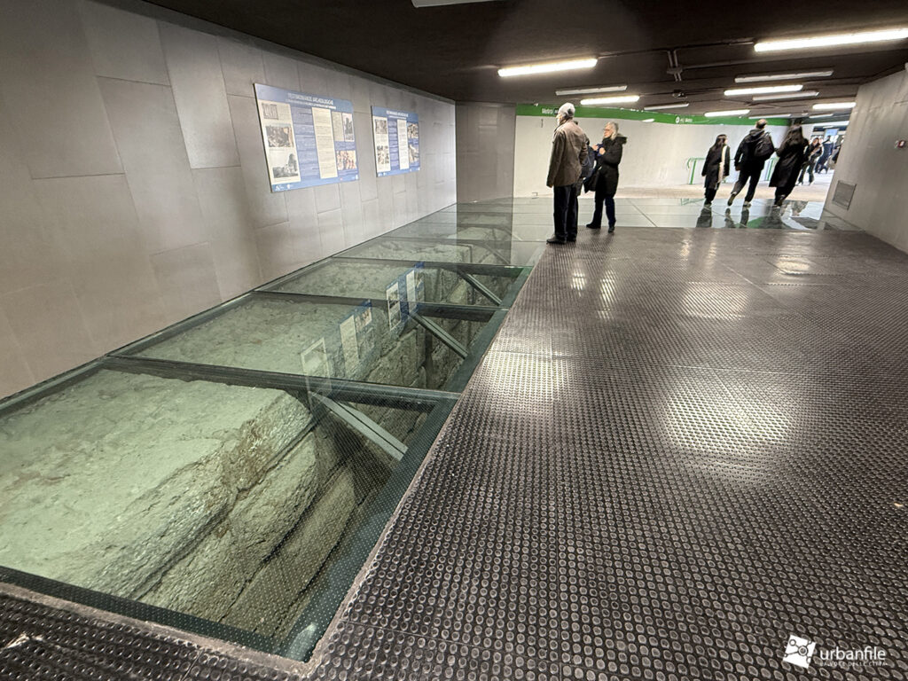 Nonostante gli spazi limitati e i numerosi vincoli dell’area – tra cui la presenza della sottostante galleria della M2 – è stato possibile creare un percorso che valorizza e conserva queste murature storiche, visibili attraverso un pavimento in vetro trasparente.