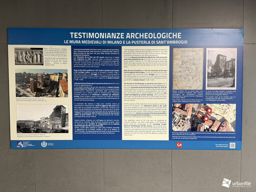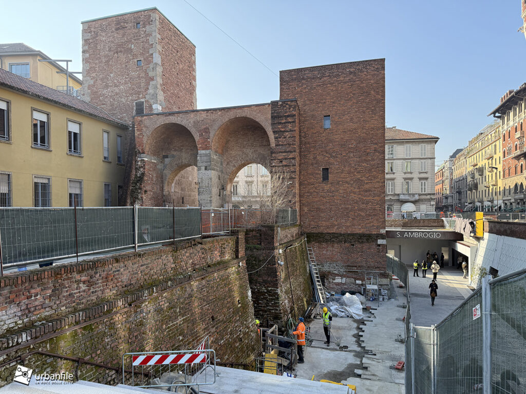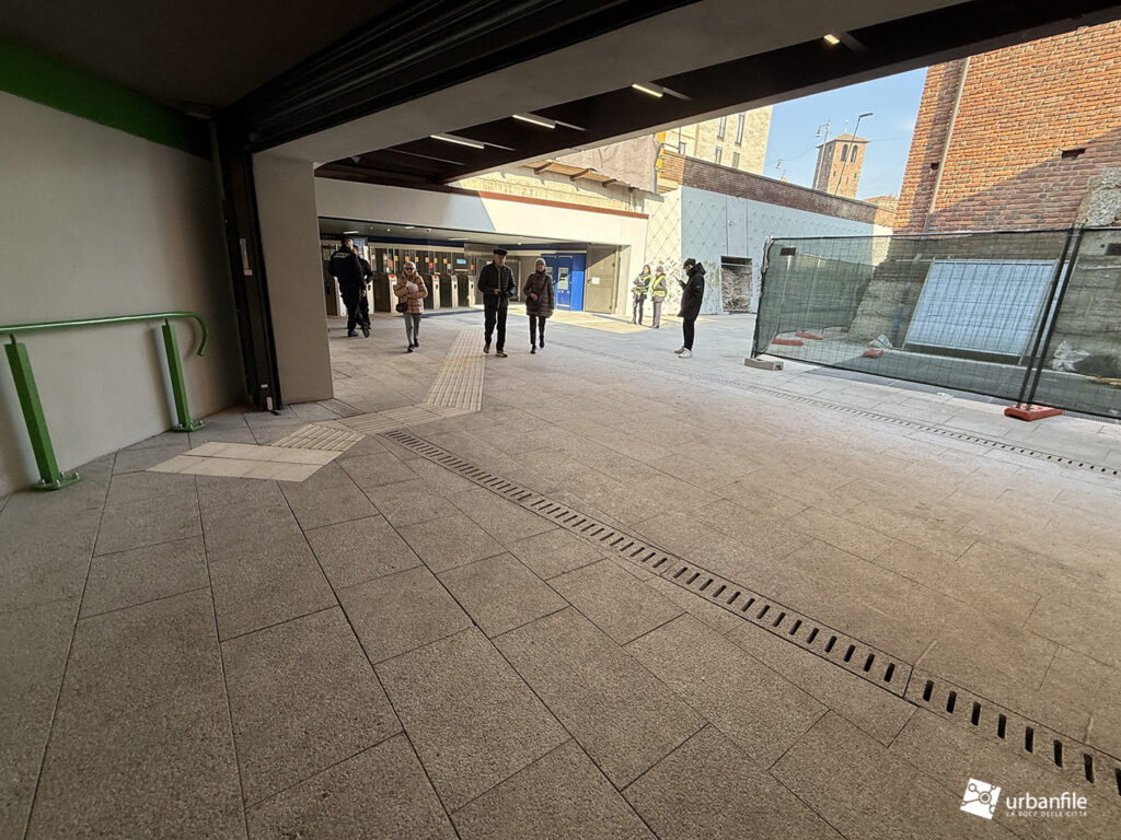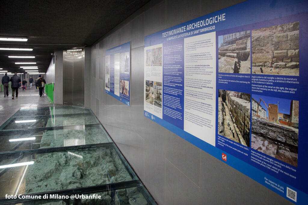 Questo nuovo passaggio consente finalmente di cambiare linea attraverso un percorso coperto, attraversando il “cortile-fossato” della Pusterla di Sant’Ambrogio. Durante gli scavi per la realizzazione del tunnel, nel 2023, sotto via Giosuè Carducci – proprio di fronte all’antica pusterla (restaurata e parzialmente ricostruita nel 1939) – è stato rinvenuto un tratto del muro d’argine del Naviglio di San Gerolamo, un reperto medievale rimasto sepolto per secoli.