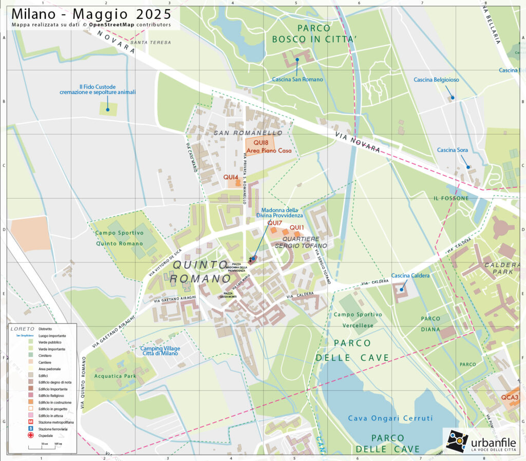 - Quinto Romano è perimetrato dal Parco Agricolo Sud e collega il Parco delle Cave con quello del Bosco in città. Tale connessione deve essere consolidata nel suo innesto su via San Romanello, creando uno spazio permeabile e alberato davanti agli edifici.