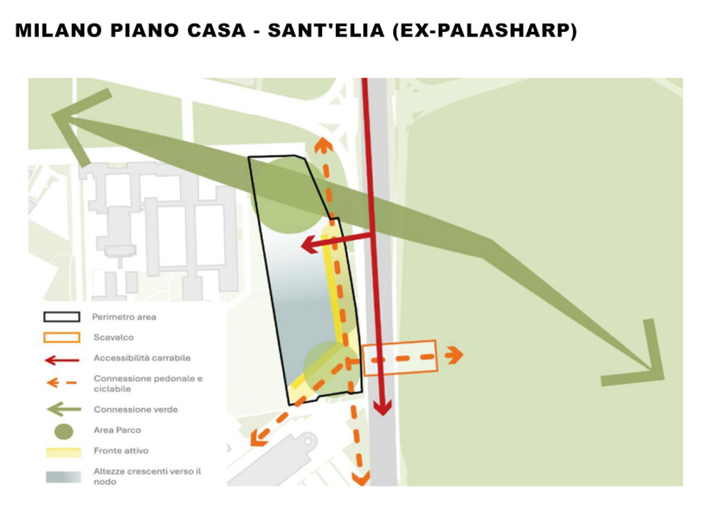 - Il progetto deve consolidare le connessioni ciclo-pedonali esistenti lungo via Sant’Elia e integrarne di nuove, tra cui uno scavalco diretto al parco Monte Stella da localizzarsi preferibilmente nella porzione sud dell’ambito. Necessaria anche una riflessione sul rapporto con l’area di interscambio di Lampugnano agevolando l’accesso pedonale e ciclabile diretto alla fermata della metropolitana e alla stazione degli autobus.