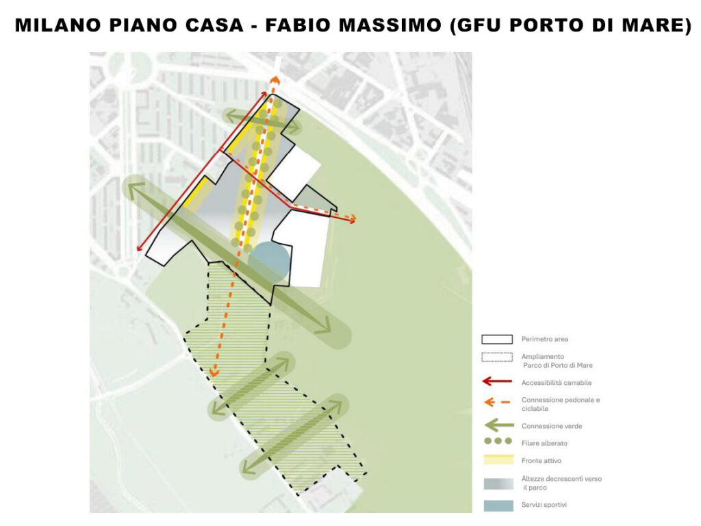 - L’intervento deve prevedere ampi percorsi, arricchiti da filari alberati, spazi naturali urbani e corridoi di biodiversità, per favorire la rinaturalizzazione dell’area e migliorare la permeabilità dei terreni, rafforzando il collegamento con la rete verde cittadina. La proposta progettuale deve prevedere anche la riqualificazione delle aree poste lungo via San Dionigi la cui destinazione dovrà essere la sistemazione a verde pubblico, in adiacenza al parco Porto di Mare e in connessione con il parco Vettabbia.