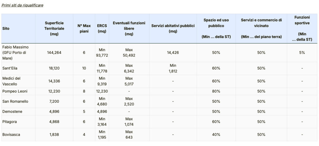 Nella prima fase, il Comune mette a disposizione circa 300mila mq di aree a valore simbolico o cedendo il diritto di superficie, dando avvio a un modello attuativo innovativo e a una nuova metodologia di collaborazione con il settore privato. In base all’accessibilità ai servizi e al trasporto pubblico, all’impatto ambientale degli interventi e alla ricaduta positiva che un’operazione del genere può avere sui quartieri, sono stati individuati in questa fase 21 siti: