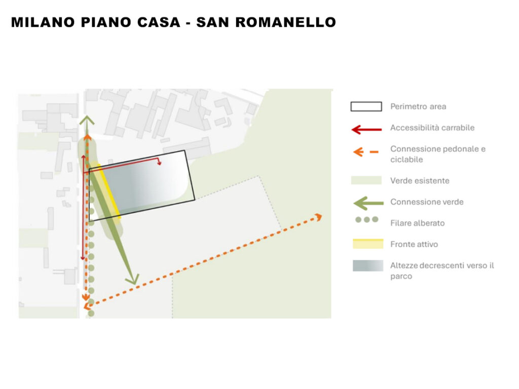 - Le altezze dei nuovi fabbricati devono essere decrescenti verso il parco, mentre lungo l’asse pubblico di via San Romanello si deve creare un fronte attivo a presidio e a servizio del quartiere.