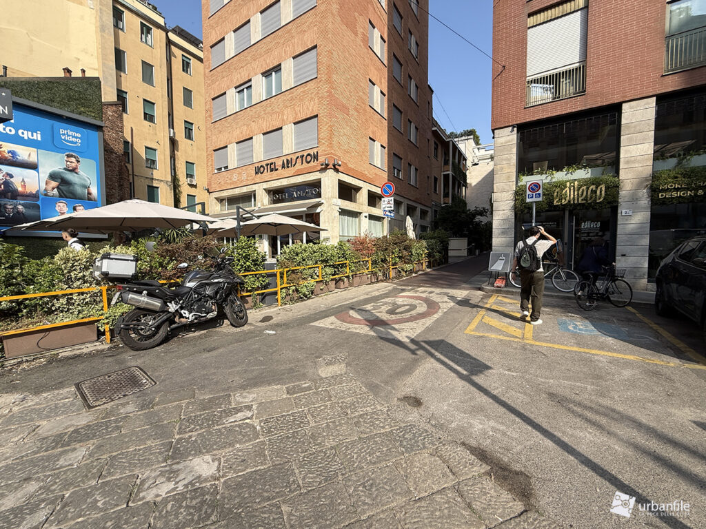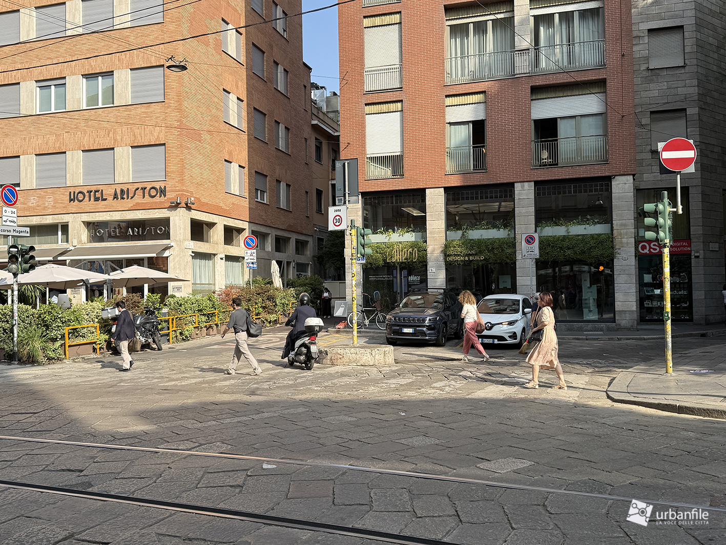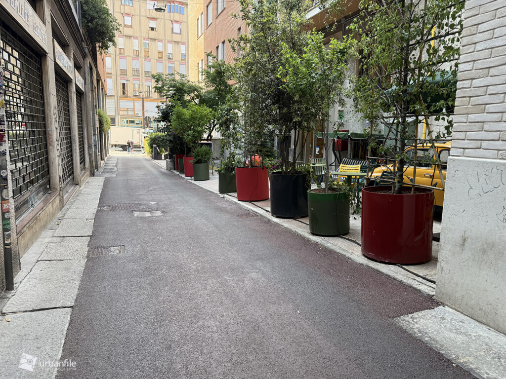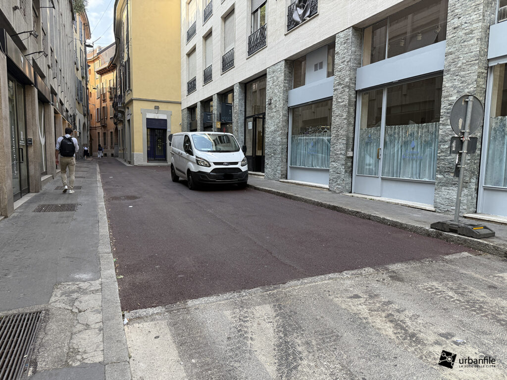 Ma prima di addentrarci in questo cambiamento, soffermiamoci un momento sull’arredo urbano in largo Carrobbio prima di entrare in via Medici: qui i masselli del pavé di via Torino lasciano spazio a un asfalto che cola per unirsi poi alla nuova pavimentazione rossiccia della via Medici.