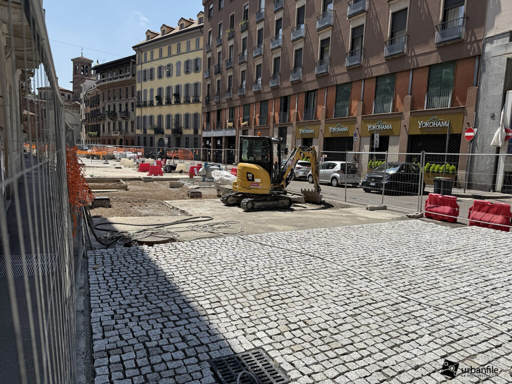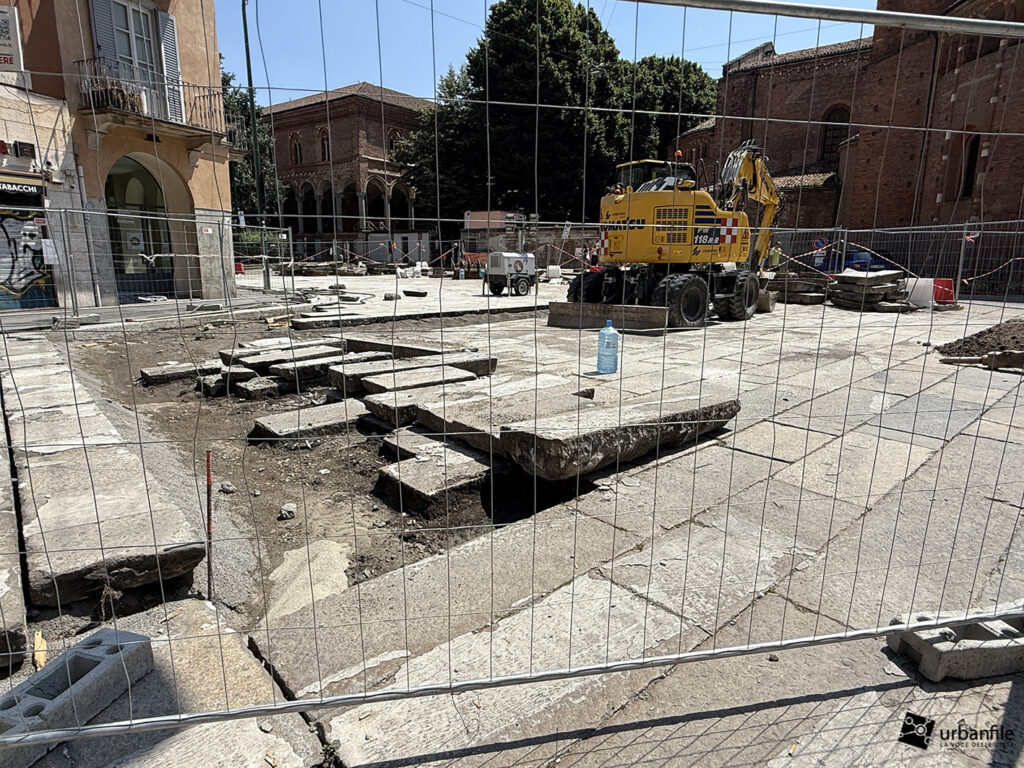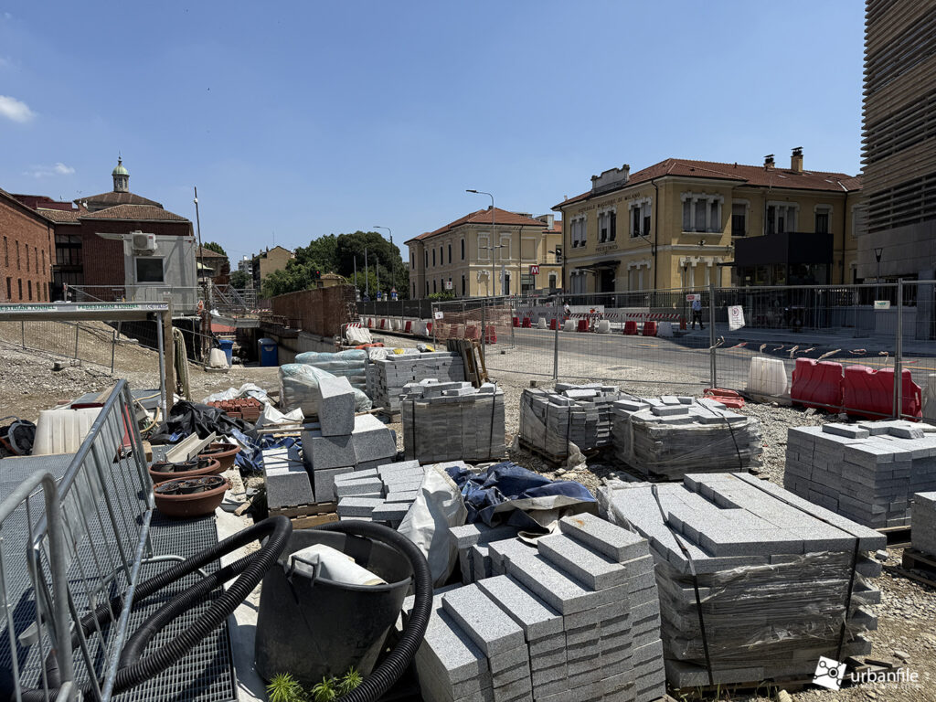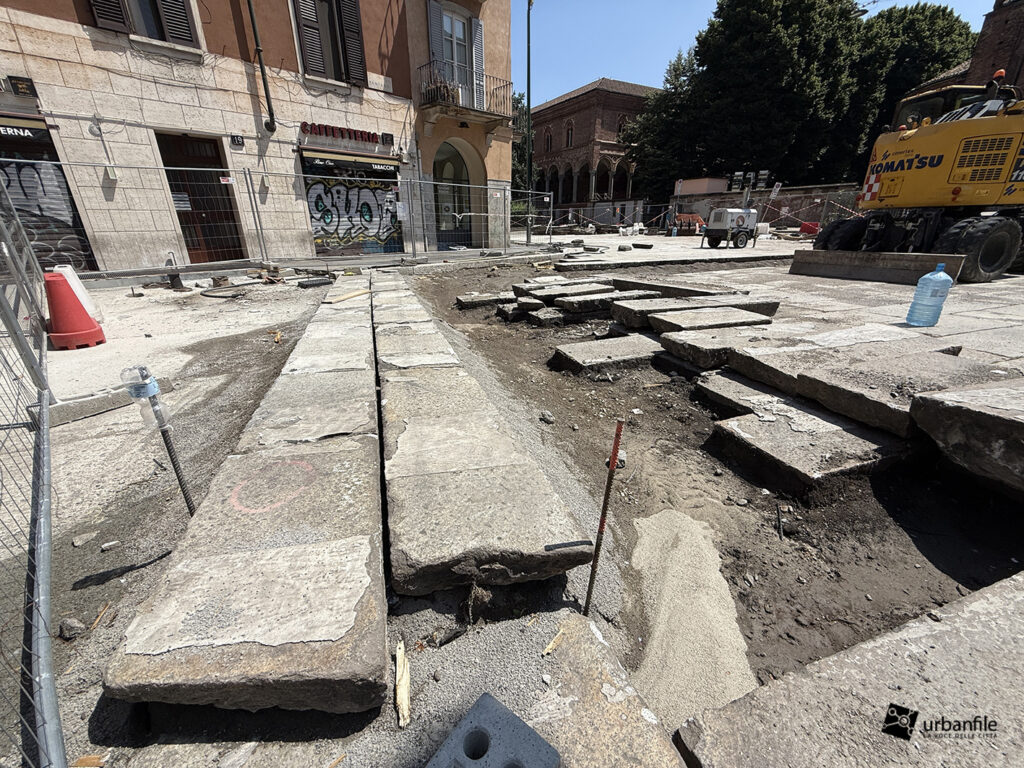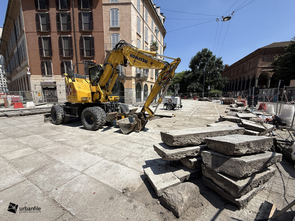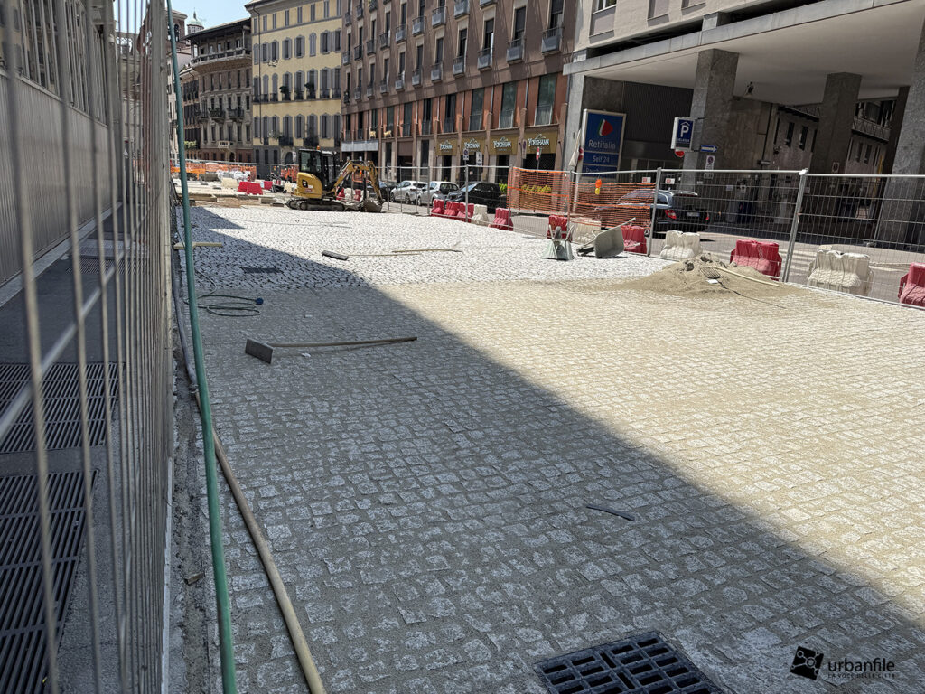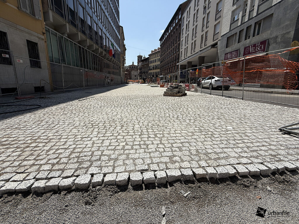 Eccoci in Largo Francesco Richini, dove proseguono i lavori per livellare e sistemare la pavimentazione già presente, in pietra.
