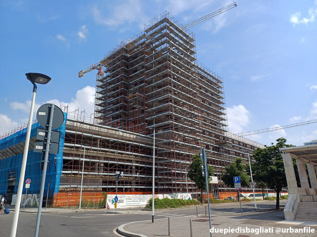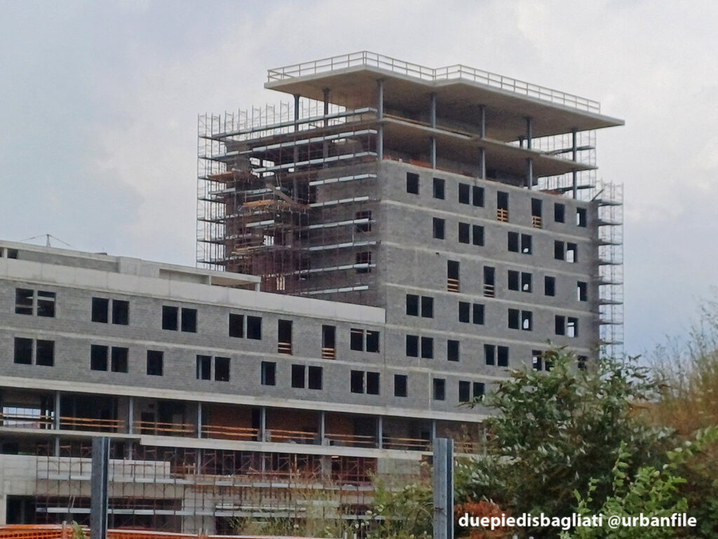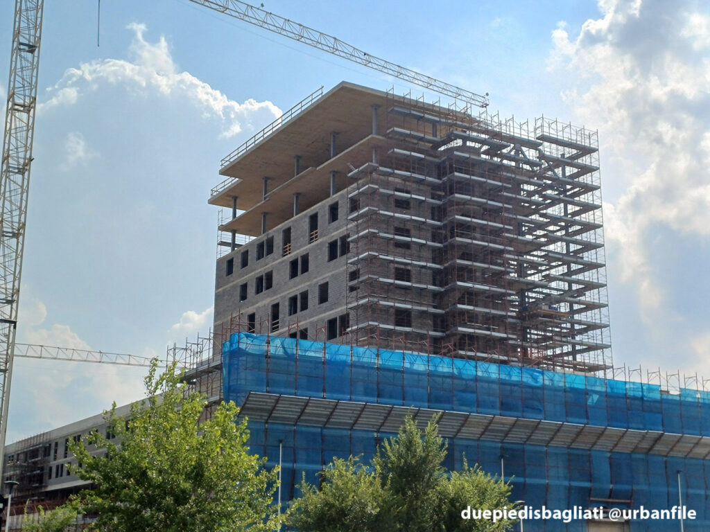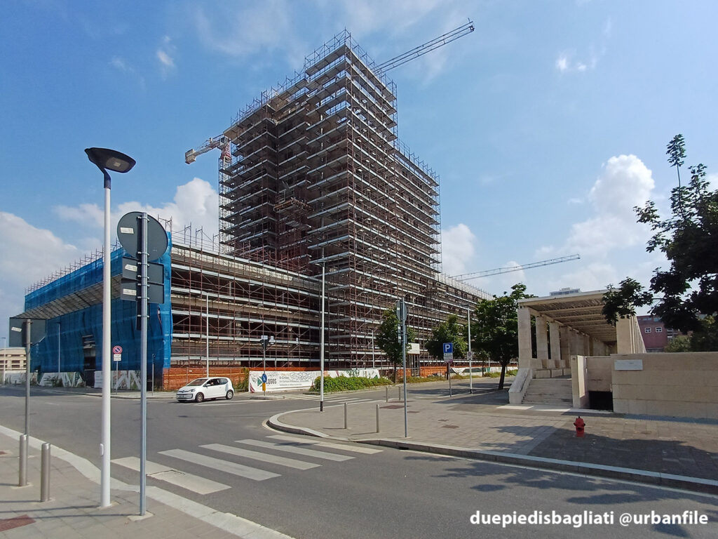 Cominciamo con tre foto del palazzo in costruzione scattate il 24 giugno scorso, dove è visibile la struttura “appesa” del corpo aggettante su via dell’Innovazione.