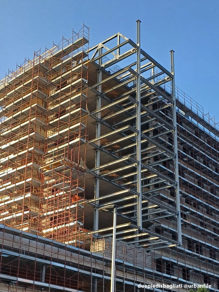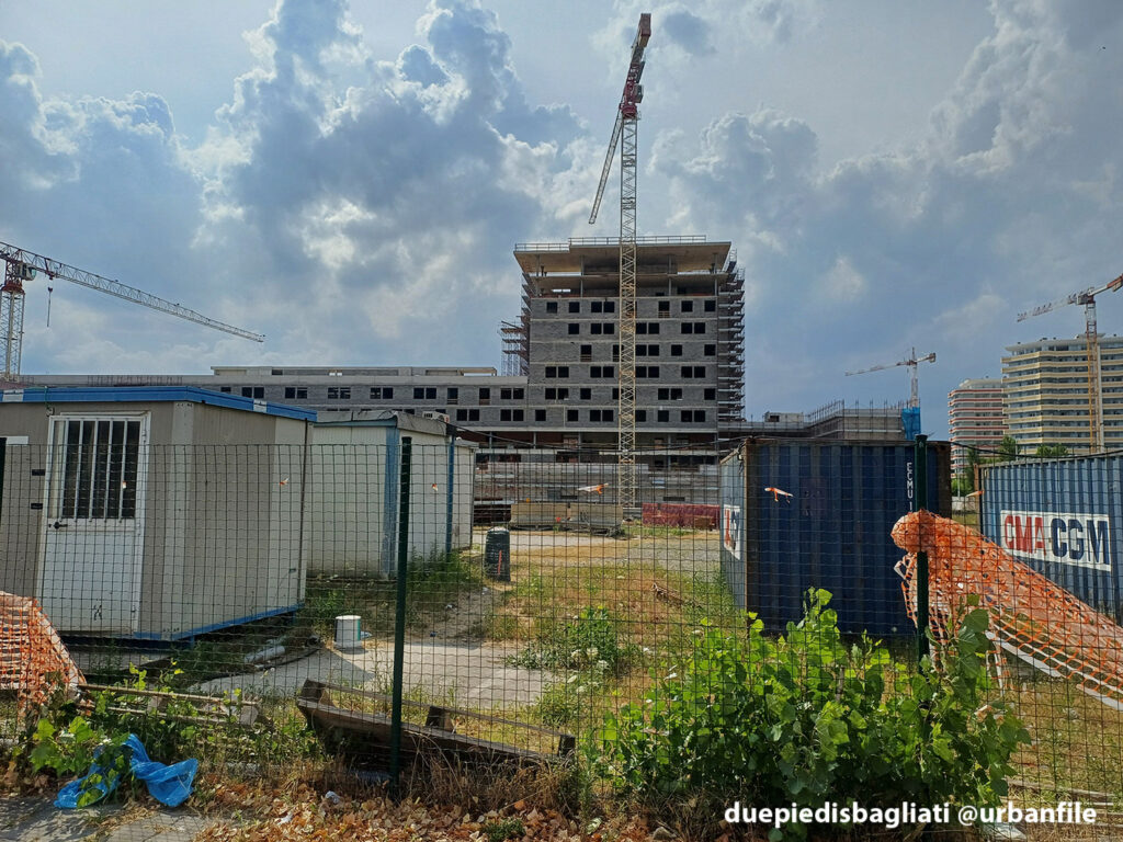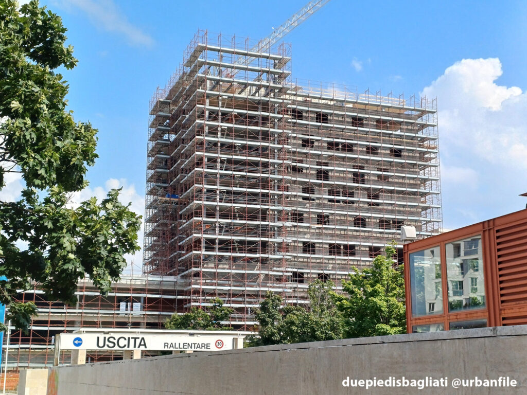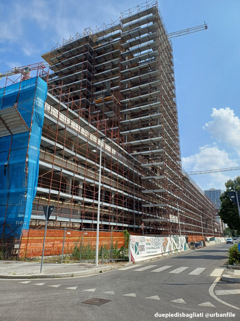 Cominciamo con tre foto del palazzo in costruzione scattate il 24 giugno scorso, dove è visibile la struttura “appesa” del corpo aggettante su via dell’Innovazione.