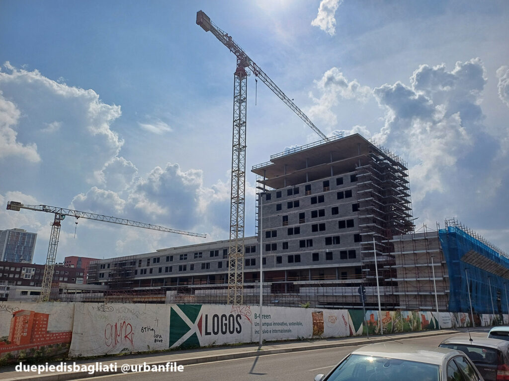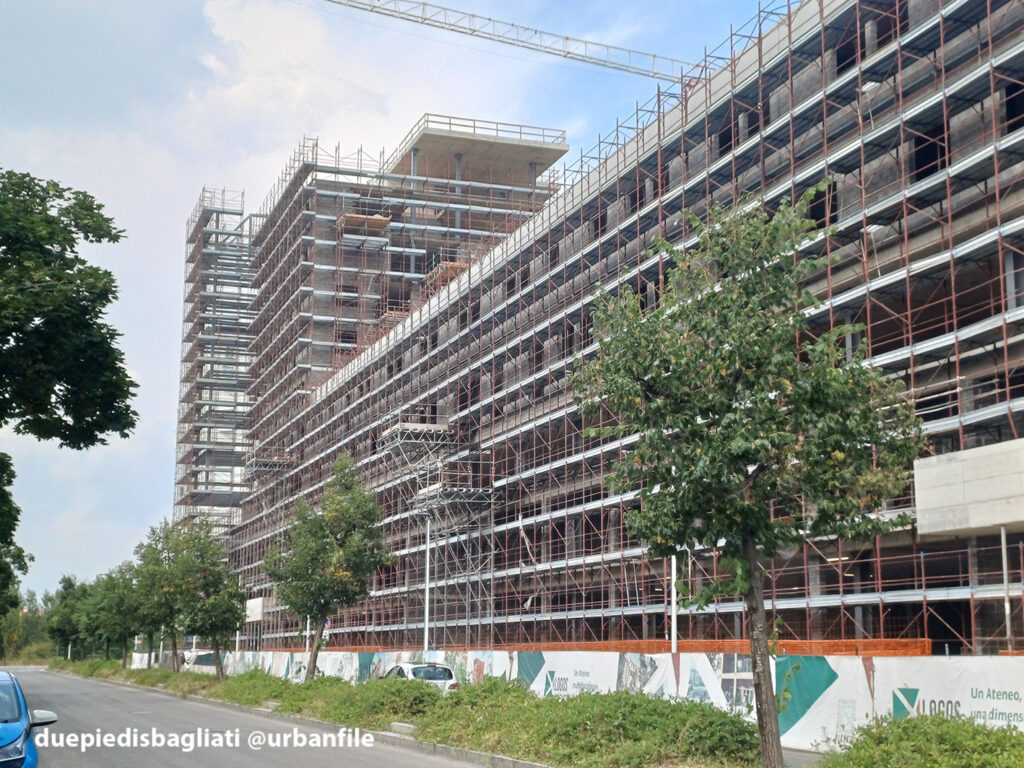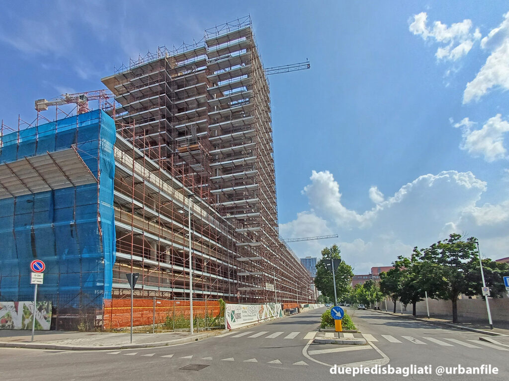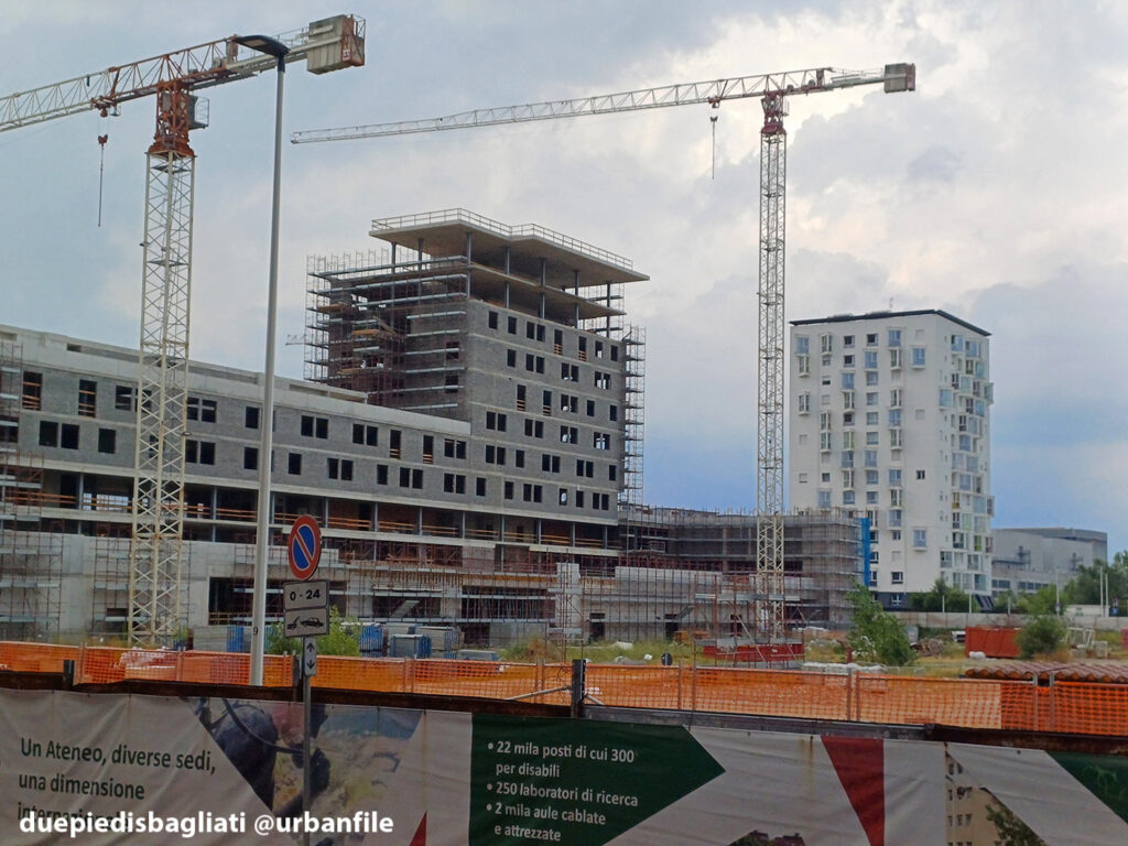 Si tratta del cantiere per l’Edificio U10 dell’Università degli Studi Milano Bicocca. Lo sviluppo edilizio per U10 prevede la realizzazione del nuovo palazzo che includerà una residenza universitaria con oltre 100 posti letto, spazi destinati all’insegnamento e alle attività di supporto del corpo docente e una dotazione complessiva di oltre 30 aule, laboratori informatici e aule studio a servizio di circa 4.500 studenti, oltre ad un’ampia area di verde attrezzato verso via Sesto San GIovanni e la ferrovia. Progetto del 2014 di Logos – Gregotti Associati.