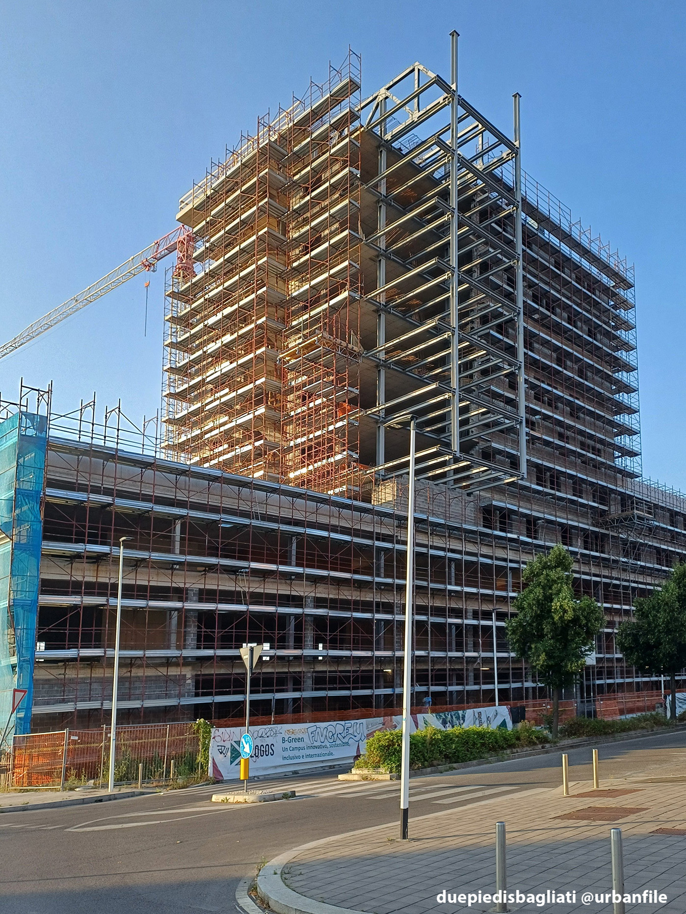 Era da febbraio che non vi aggiornavamo con nuove foto dal cantiere per i nuovi edifici universitari di Viale dell’Innovazione, tra via Stella Bianca e via Mario Fubini alla Bicocca. Cantiere rimasto fermo per alcuni anni, tanto che lo davamo spacciato ormai, perché le attività si erano interrotte bruscamente nell’aprile 2022 (nel mese di settembre 2022 il nostro ultimo aggiornamento prima della ripresa), ora ripreso a gran ritmo dalla scorsa estate.
