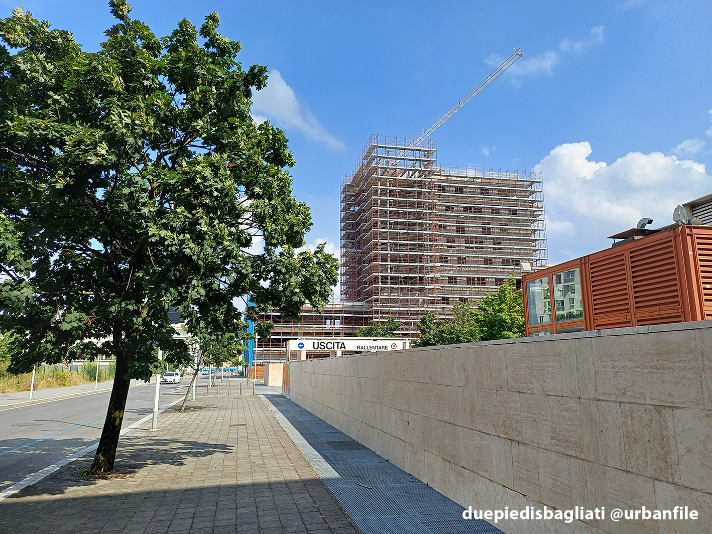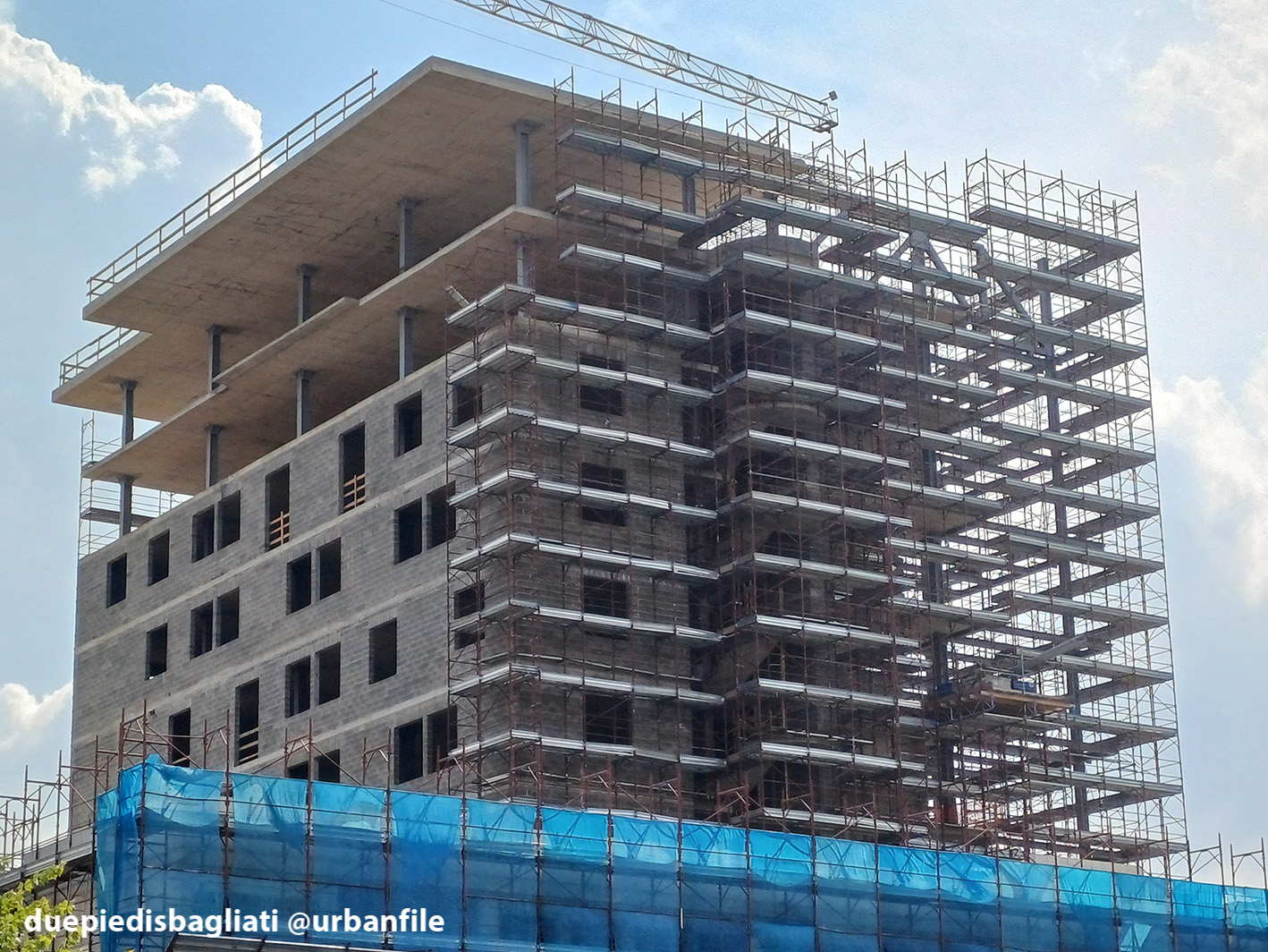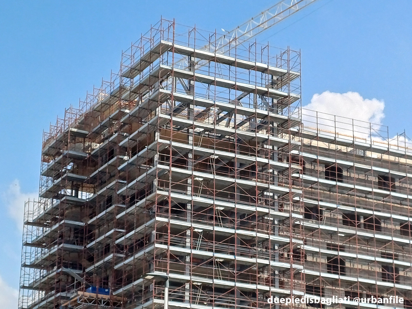 Cominciamo con tre foto del palazzo in costruzione scattate il 24 giugno scorso, dove è visibile la struttura “appesa” del corpo aggettante su via dell’Innovazione.