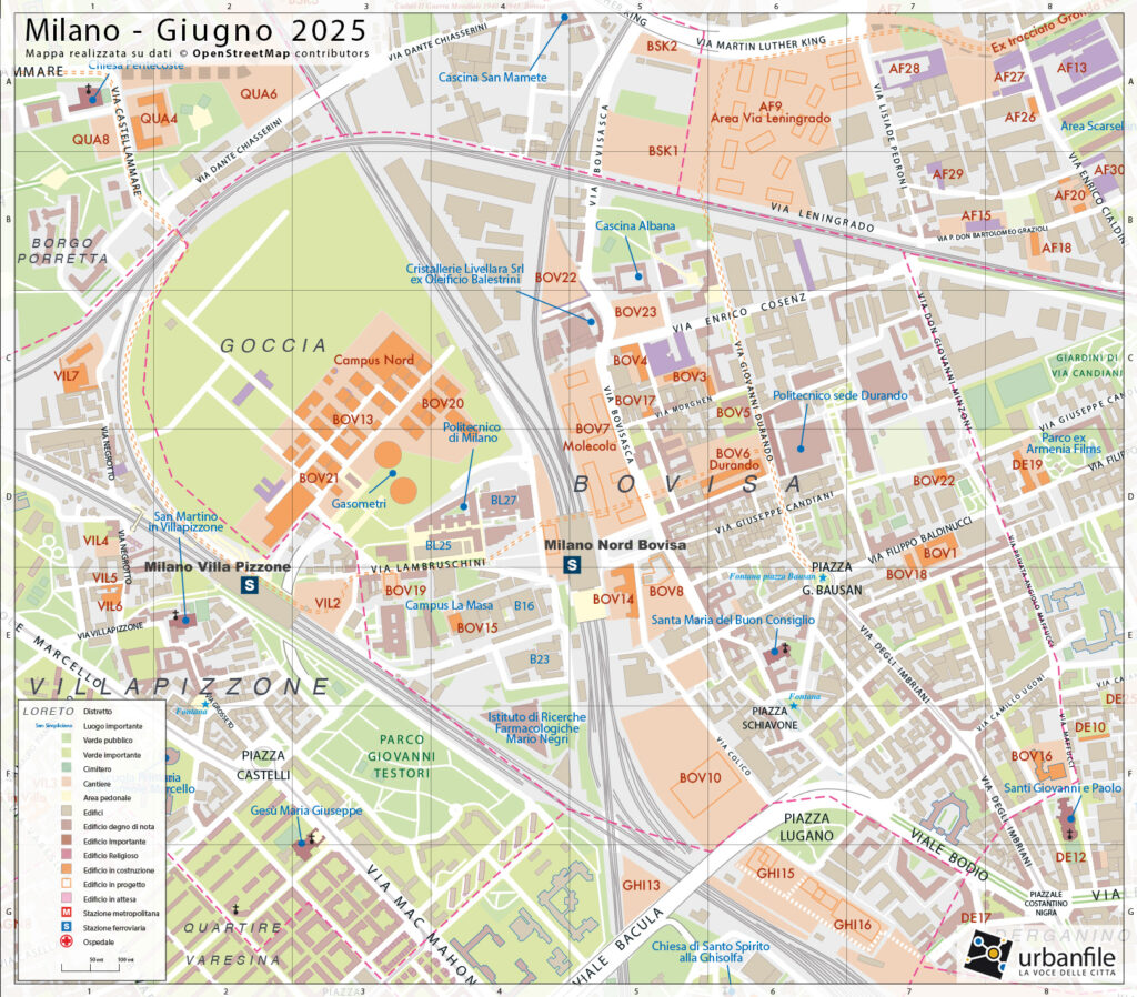 - Bovisa, via Arrivabene, PA Architettura, Borio Mangiarotti, Piazzale Lugano, Piazza Schiavone, via degli Imbriani, via Angelo del Bon, Politecnico di Milano, Goccia, Campus Politecnico, Renzo Piano Building Workshop: RPBW Architects, Studentato, Beretta Associati, via Bellagio, piazza Alfieri