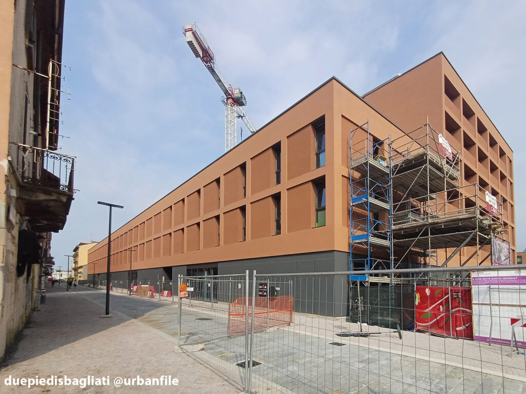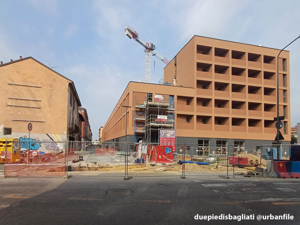 Il palazzo d’angolo con via Andreoli ormai ha preso forma ed è giunto al tetto da settimane. Il progetto architettonico è stato disegnato da GaS Studio.