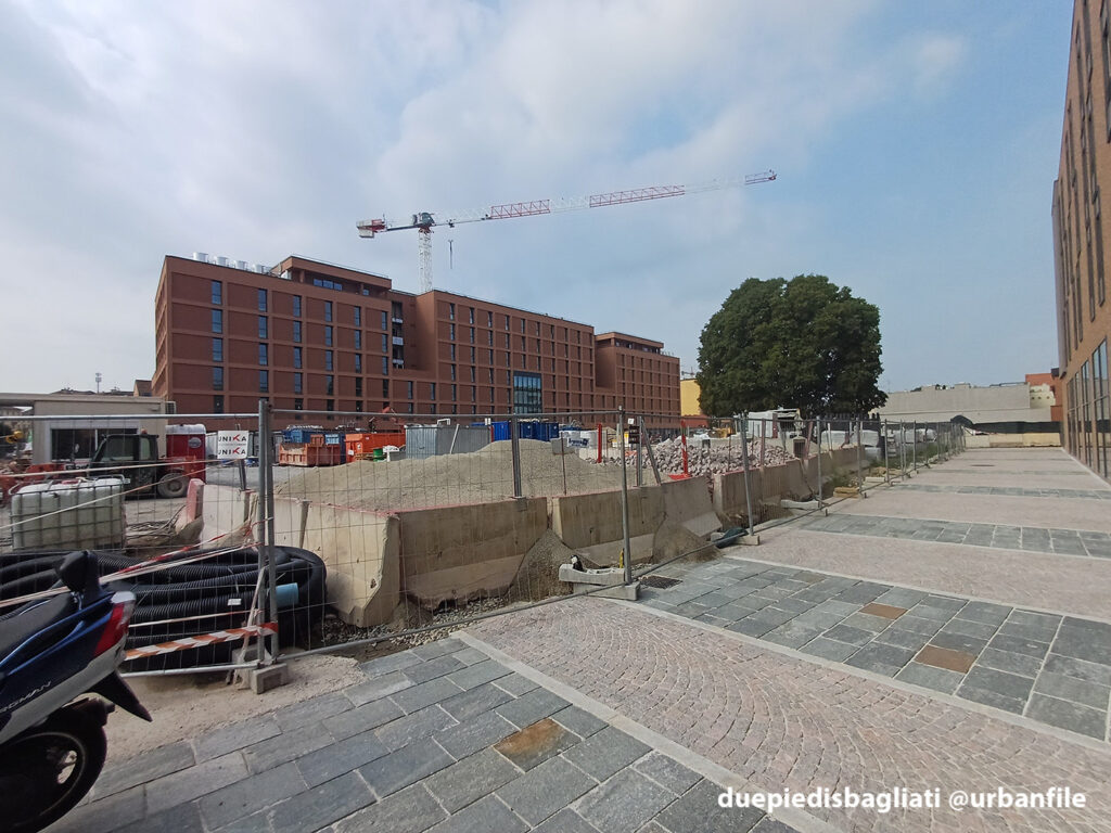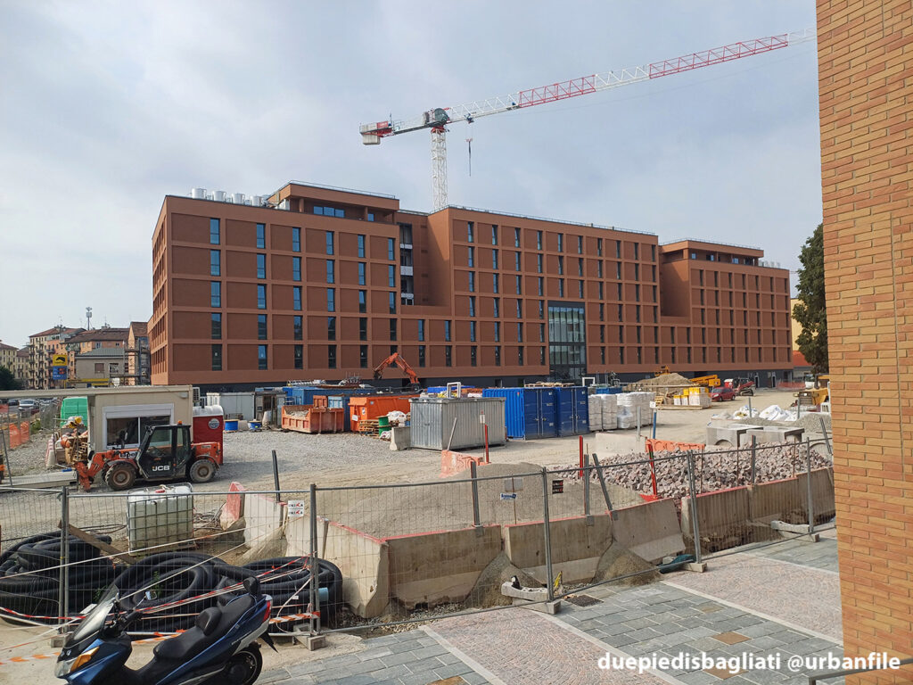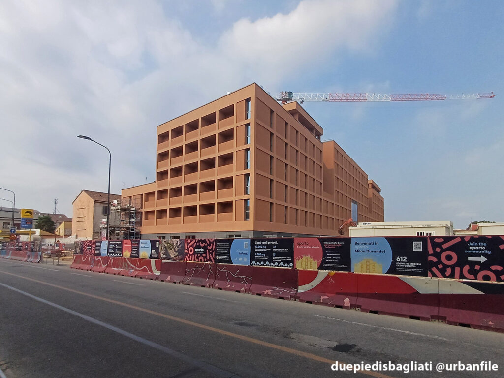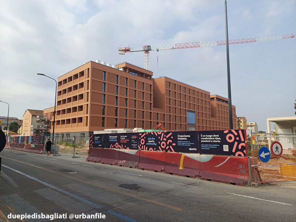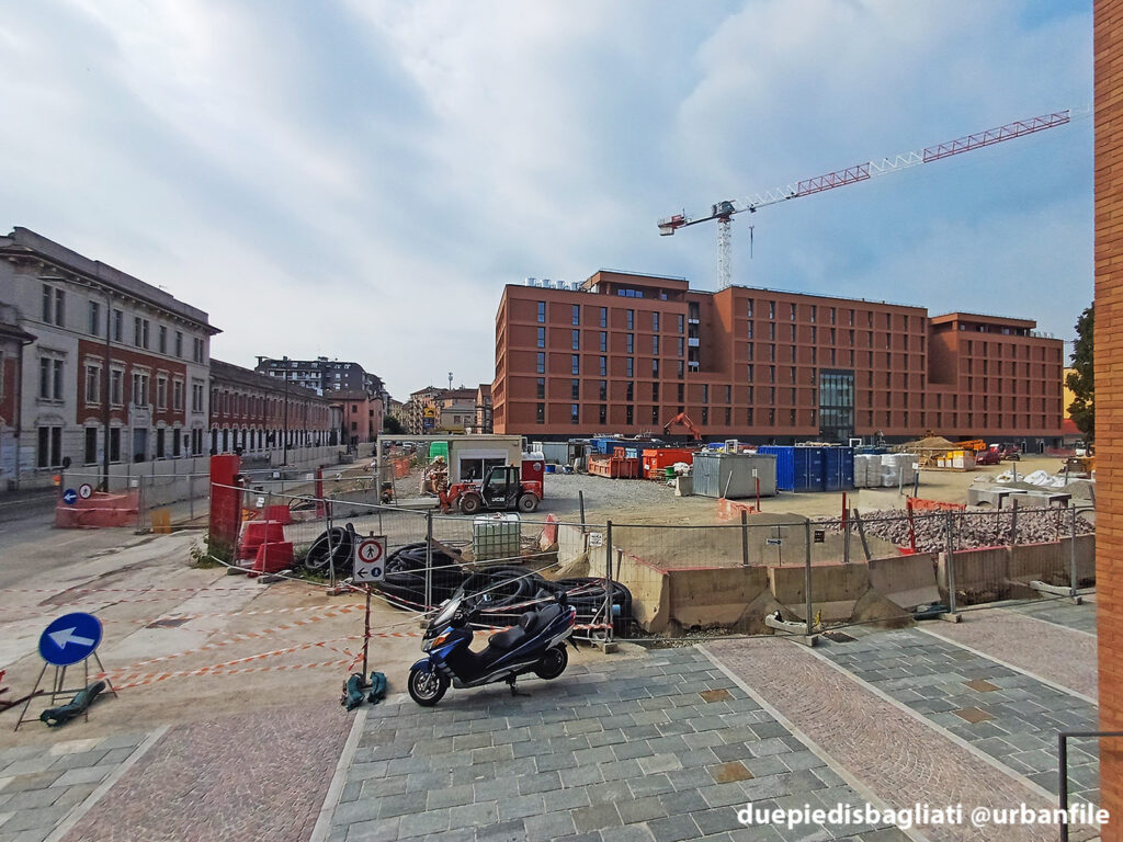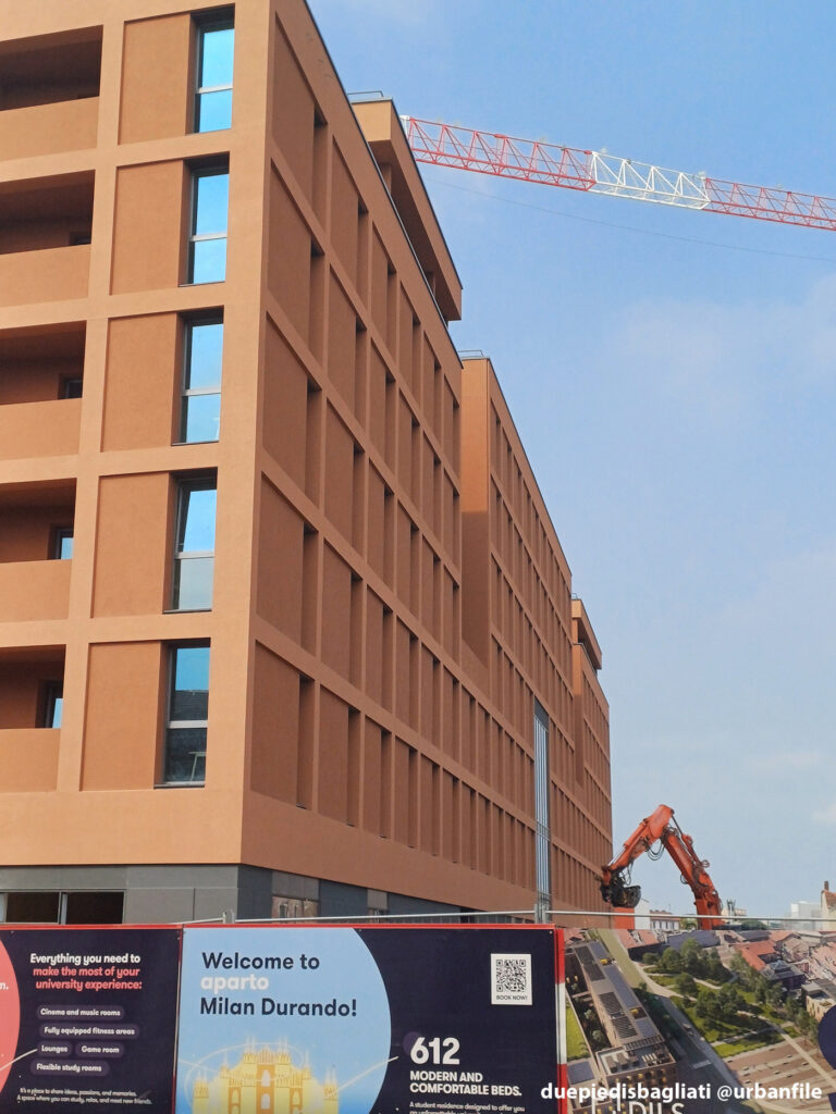 In via Durando sul lato dispari si trovano due grandi cantiere nell’area che diventerà una nuova e ampia piazza pubblica. Entrambi i progetti riguardano due studentati, quello che si trova sulla destra è stato già completato ed è già operativo come abbiamo visto nel mese di aprile: aparto Milan Durando.