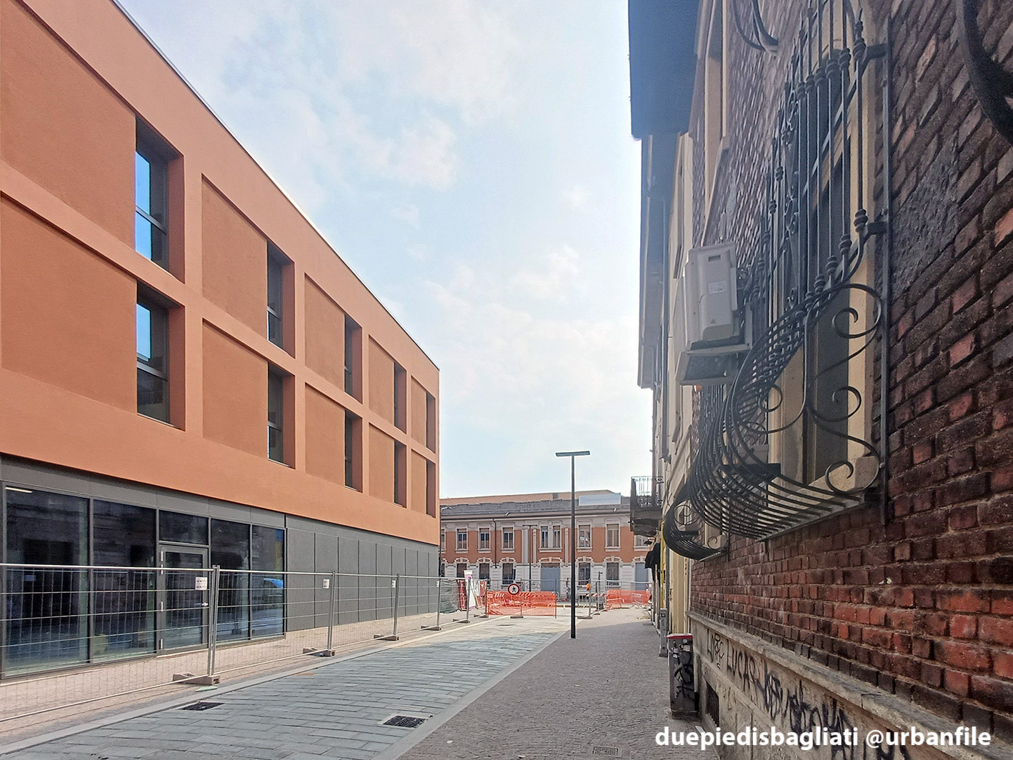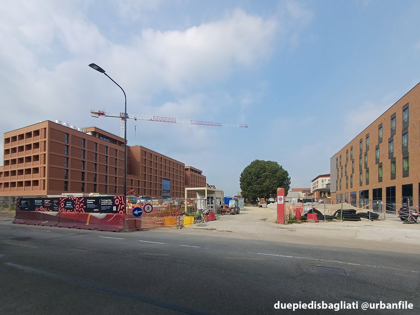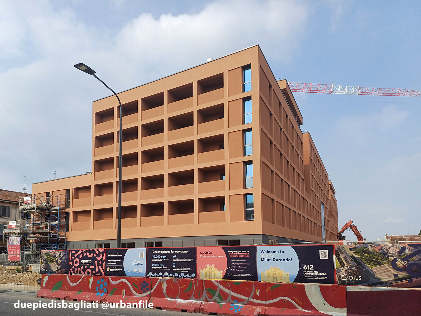 In via Durando sul lato dispari si trovano due grandi cantiere nell’area che diventerà una nuova e ampia piazza pubblica. Entrambi i progetti riguardano due studentati, quello che si trova sulla destra è stato già completato ed è già operativo come abbiamo visto nel mese di aprile: aparto Milan Durando.