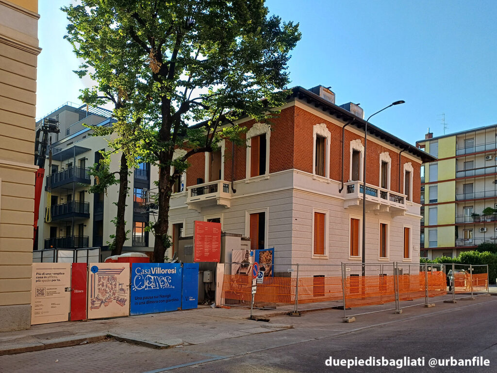 In Via Eugenio Villoresi, 13-15 (angolo Via Giovanni Pastorelli), a due passi dal Naviglio Grande, si trova il cantiere confinante, dove si trovava un edificio per uffici, costruito approssimativamente negli anni Ottanta e sorto dove si trovava lo stabilimento Isolabella, demolito completamente nell’aprile 2022. La proprietà (Hines – fondo: HEVF 2 – Hines European Value Fund 2), ha provveduto a riqualificare e trasformare il complesso realizzando un edificio residenziale con un bel progetto di DFA Partners che ha preservato e riqualificato la graziosa villa d’angolo dal gusto eclettico-liberty.