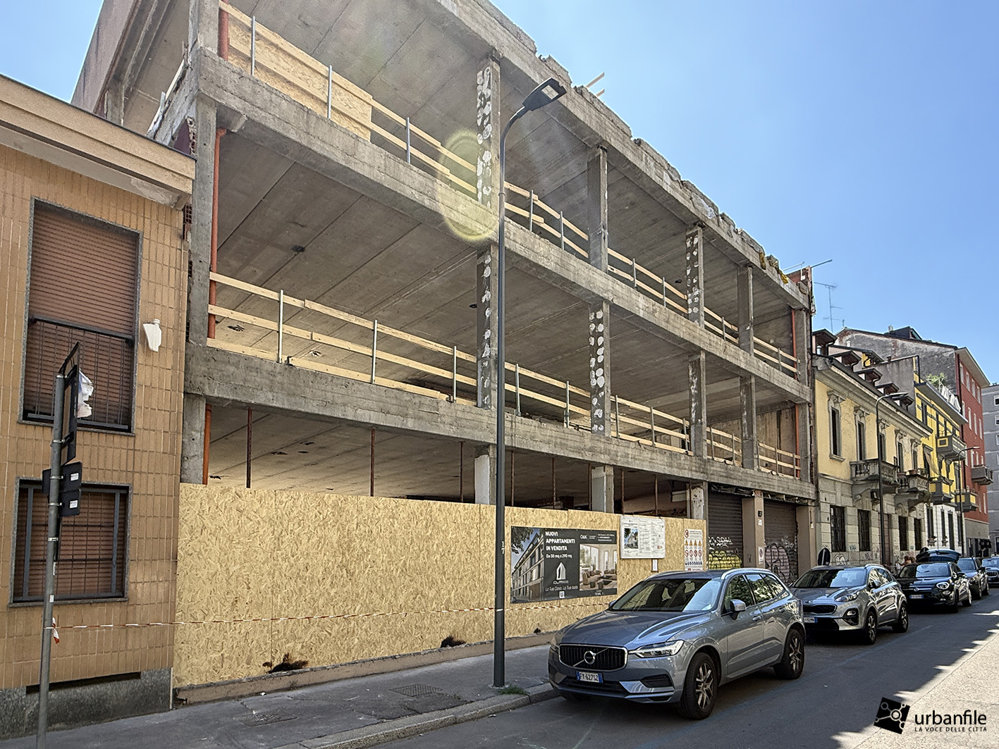 La scorsa primavera avevamo osservato la prova con pannelli da applicare alla facciata compromessa. Prove già rimosse. Ad ogni modo sono in corso i lavori per sistemare le facciate.