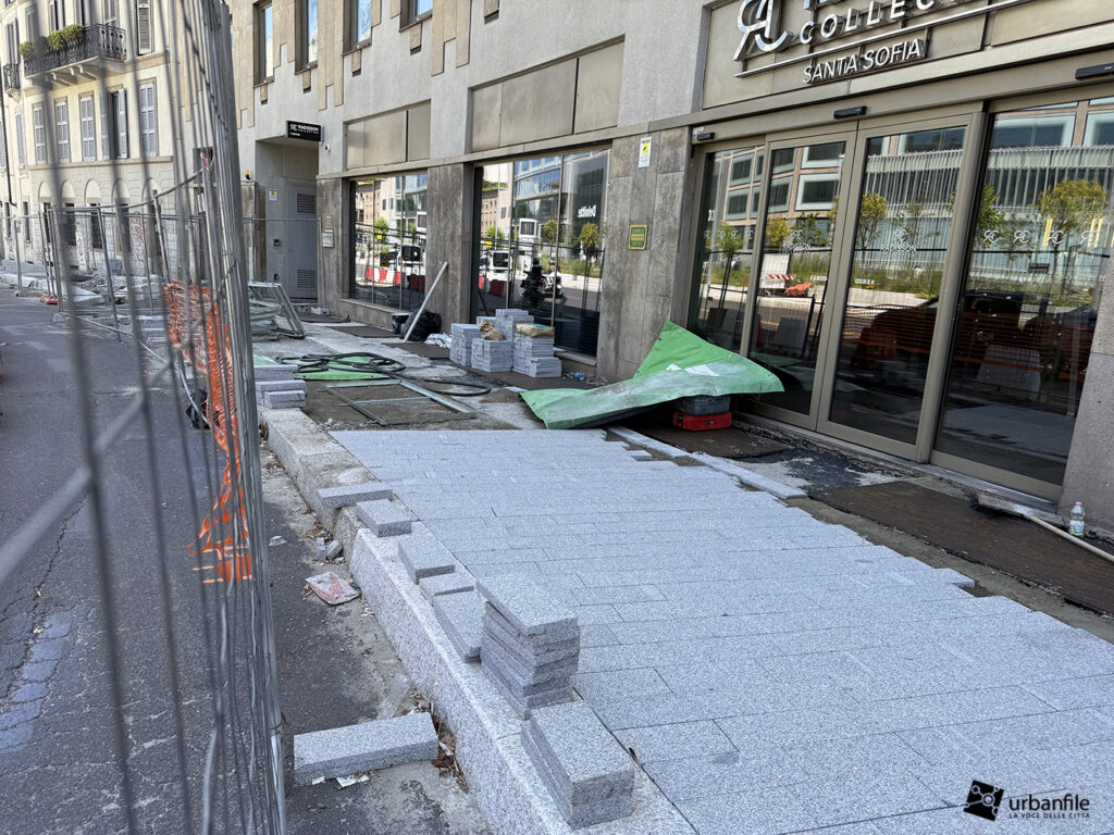 Il cantiere per la riqualificazione della via riguarda il marciapiede sul lato dispari, dove fra l’altro si trova il grazioso Istituto delle Suore di Carità con il Santuario di Maria Bambina (le cui facciate imbrattate fanno a gara con i peggiori parcheggi di periferia), oltre alla barocca chiesa di Santa Sofia che da il nome alla via. Il marciapiede dovrebbe essere completamente piastrellato in pietra da Corso Italia sino a via San Calimero (ma non abbiamo ancora conferme). Prosegue anche il completamento del settore prossimo all’incrocio con Corso di Porta Romana.
