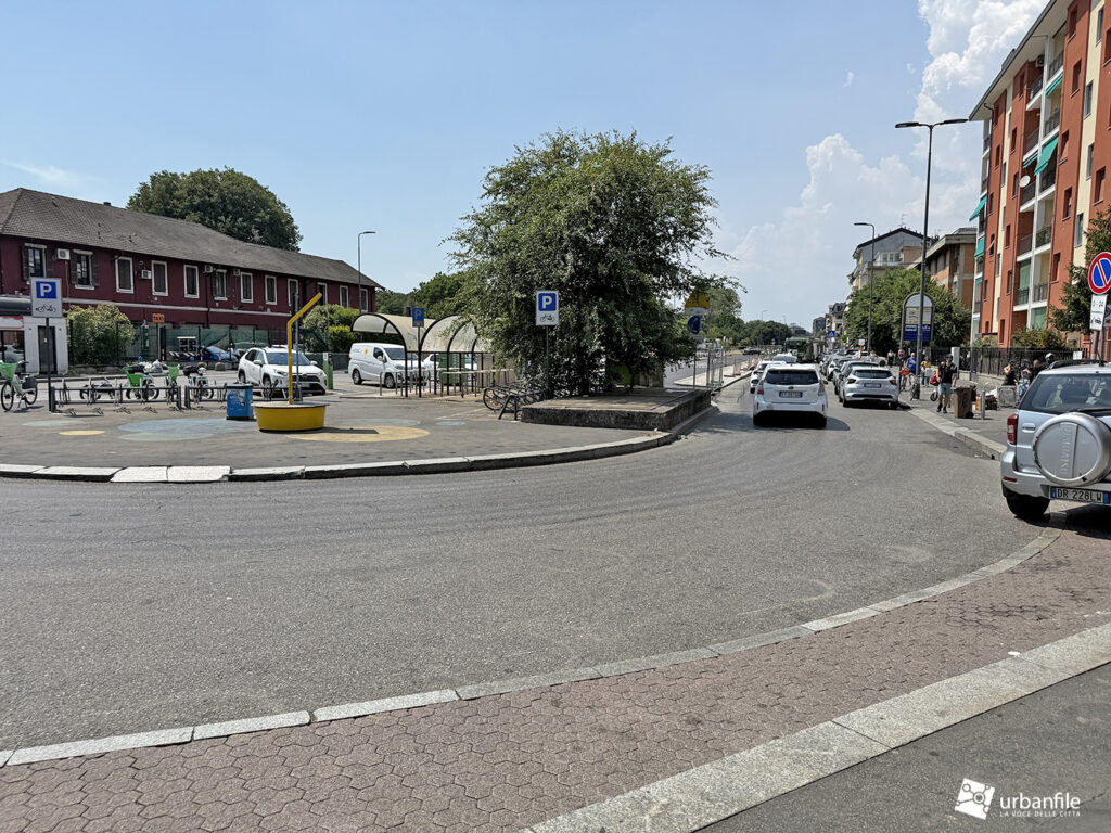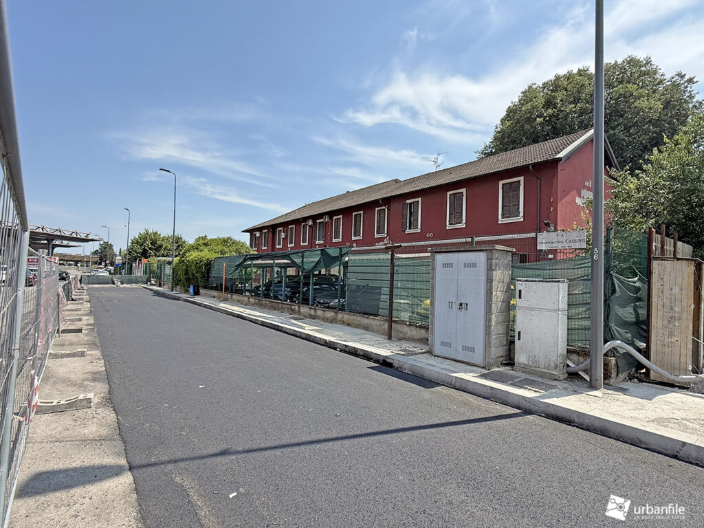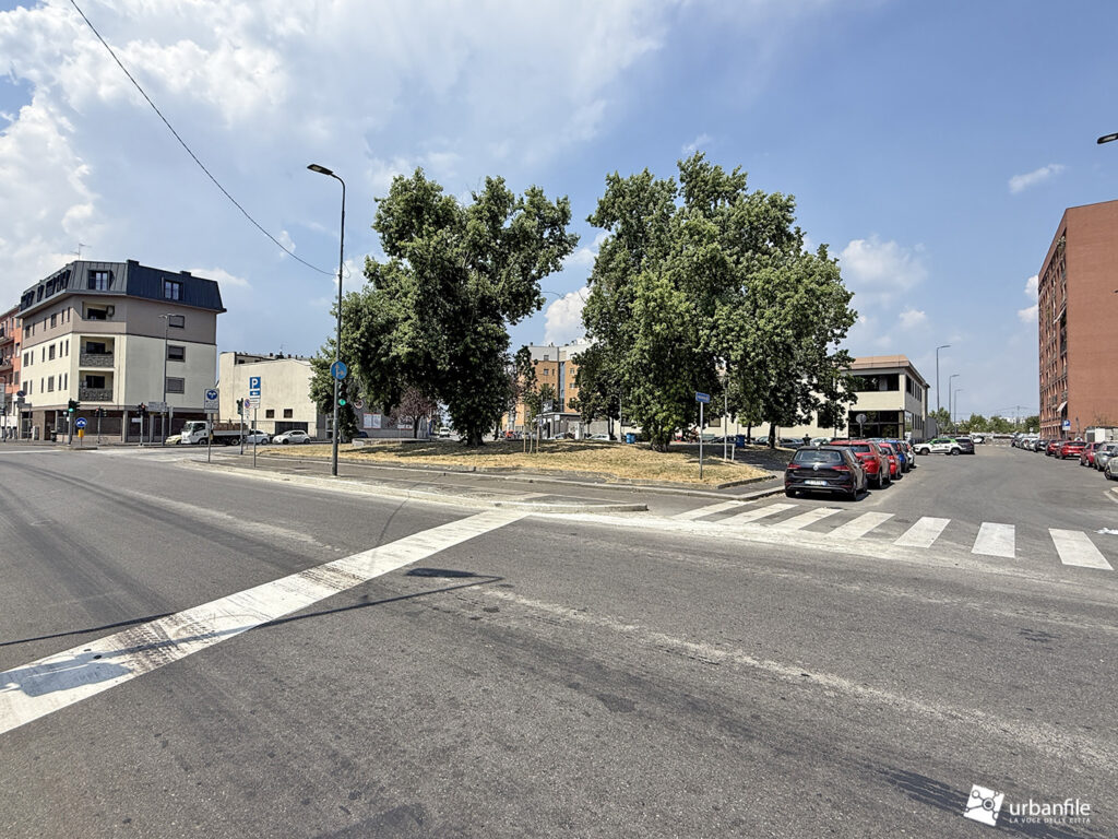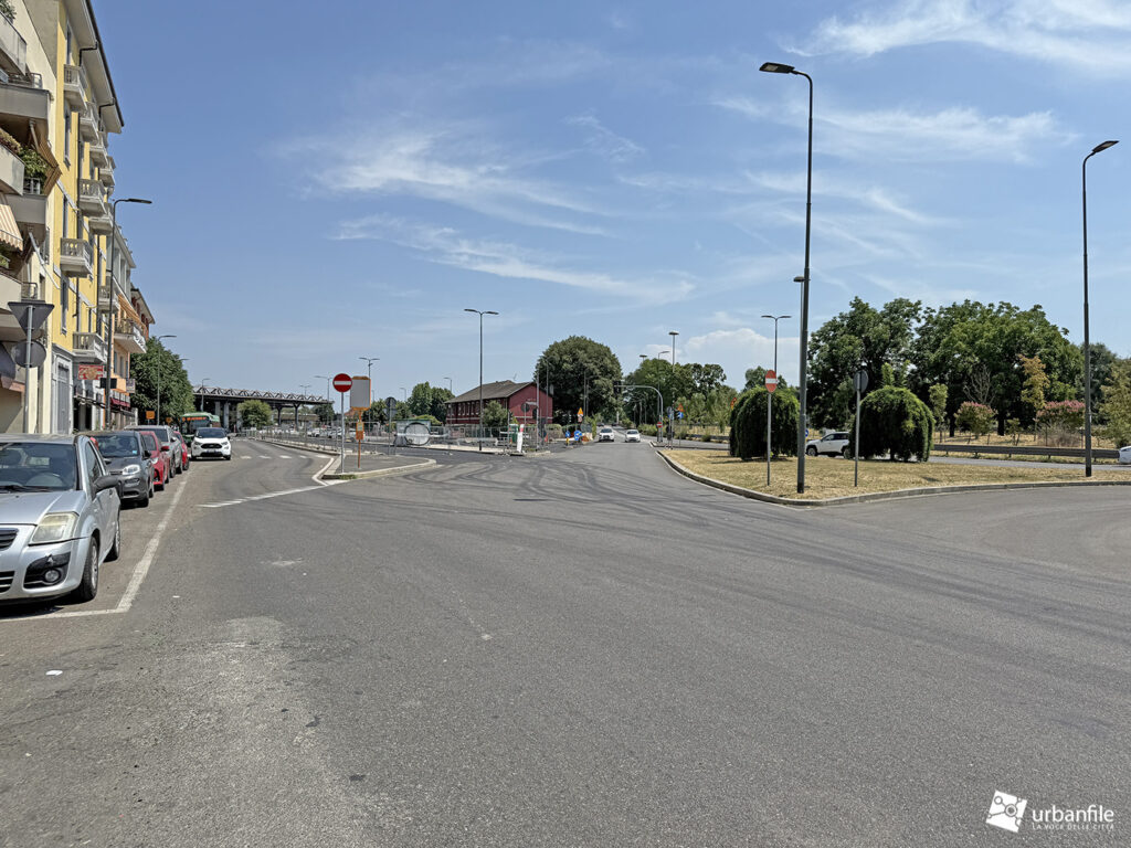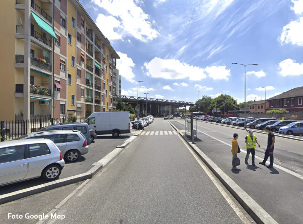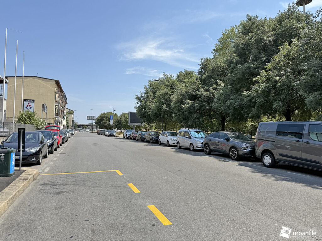 Oltre questo svincolo, via Cassinis si trasforma purtroppo in un’anonima distesa di asfalto: un grande piazzale-parcheggio lungo circa 150 metri e largo una quarantina, un tempo adibito nella parte centrale a capolinea degli autobus e area di sosta.