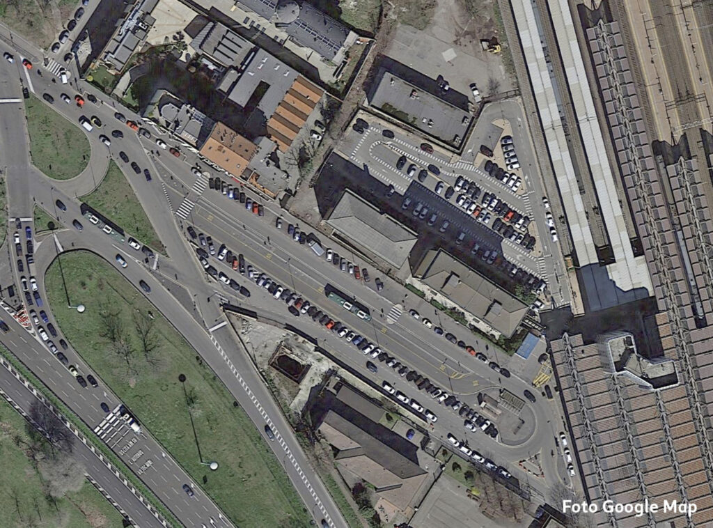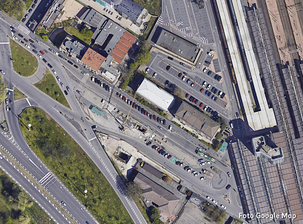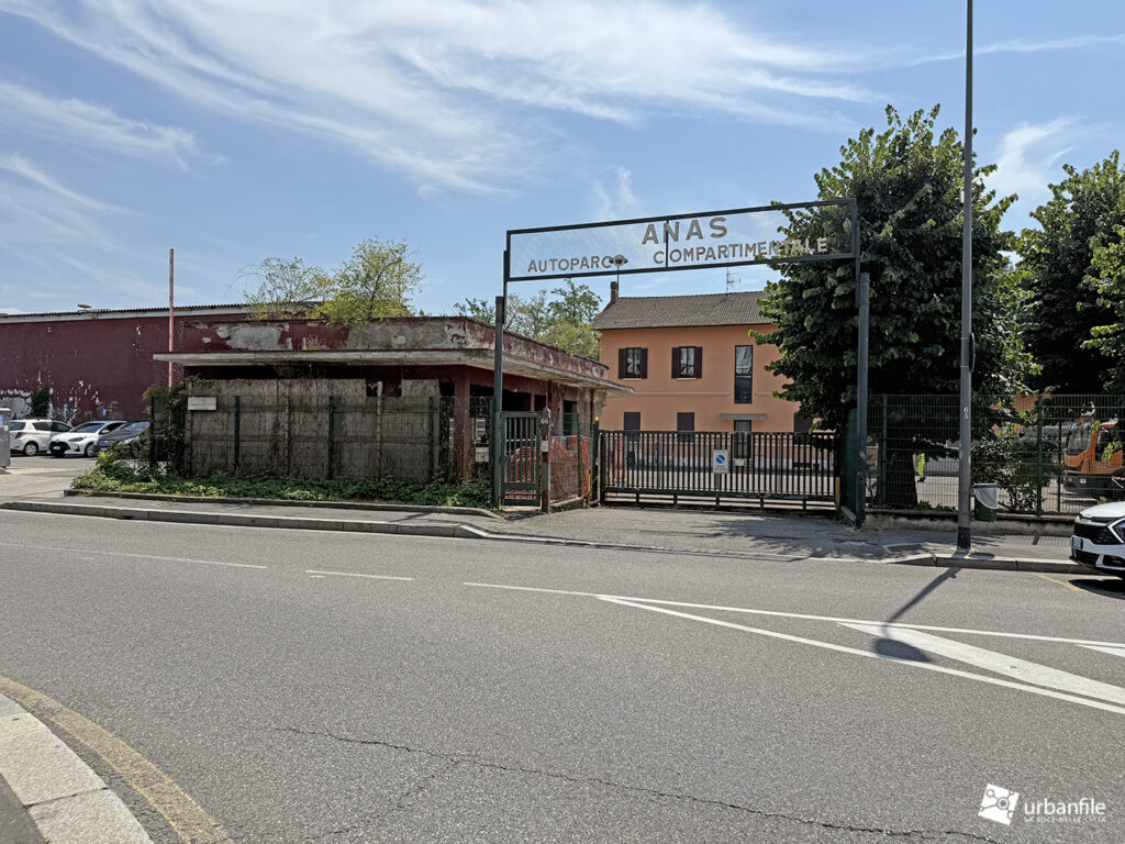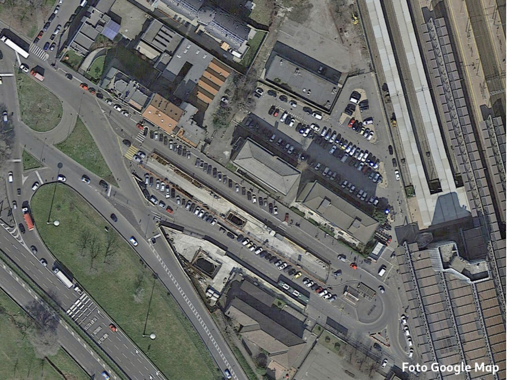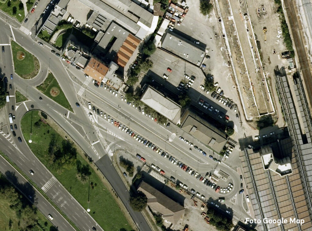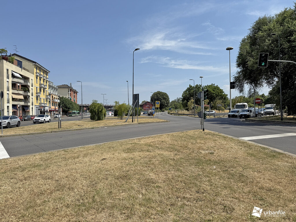 Oltre questo svincolo, via Cassinis si trasforma purtroppo in un’anonima distesa di asfalto: un grande piazzale-parcheggio lungo circa 150 metri e largo una quarantina, un tempo adibito nella parte centrale a capolinea degli autobus e area di sosta.