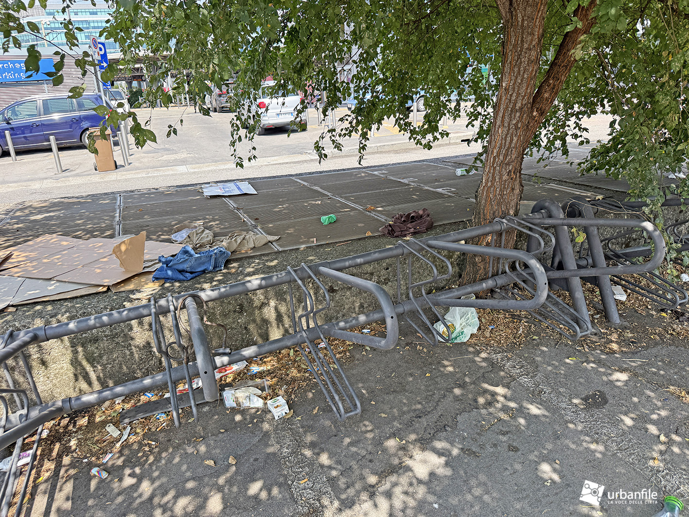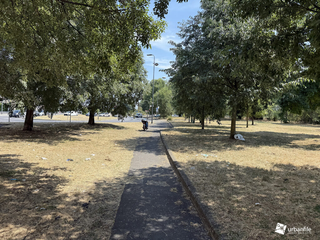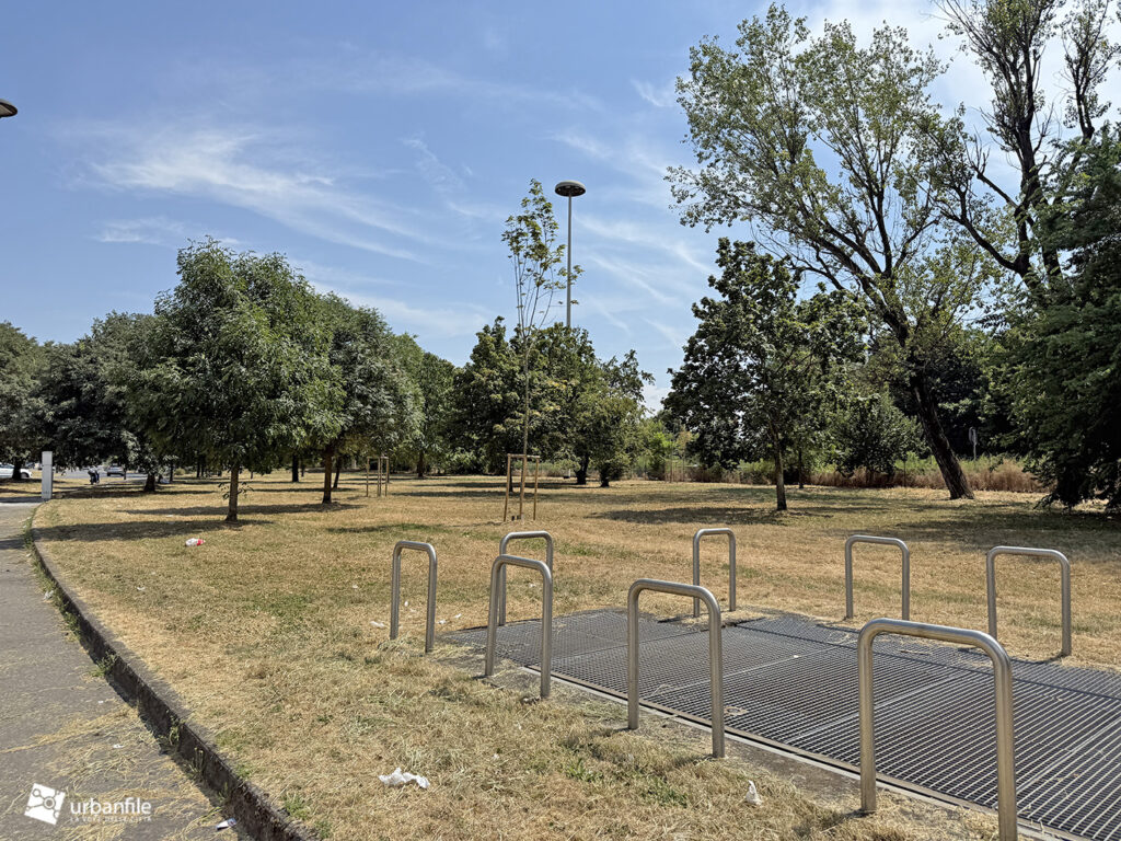 E ora ci si chiede: possibile che nessuno in Comune abbia mai pensato di piantare alberi lungo questo tratto? Percorrerlo durante le giornate estive è un’esperienza davvero faticosa. Quanto costerebbe davvero realizzare un filare alberato? Eppure, la natura ci prova da sola: la robinia, per esempio, cresce dove può, come nei pressi della rastrelliera per le biciclette (ma in che degrado versa quel punto?).