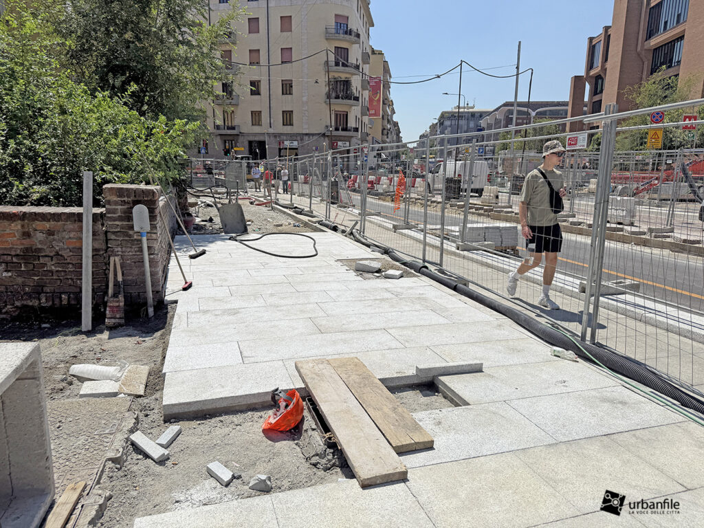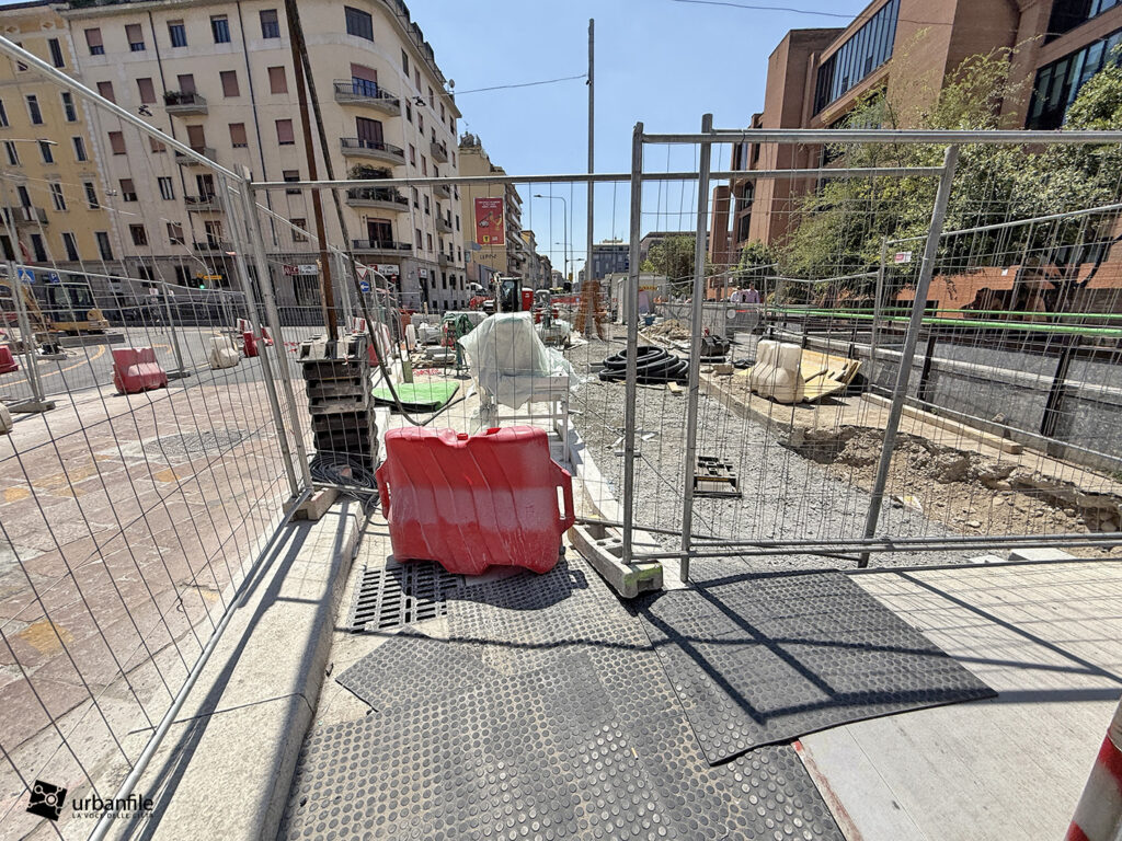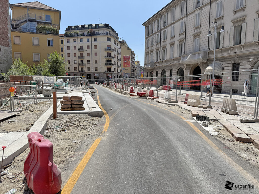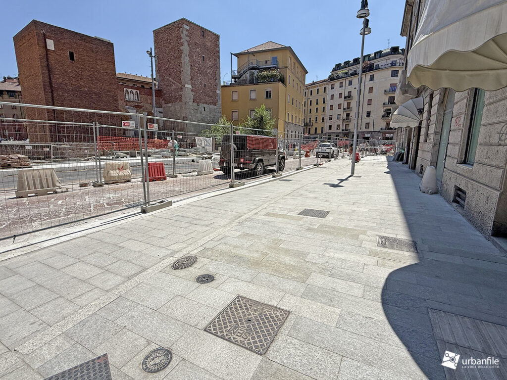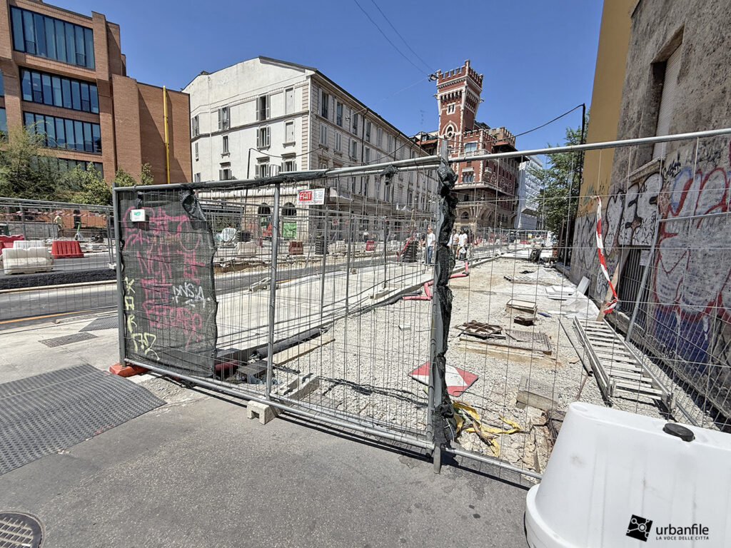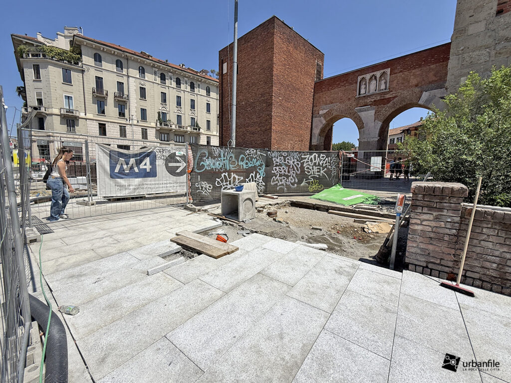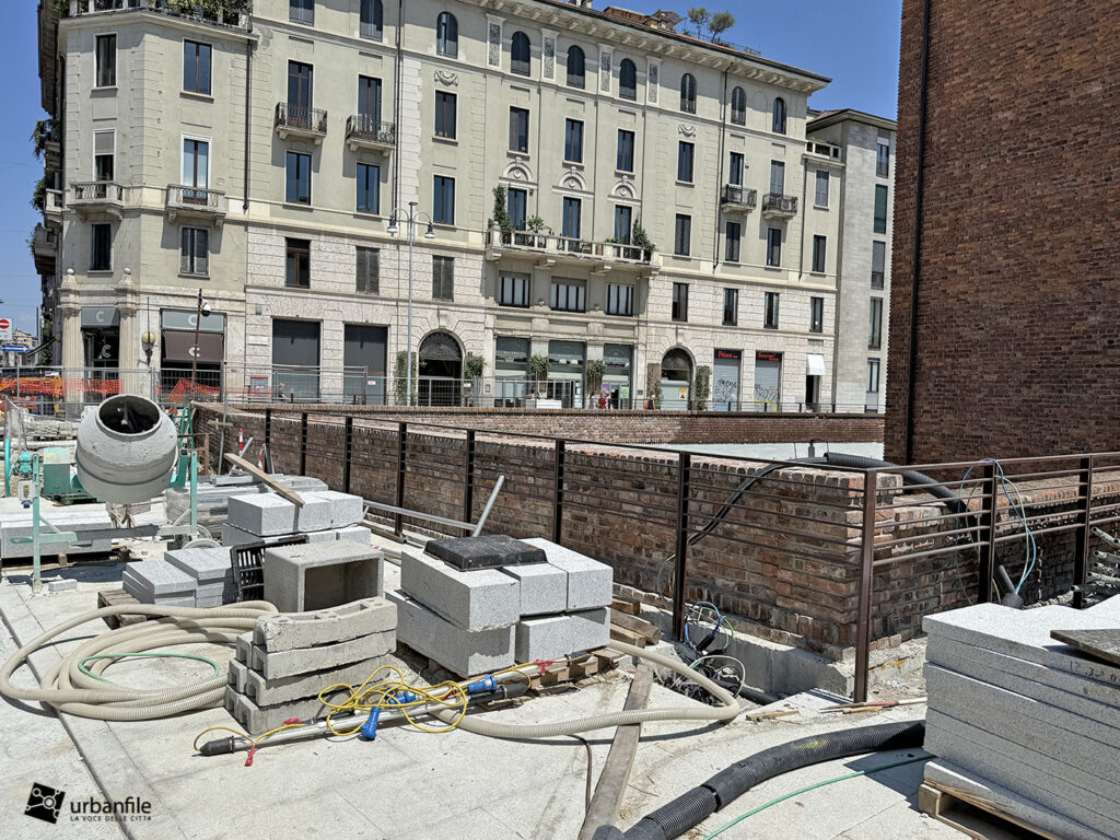 Aggiornamento fotografico di metà luglio dal cantiere per il ripristino in superficie delle aree interessate ai lavori per la costruzione della stazione M4 Sant’Ambrogio e il collegamento con la linea M2 Sant’Ambrogio. Il ripristino riguarda una parte di piazza Sant’Ambrogio, via San Vittore, via De Amicis e via Giosuè Carducci, dove si trovava l’area occupata per oltre 8 anni dal cantiere della M4. La metropolitana è stata aperta interamente lo scorso 12 ottobre (la prima parte venne aperta il 26 novembre 2022), mentre il tunnel di collegamento è stato aperto al passaggio il 21 febbraio 2025.