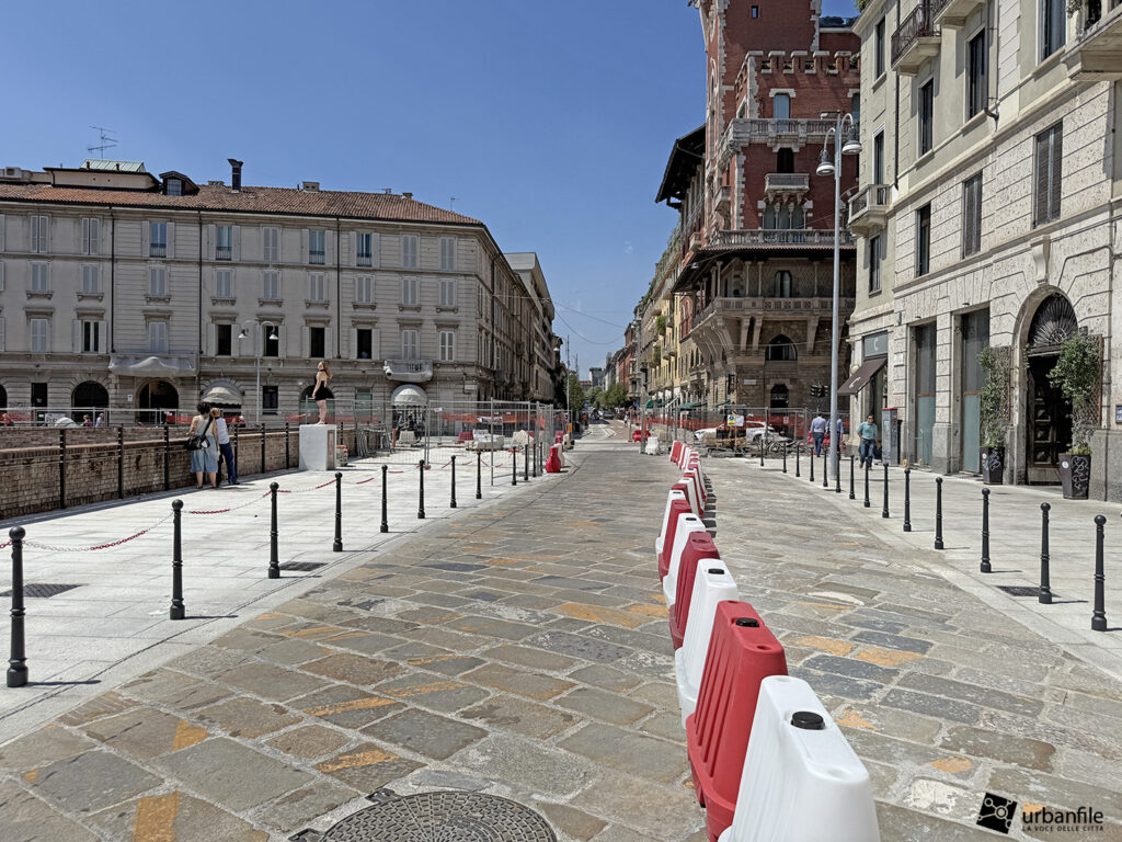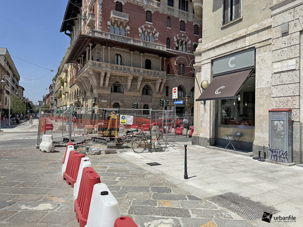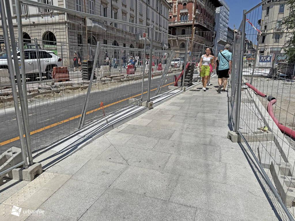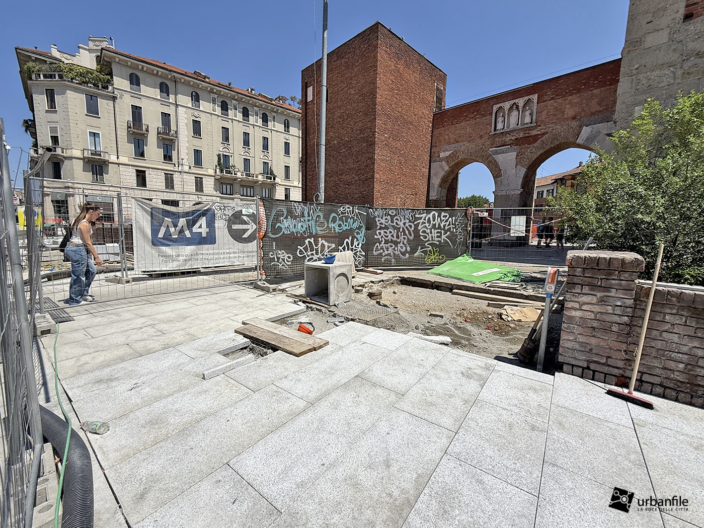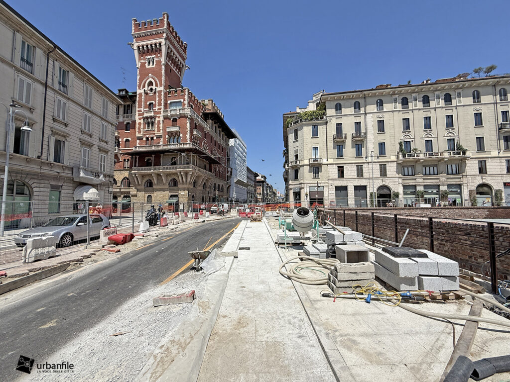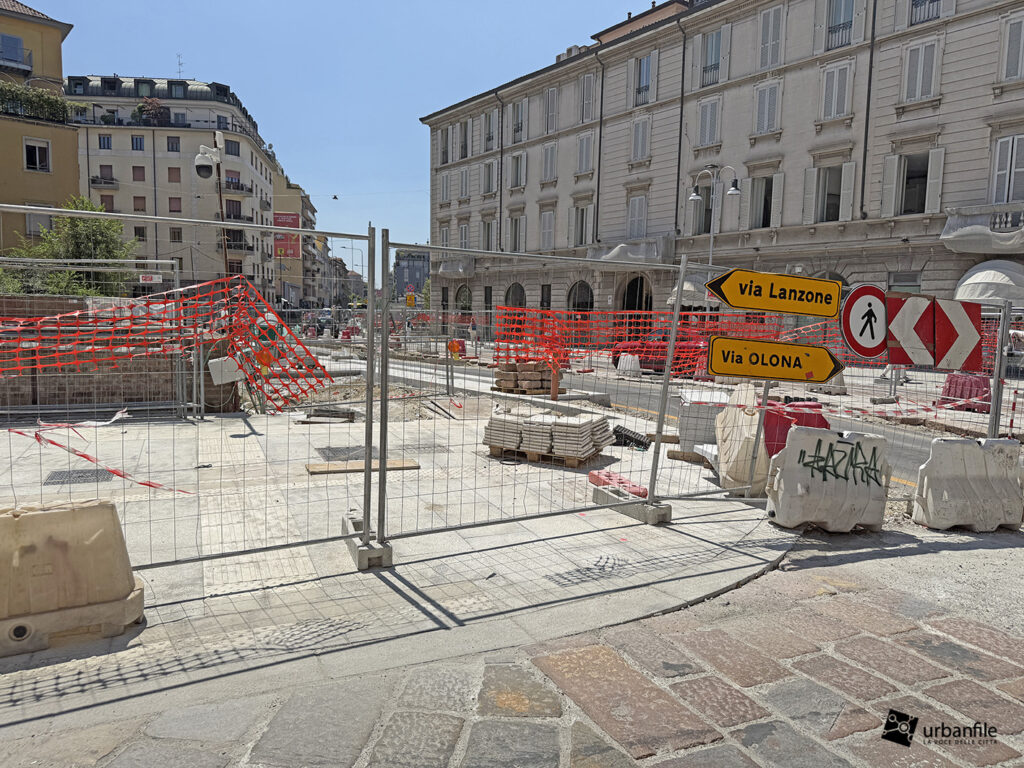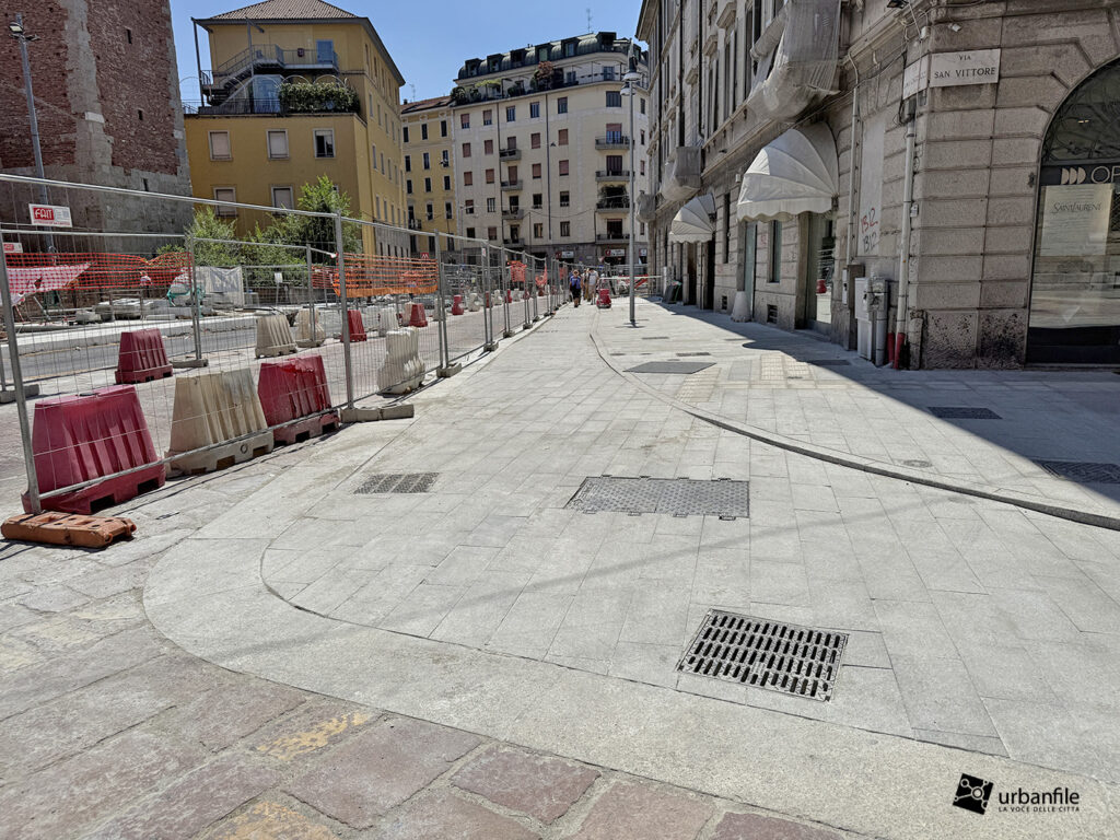 Aggiornamento fotografico di metà luglio dal cantiere per il ripristino in superficie delle aree interessate ai lavori per la costruzione della stazione M4 Sant’Ambrogio e il collegamento con la linea M2 Sant’Ambrogio. Il ripristino riguarda una parte di piazza Sant’Ambrogio, via San Vittore, via De Amicis e via Giosuè Carducci, dove si trovava l’area occupata per oltre 8 anni dal cantiere della M4. La metropolitana è stata aperta interamente lo scorso 12 ottobre (la prima parte venne aperta il 26 novembre 2022), mentre il tunnel di collegamento è stato aperto al passaggio il 21 febbraio 2025.