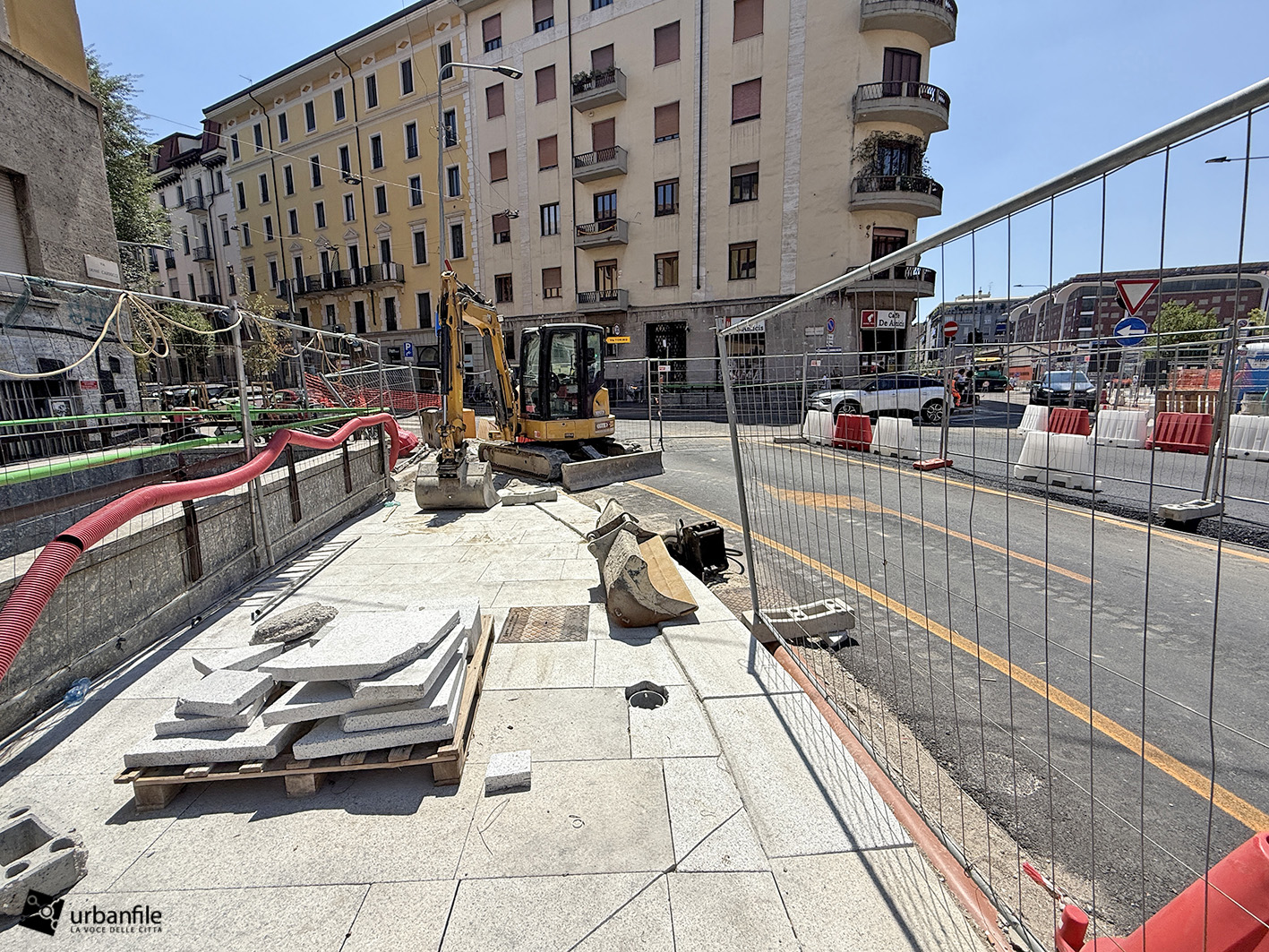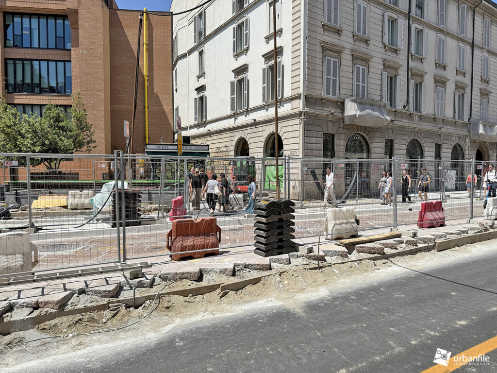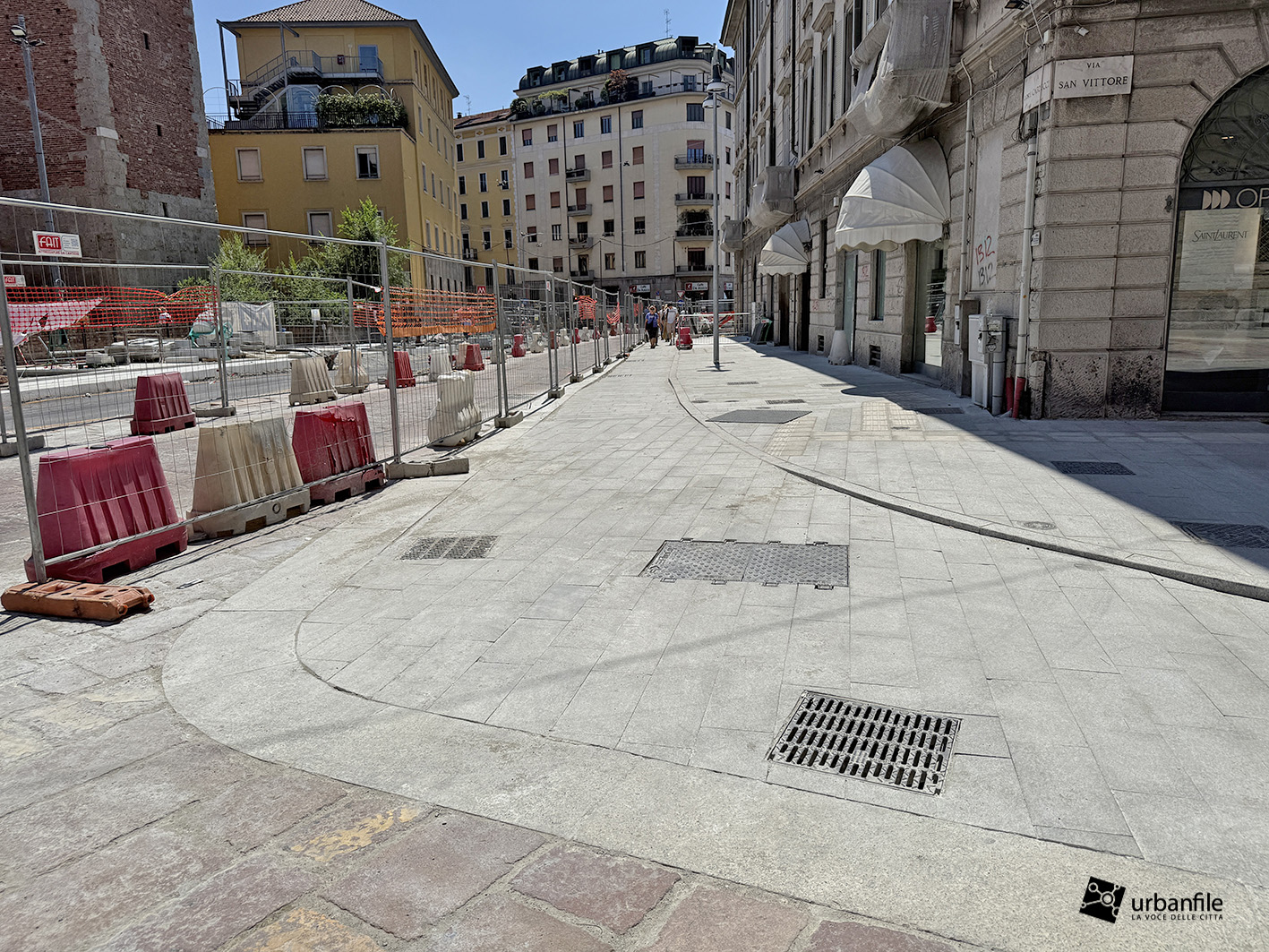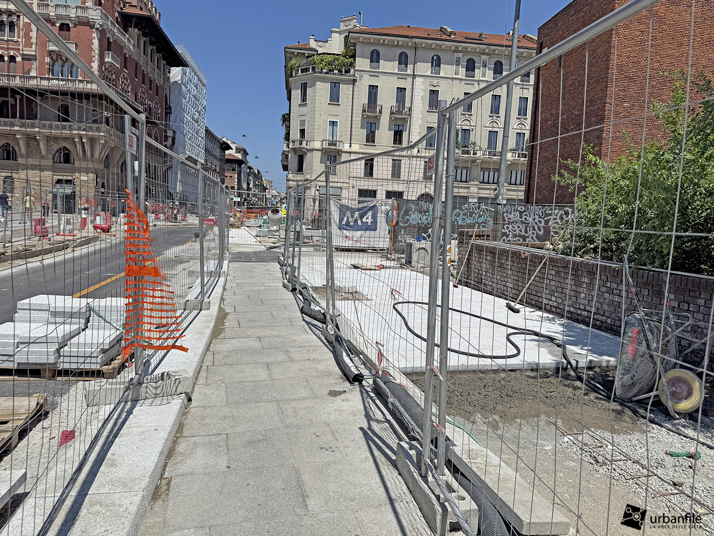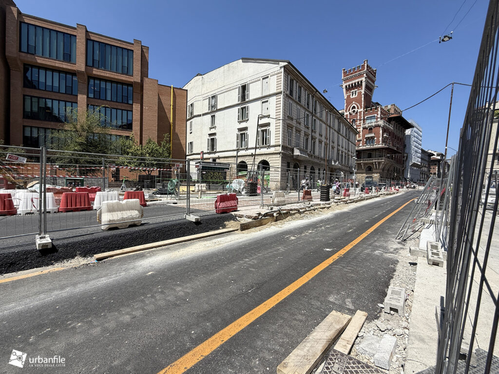 Aggiornamento fotografico di metà luglio dal cantiere per il ripristino in superficie delle aree interessate ai lavori per la costruzione della stazione M4 Sant’Ambrogio e il collegamento con la linea M2 Sant’Ambrogio. Il ripristino riguarda una parte di piazza Sant’Ambrogio, via San Vittore, via De Amicis e via Giosuè Carducci, dove si trovava l’area occupata per oltre 8 anni dal cantiere della M4. La metropolitana è stata aperta interamente lo scorso 12 ottobre (la prima parte venne aperta il 26 novembre 2022), mentre il tunnel di collegamento è stato aperto al passaggio il 21 febbraio 2025.