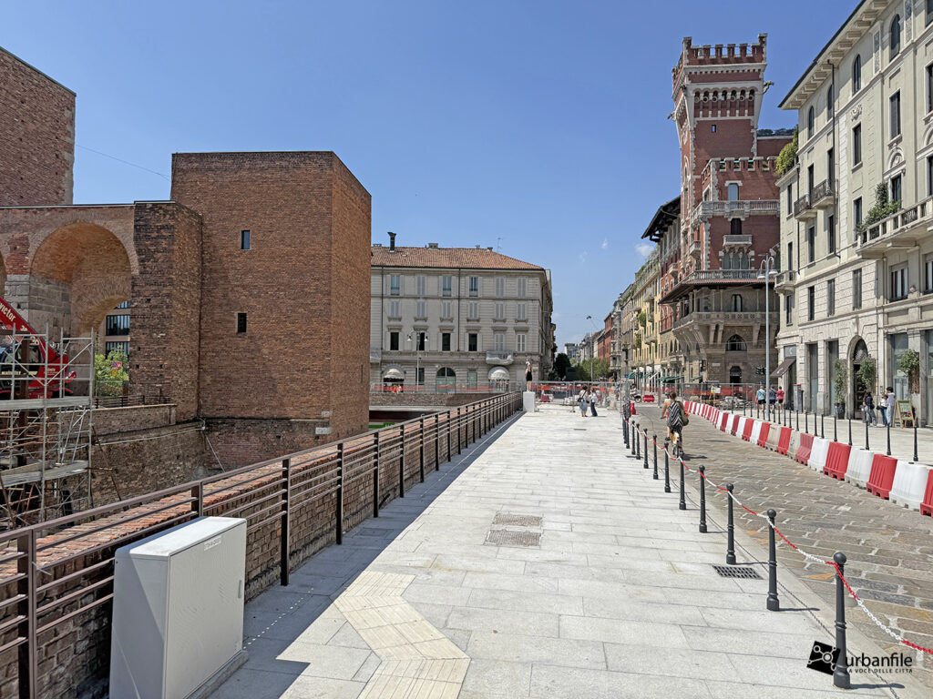 Terminiamo con la strada che costeggia il fossato della pusterla e l’imbocco a via San Vittore. Ricordiamo che i marciapiedi attorno alla pusterla erano deliziati da alberature, mentre ora regna il cemento e la pietra.