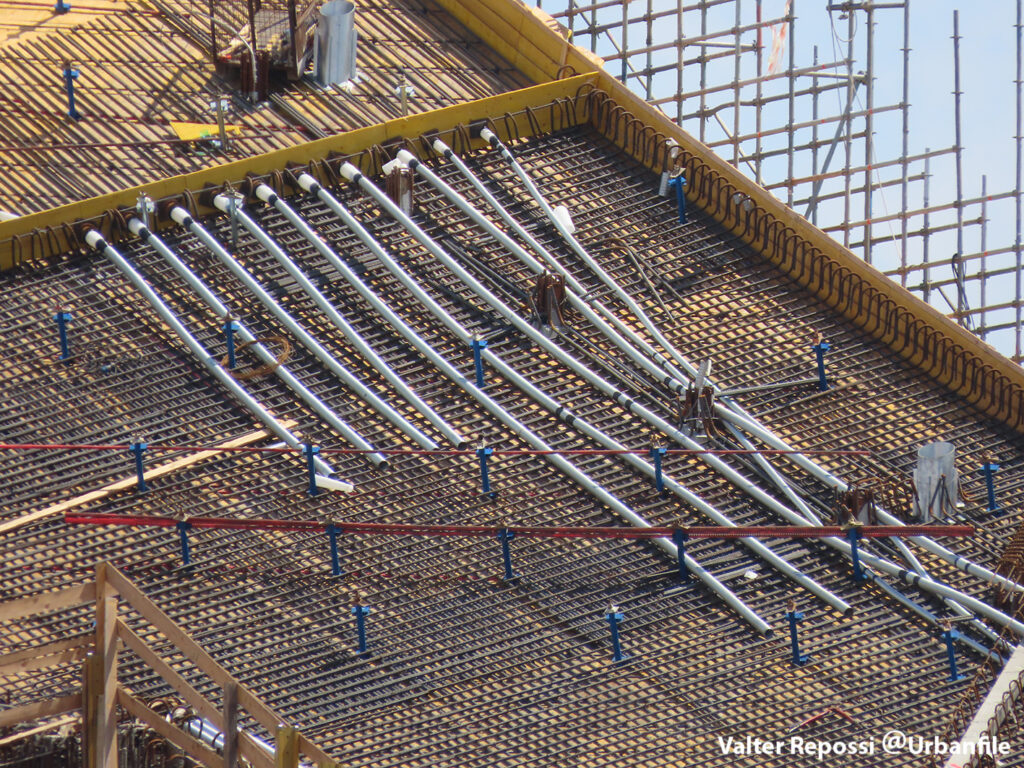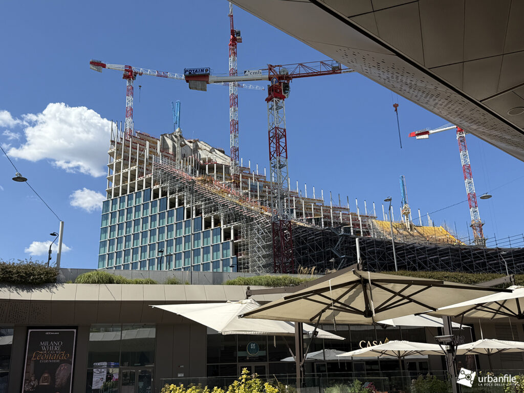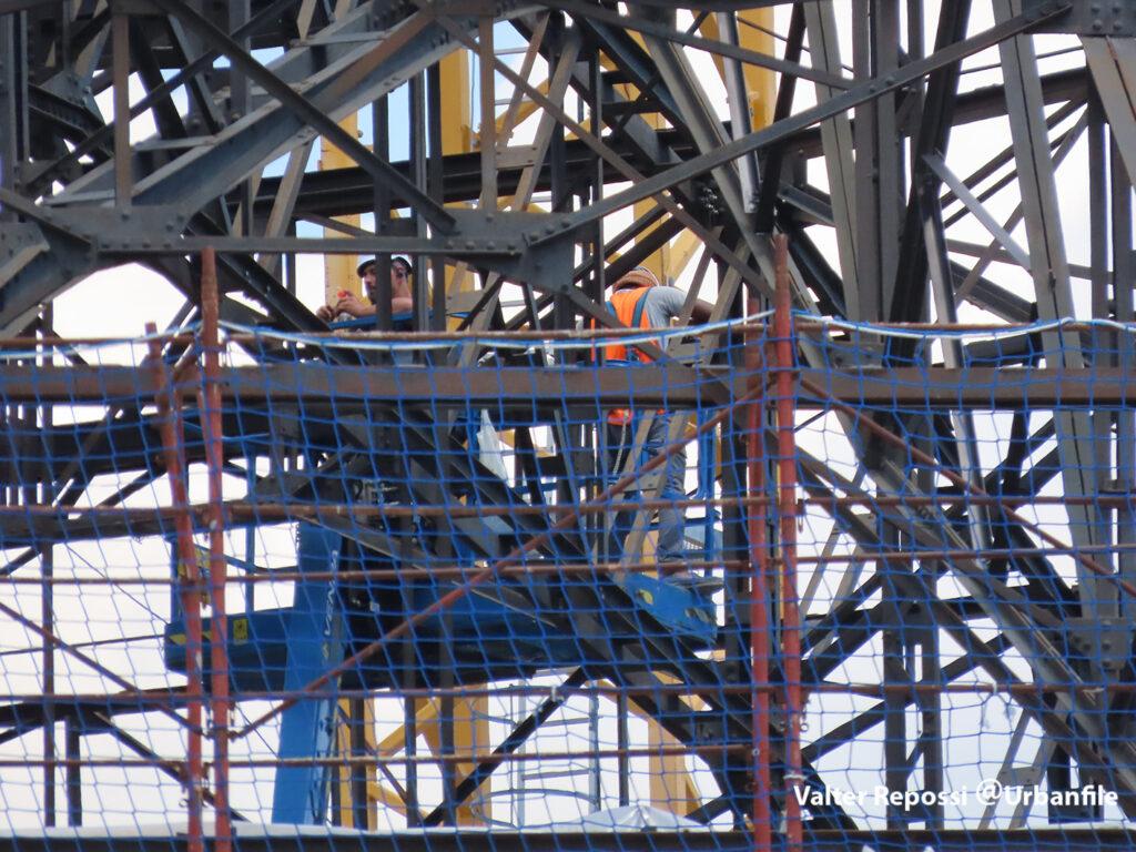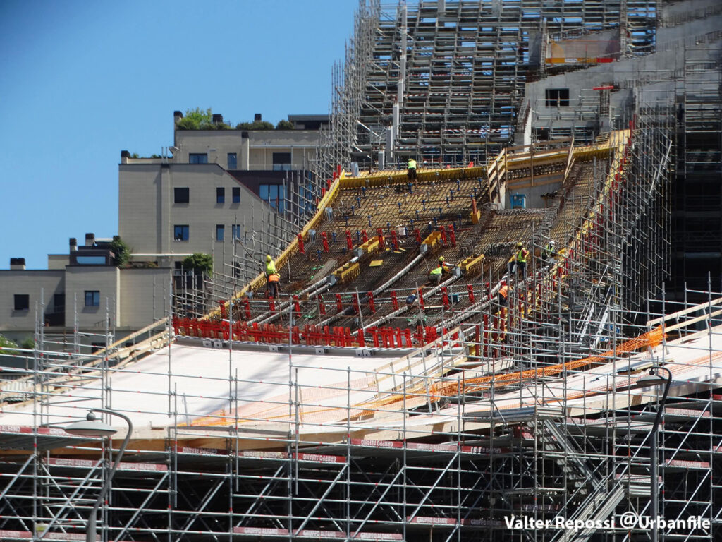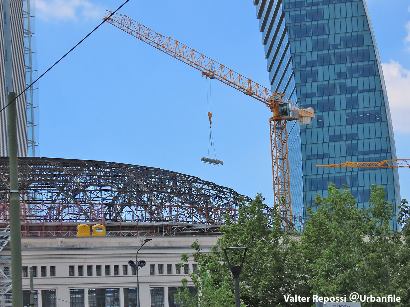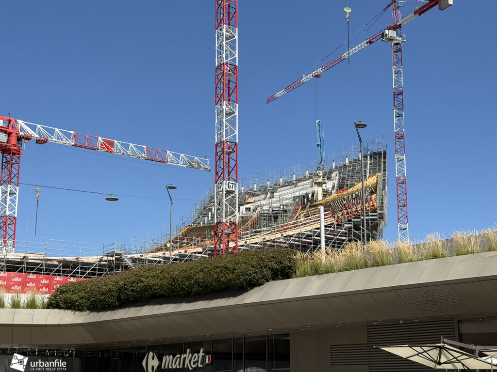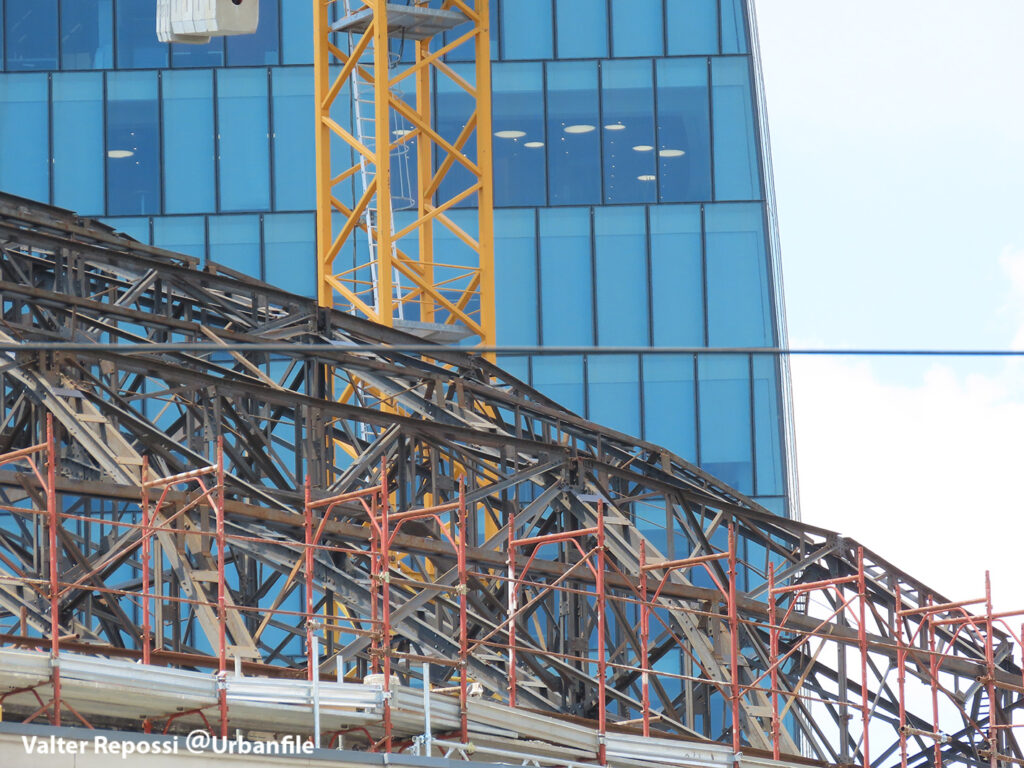 Anche nel cantiere di CityWave proseguono i lavori, oltre al montaggio delle vetrate delle facciate, anche quelli per completare la struttura che servirà a realizzare l’incredibile e complessa tettoia (canopy) che come un “telo” unirà le due torri del nuovo edificio per uffici in realizzazione verso largo Domodossola.