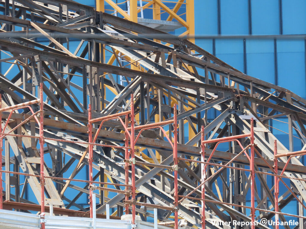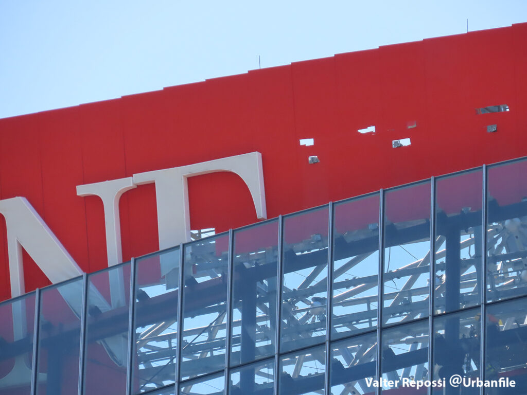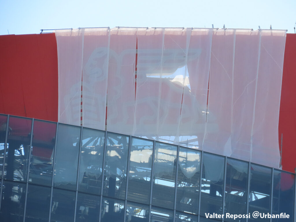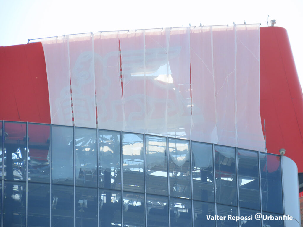 Come si vede, la vecchia copertura della grande cupola del CityOval è stata completamente rimossa mostrando l’anima in acciaio della grande cupola ovale. La struttura metallica sarà restaurata e successivamente verrà ricoperta con nuovi materiali.