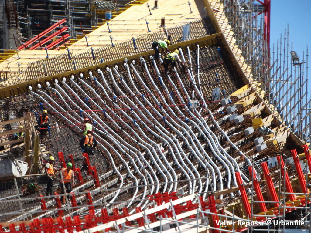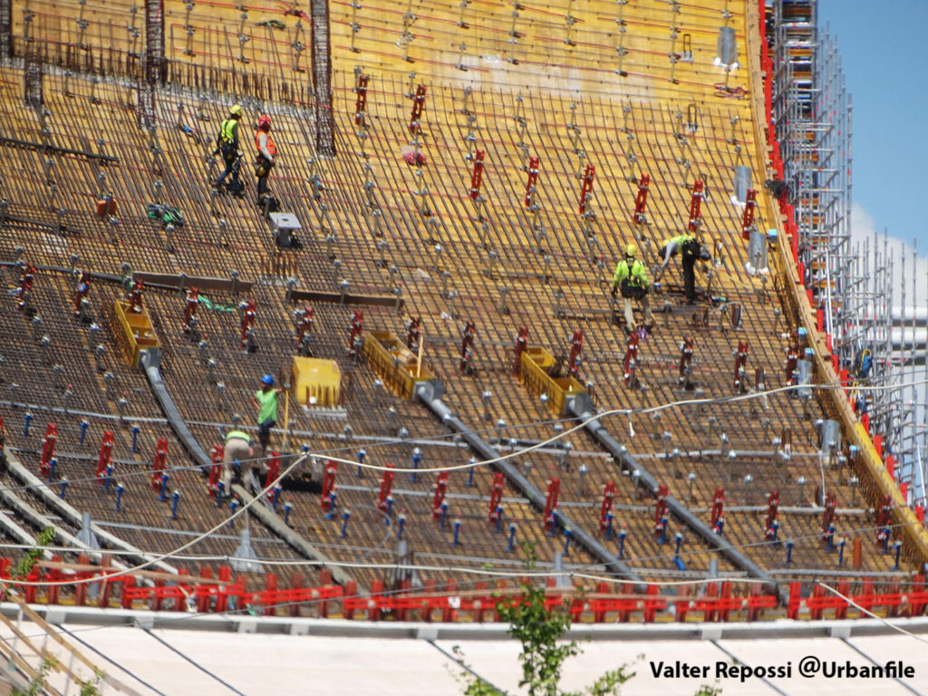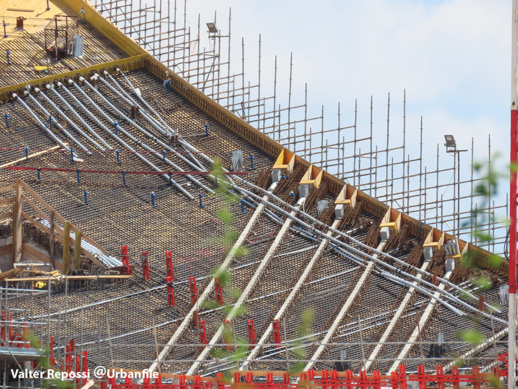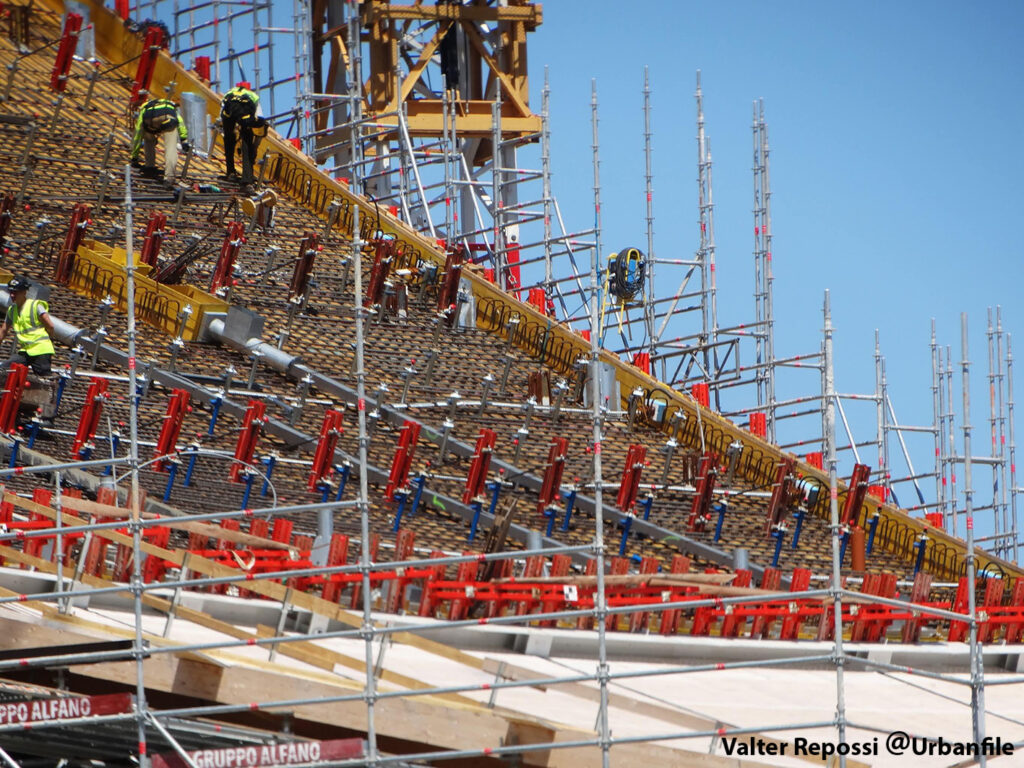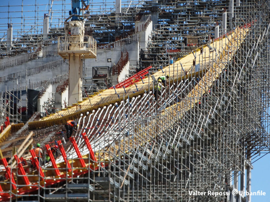 Spettacolari le foto che riguardano la copertura e la realizzazione del “canopy”, che mostrano l’intricata maglia metallica e di tiranti che terranno assieme la struttura.