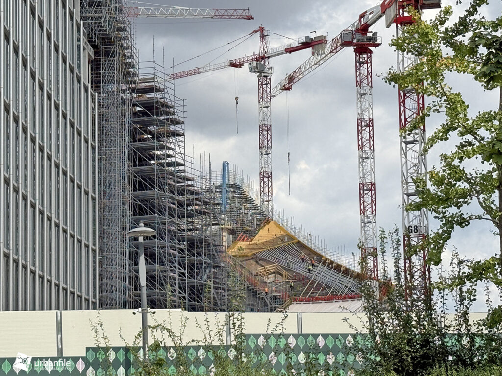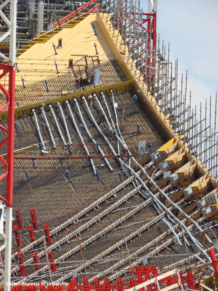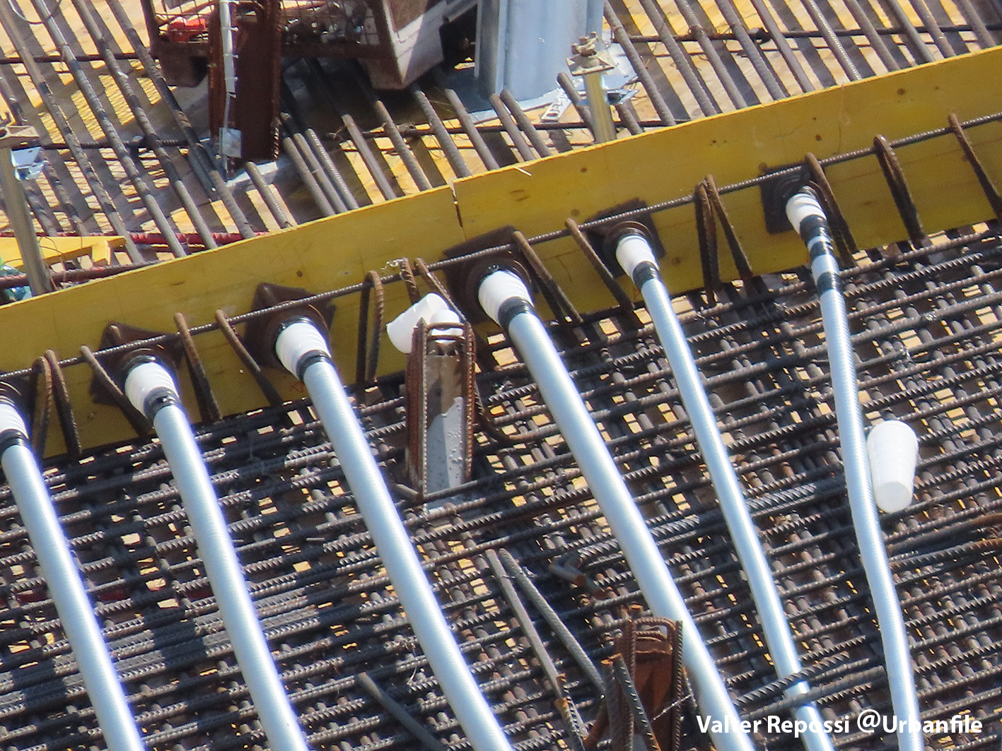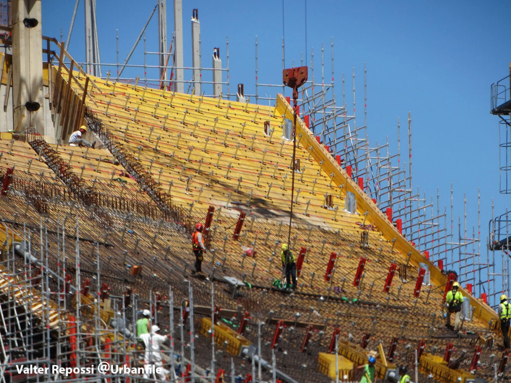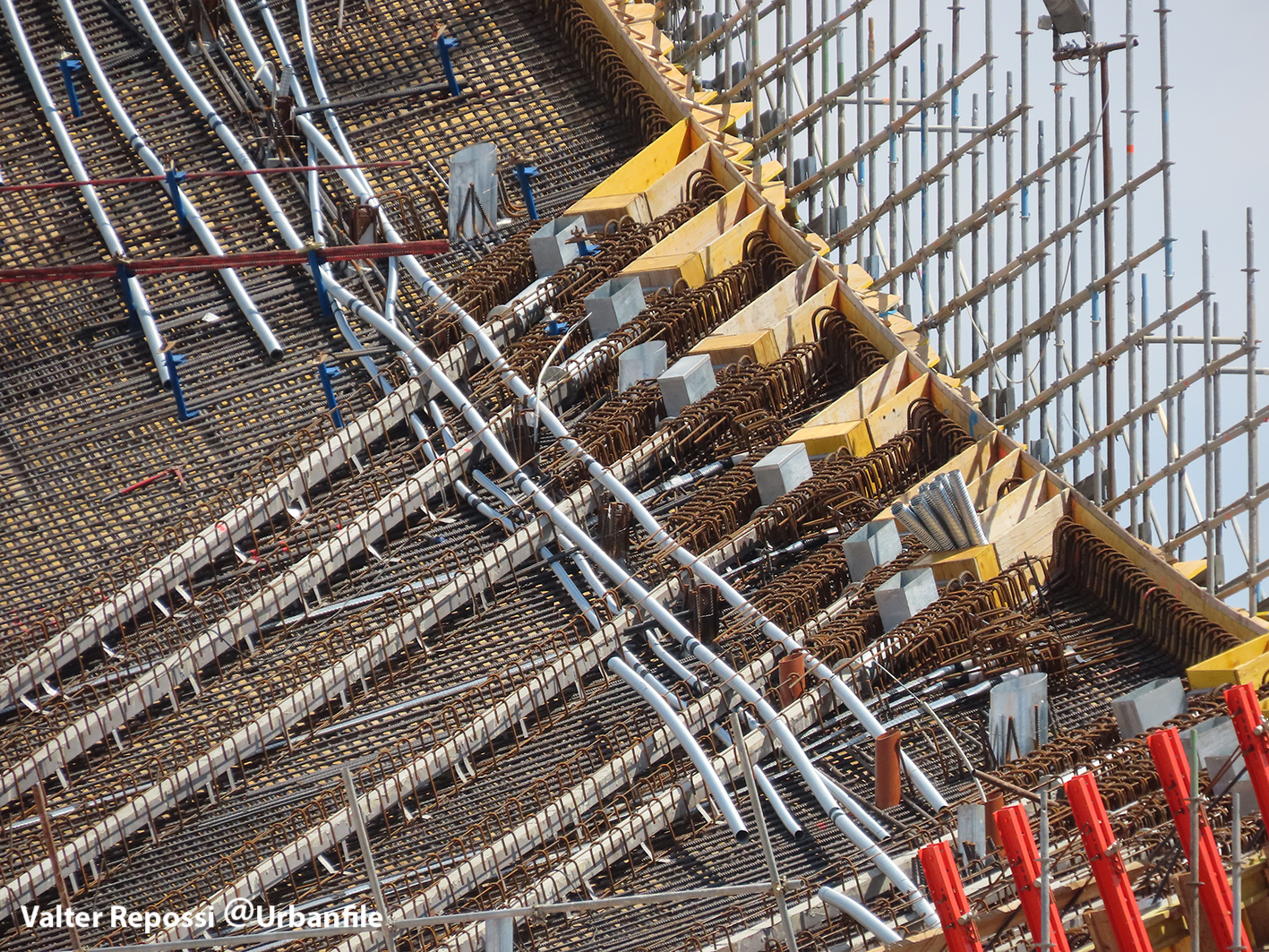 Spettacolari le foto che riguardano la copertura e la realizzazione del “canopy”, che mostrano l’intricata maglia metallica e di tiranti che terranno assieme la struttura.