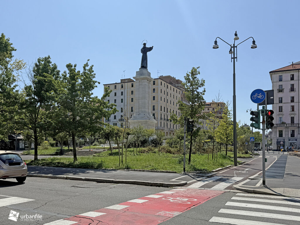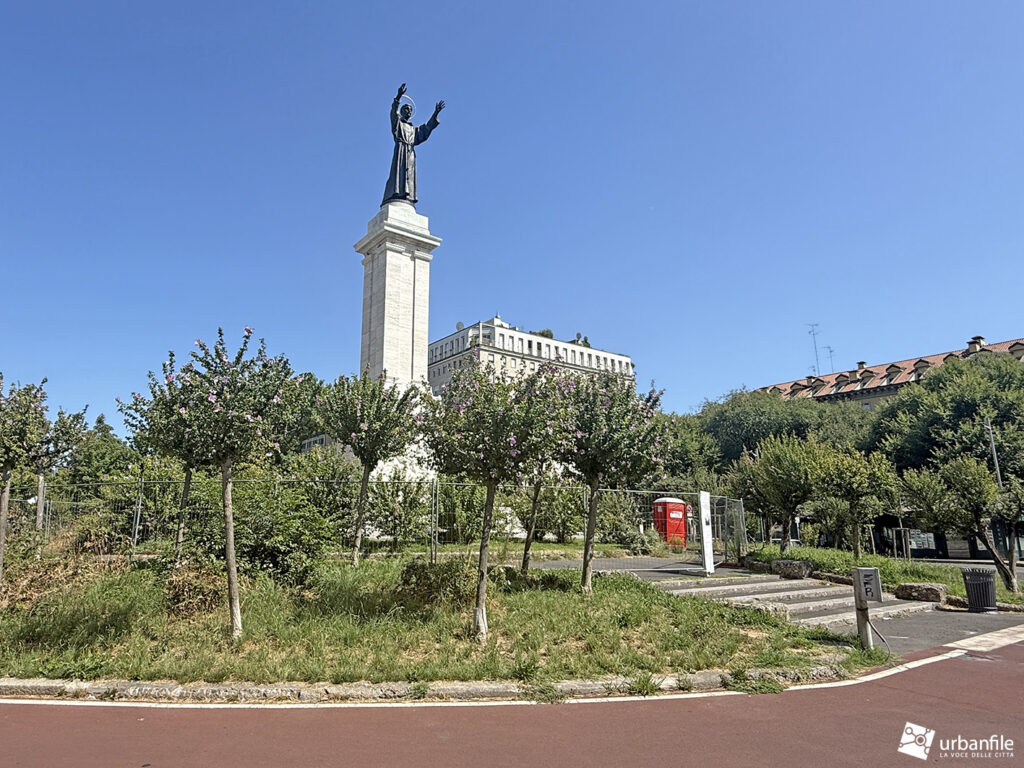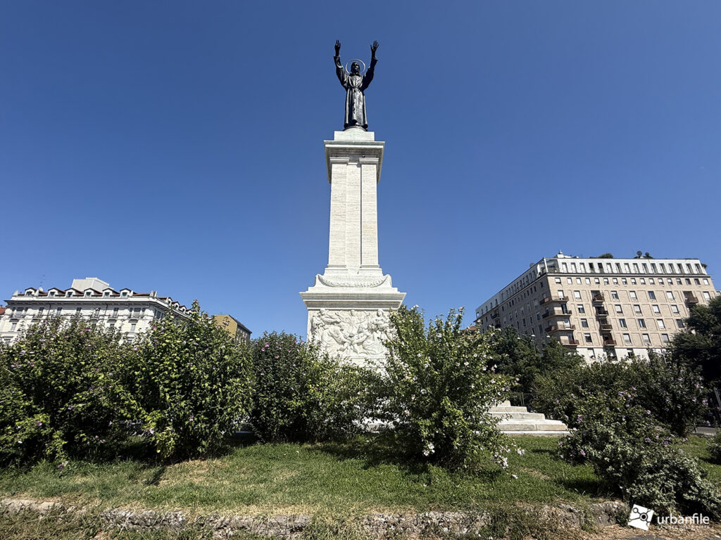 La statua, alta oltre cinque metri e posta su un’imponente colonna, è opera del celebre scultore e incisore Domenico Trentacoste, che la realizzò a titolo gratuito. Fusa con 150 quintali di bronzo, raffigura il santo di Assisi in atteggiamento benedicente, con le braccia protese verso il popolo. La colonna, progettata dagli architetti Piero Portaluppi e Giovanni Muzio Gadda, è decorata con due altorilievi: uno raffigura San Francesco che riporta la pace tra famiglie e lavoratori, l’altro San Francesco riceve le stimmate. Grazie alla sua altezza, il monumento è visibile anche da grande distanza.
