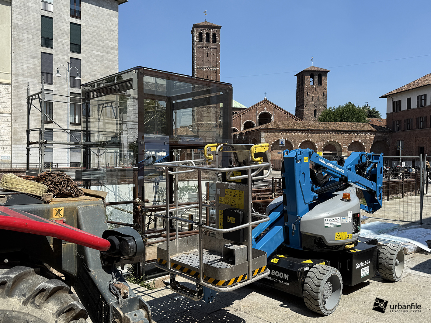 Aggiornamento fotografico di metà luglio dal cantiere per il ripristino in superficie delle aree interessate ai lavori per la costruzione della stazione M4 Sant’Ambrogio e il collegamento con la linea M2 Sant’Ambrogio. Il ripristino riguarda una parte di piazza Sant’Ambrogio, via San Vittore, via De Amicis e via Giosuè Carducci, dove si trovava l’area occupata per oltre 8 anni dal cantiere della M4. La metropolitana è stata aperta interamente lo scorso 12 ottobre (la prima parte venne aperta il 26 novembre 2022), mentre il tunnel di collegamento è stato aperto al passaggio il 21 febbraio 2025.