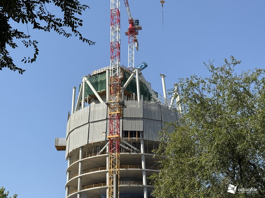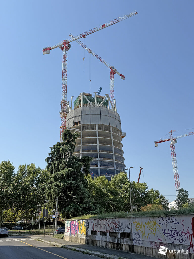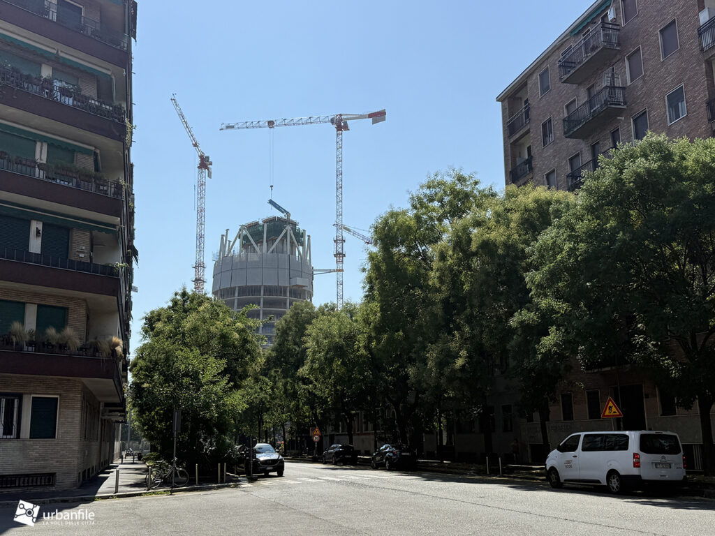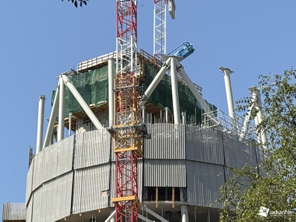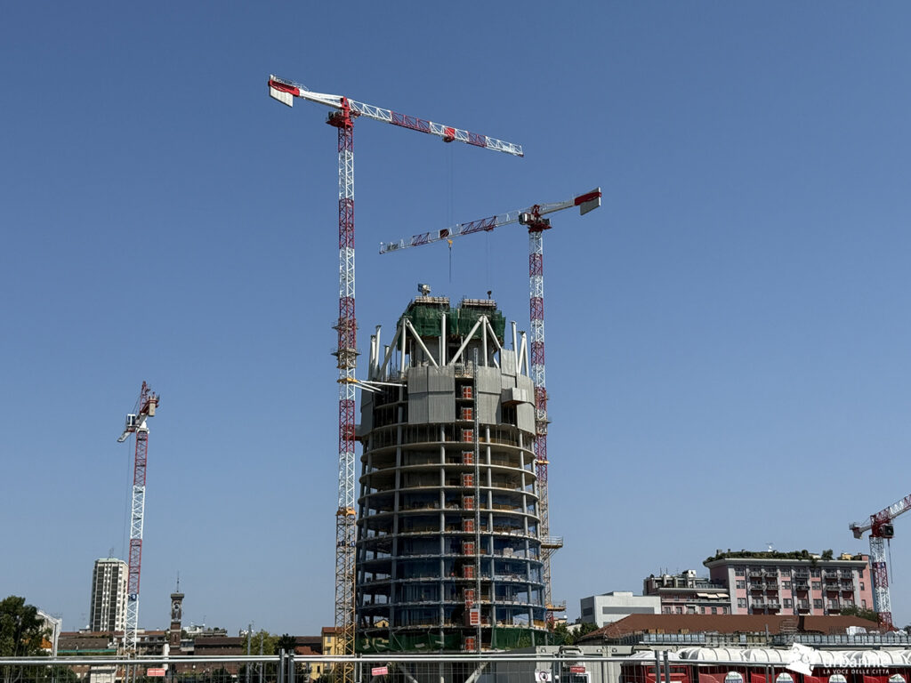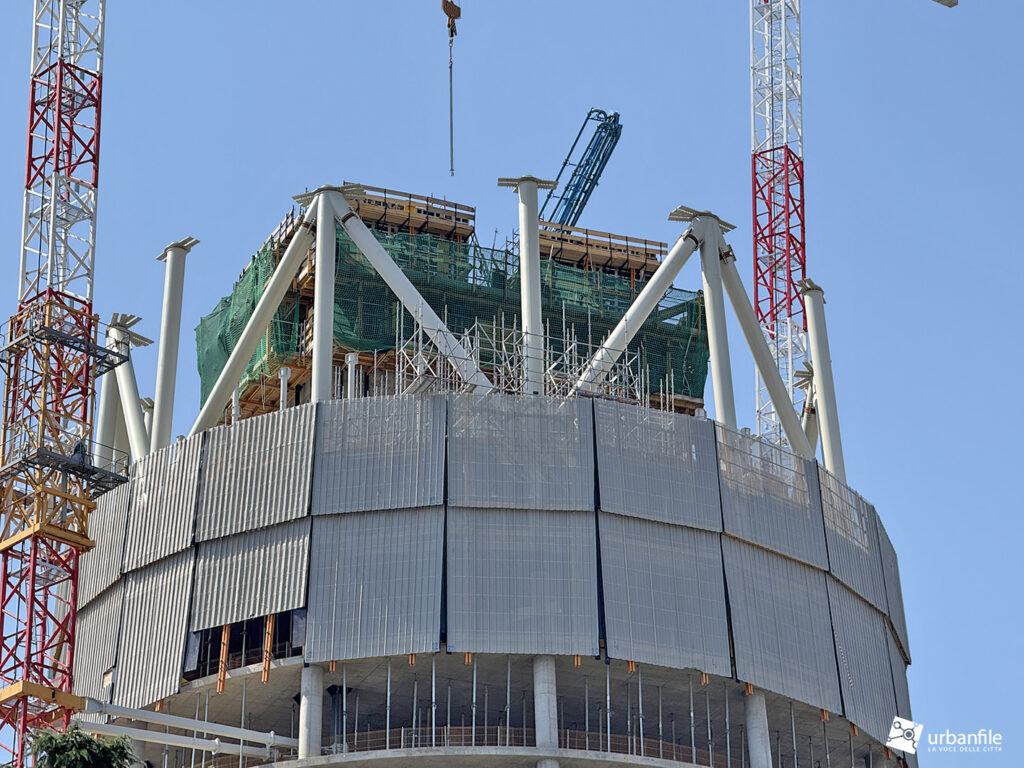 Abbiamo visto nei primi giorni di agosto la fase di montaggio della corona di colonne inclinate poste a circa metà della torre (12mo piano) dove dovrebbero esserci i locali tecnici di servizio e un “terrazzo alberato”. Al centro il “core” (la sezione centrale in cemento armato dove si troveranno scale e ascensori) dovrebbe aver raggiunto il quindicesimo piano.