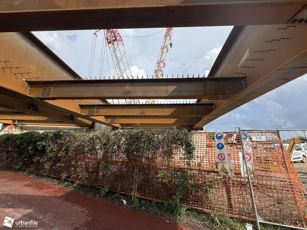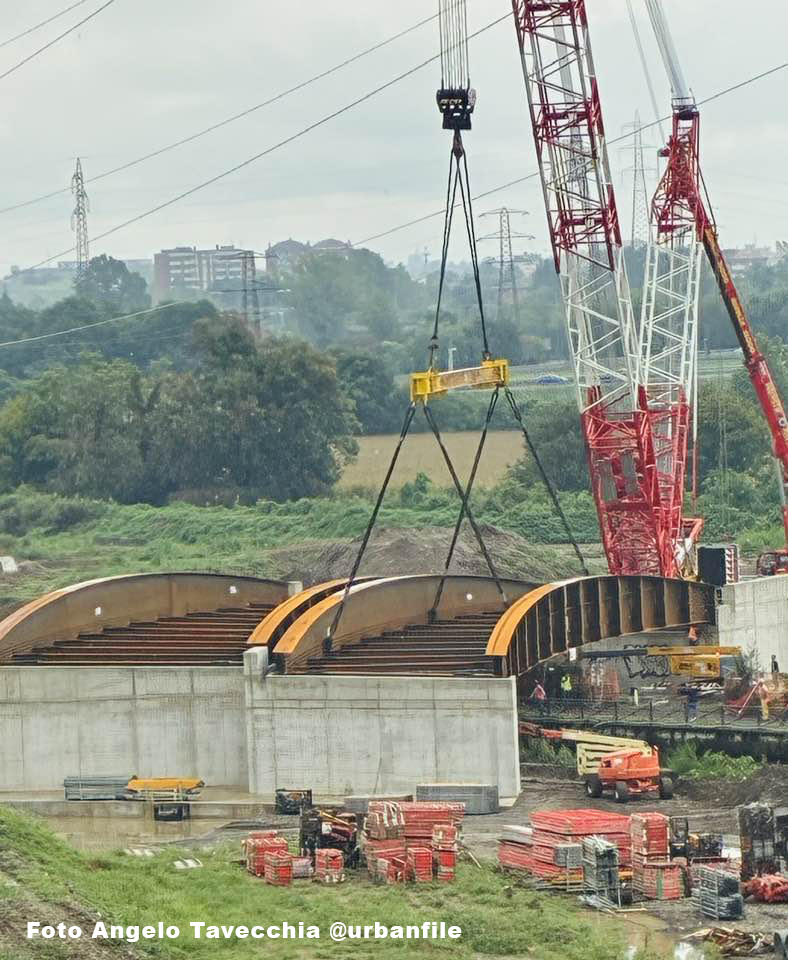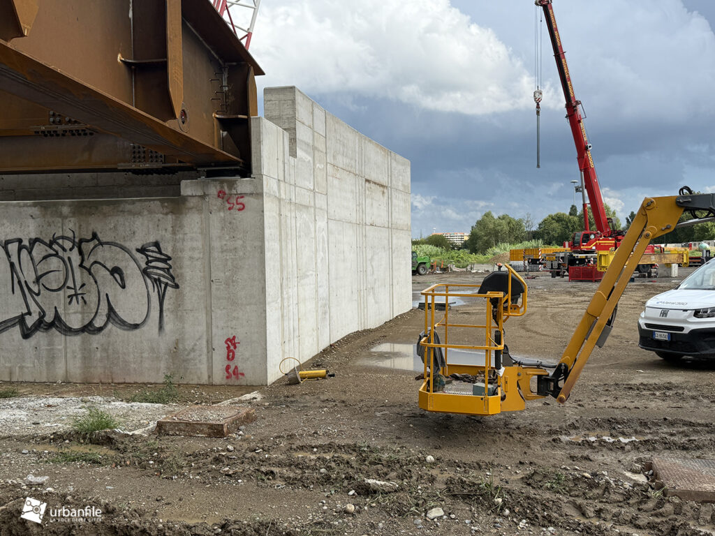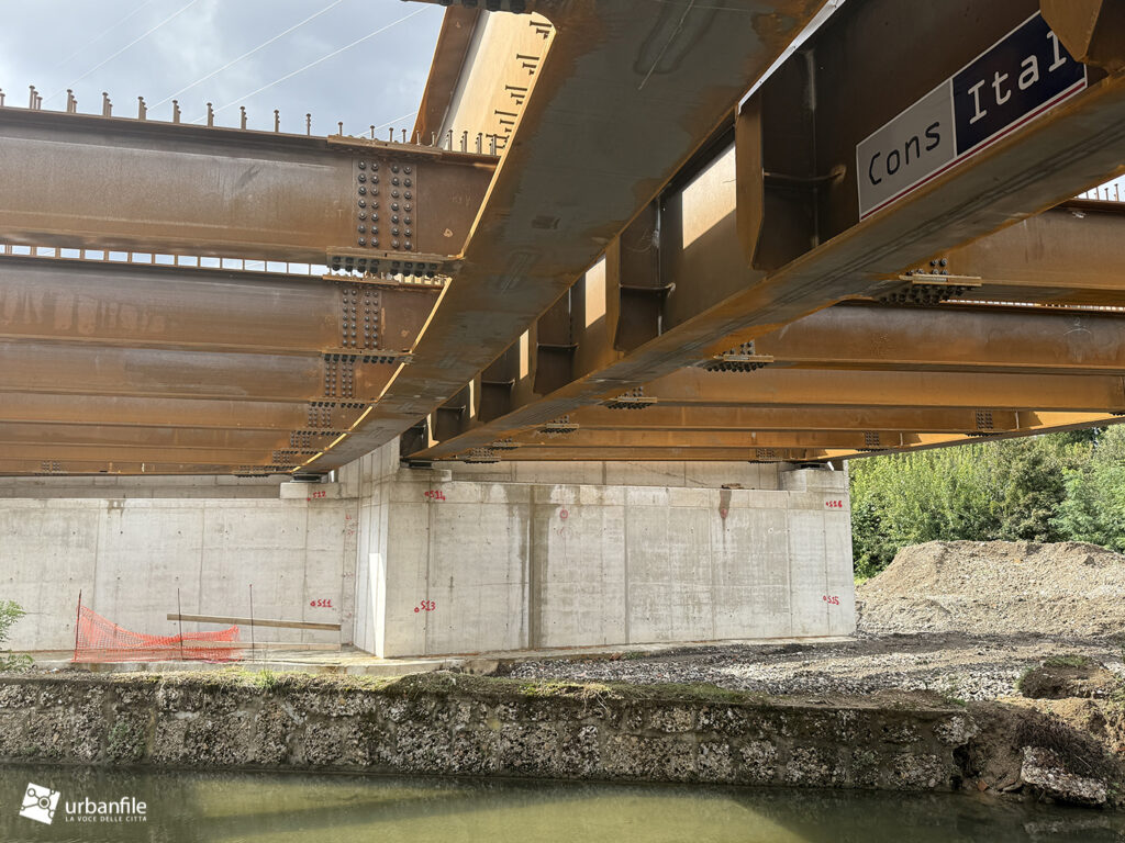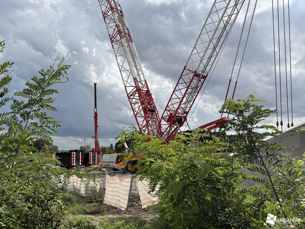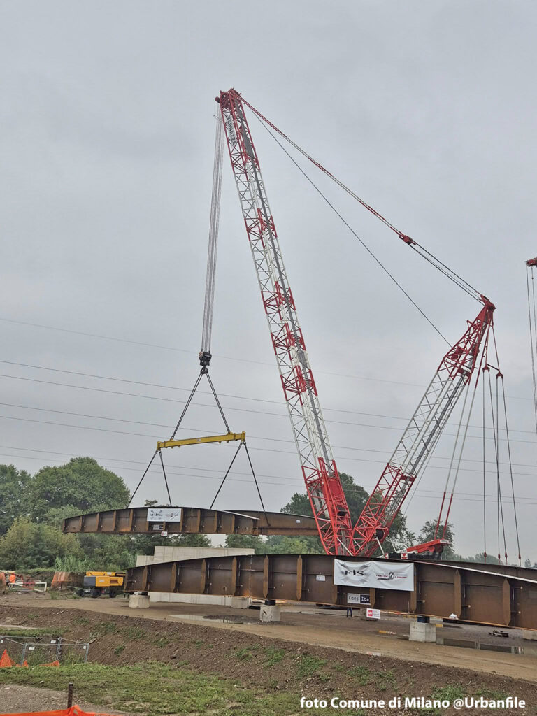 Ieri e oggi (28 e 29 agosto 2025) sono stati montati i due impalcati del ponte con una possente gru. Due ponti lunghi 35 metri e pesanti 135 tonnellate ciascuno, sollevati e appoggiati ai pilastri con una gru alta 50 metri (come un palazzo di 16 piani), una delle più grandi in Italia.