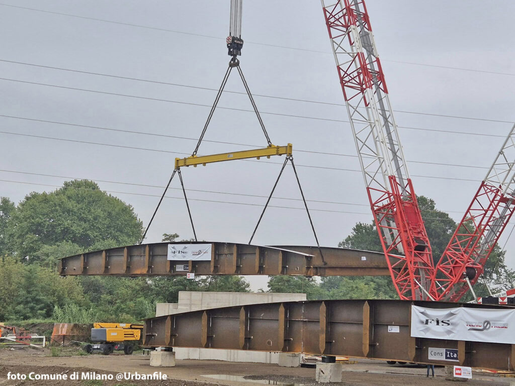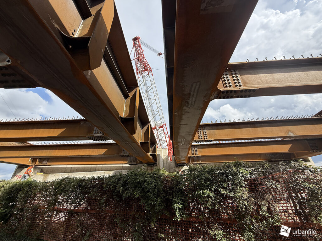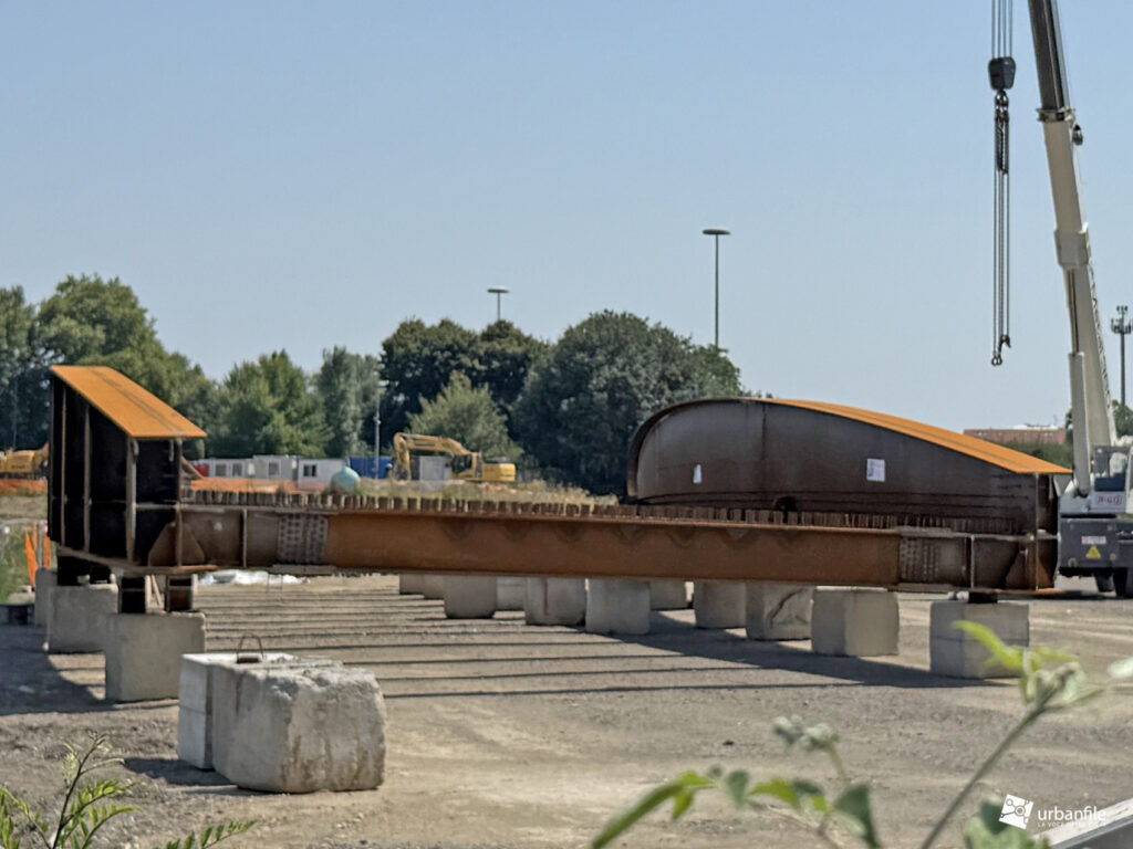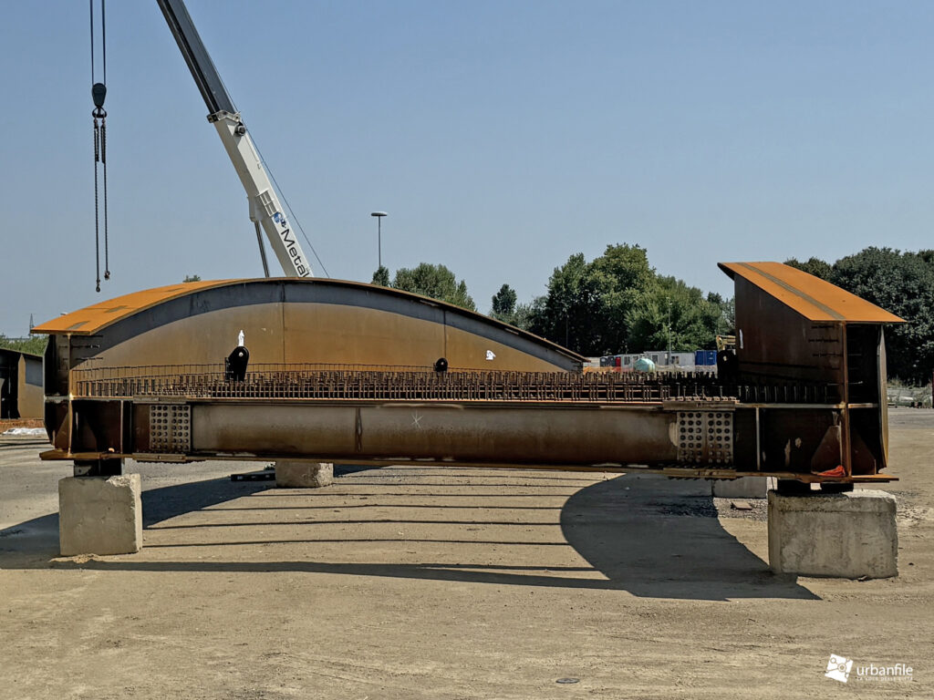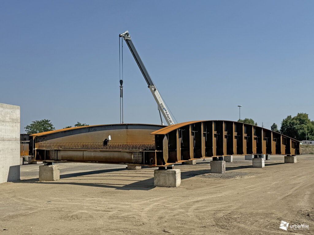 Ieri e oggi (28 e 29 agosto 2025) sono stati montati i due impalcati del ponte con una possente gru. Due ponti lunghi 35 metri e pesanti 135 tonnellate ciascuno, sollevati e appoggiati ai pilastri con una gru alta 50 metri (come un palazzo di 16 piani), una delle più grandi in Italia.