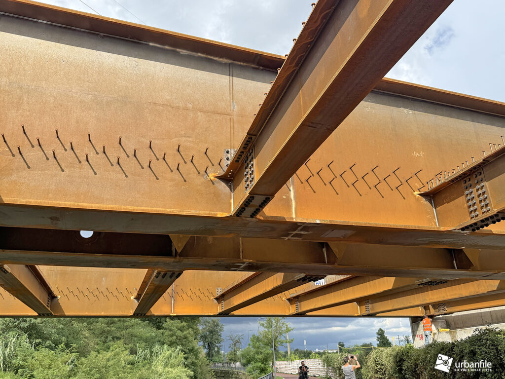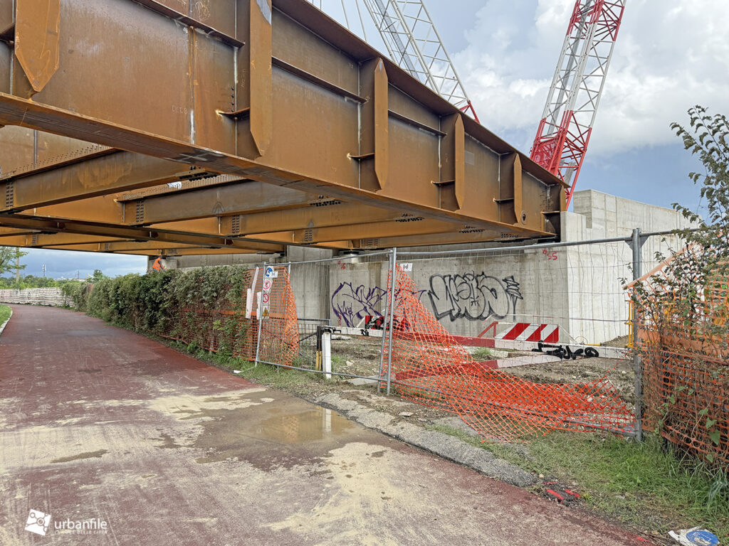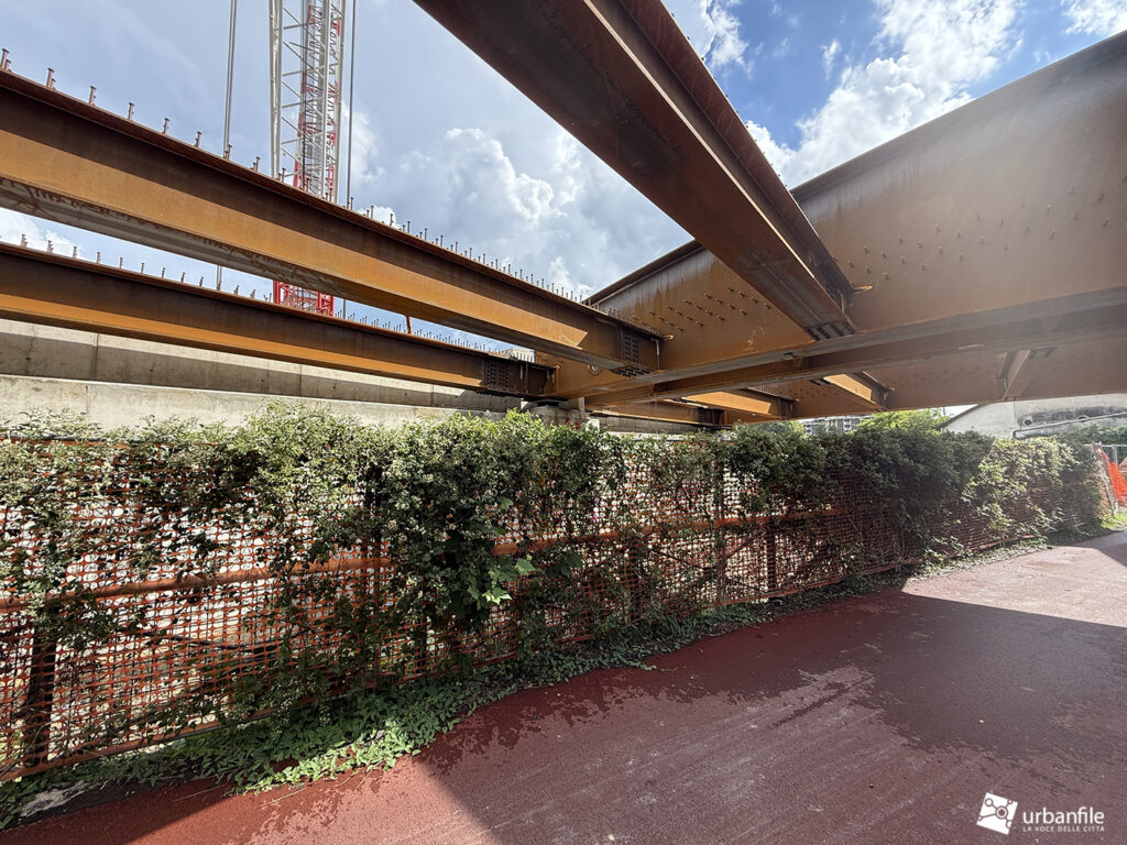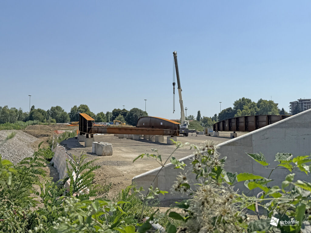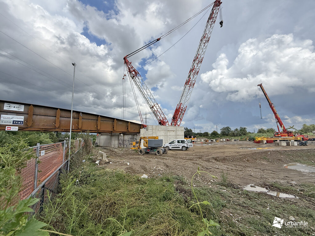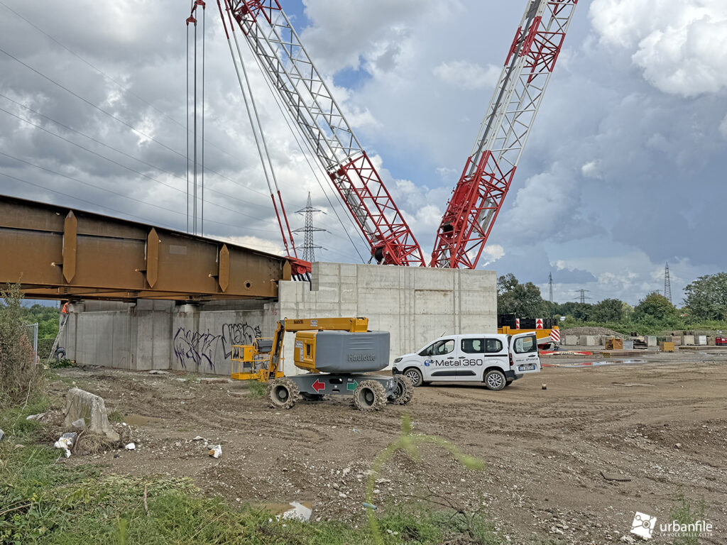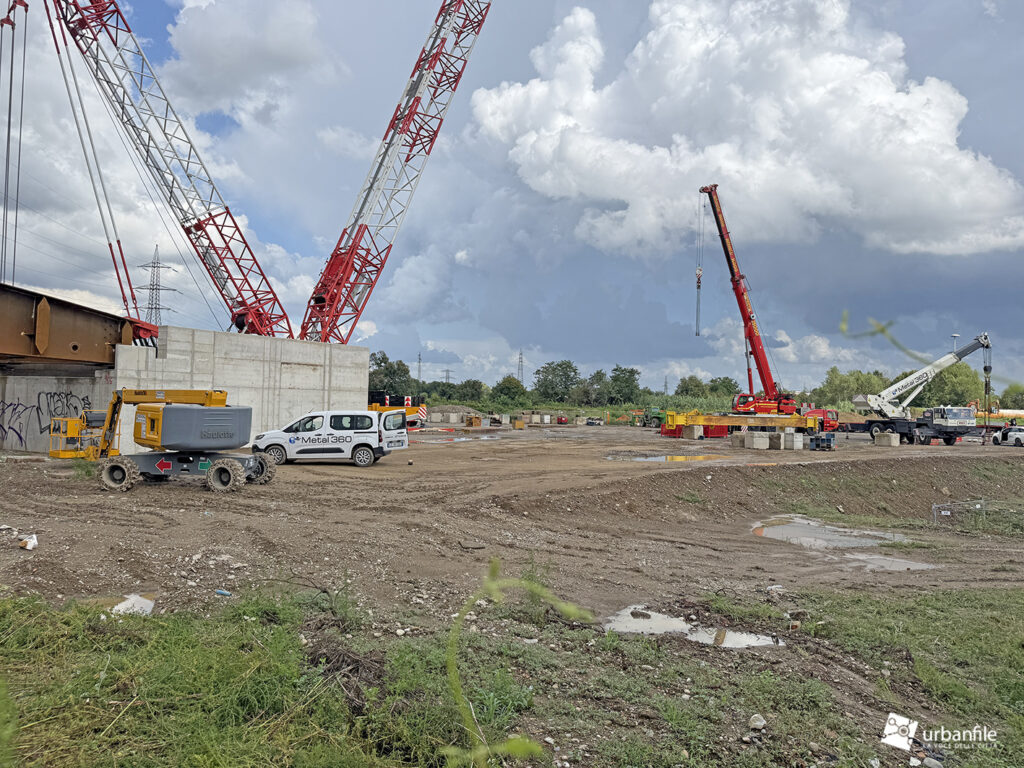 Anzitutto vi mostriamo il cantiere come si presentava a metà agosto (14 agosto), dove si vedono i piloni di sostegno già completati, mentre a lato erano stati assemblati i due impalcati metallici.