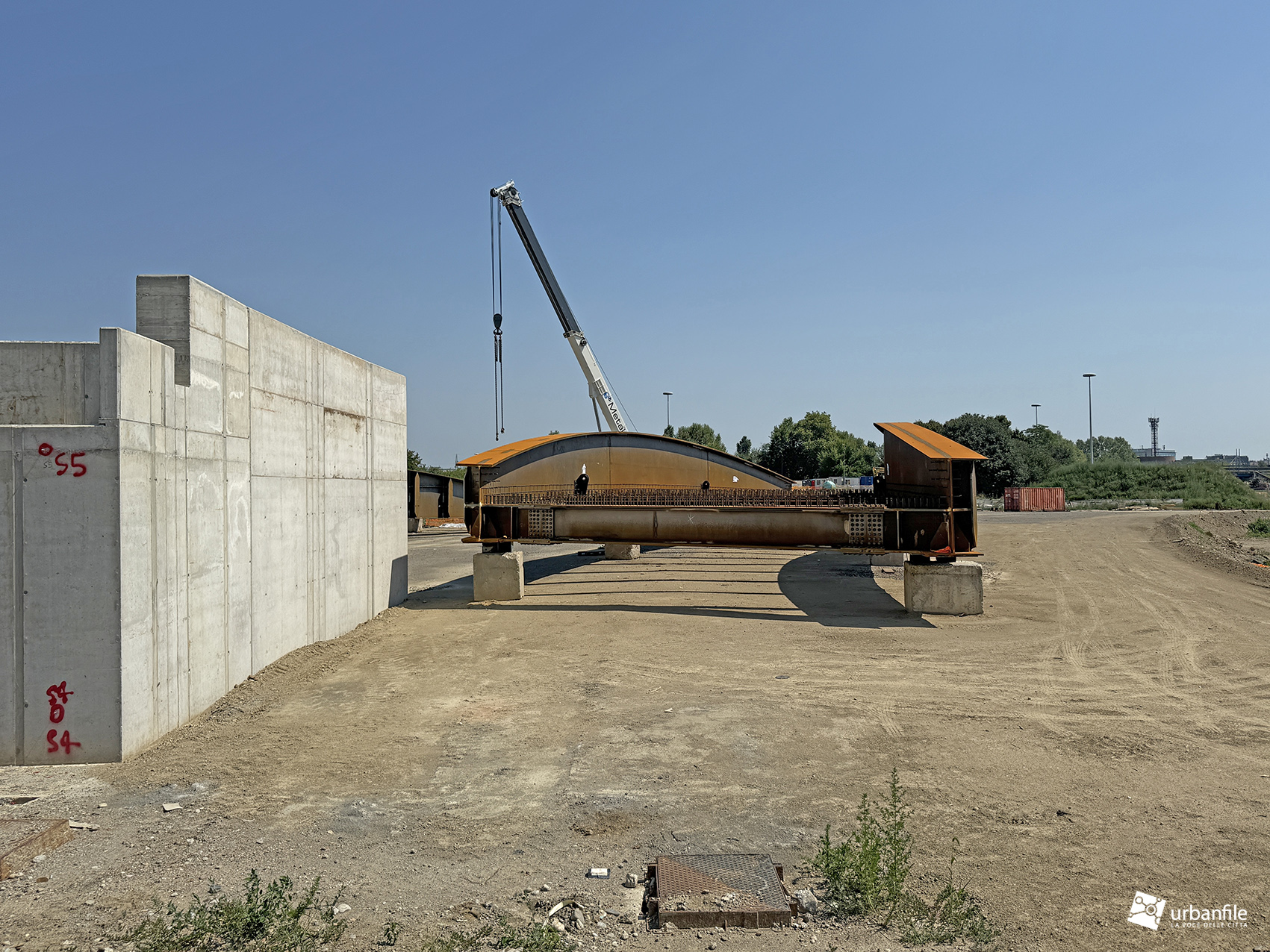 Anzitutto vi mostriamo il cantiere come si presentava a metà agosto (14 agosto), dove si vedono i piloni di sostegno già completati, mentre a lato erano stati assemblati i due impalcati metallici.