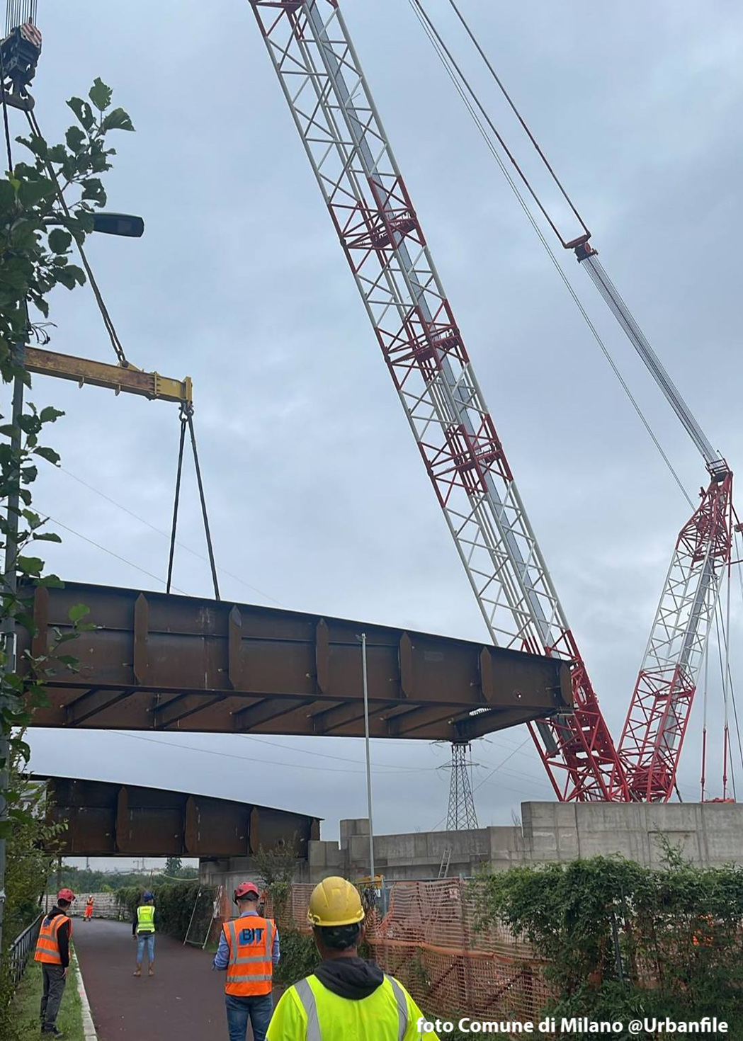 Ieri e oggi (28 e 29 agosto 2025) sono stati montati i due impalcati del ponte con una possente gru. Due ponti lunghi 35 metri e pesanti 135 tonnellate ciascuno, sollevati e appoggiati ai pilastri con una gru alta 50 metri (come un palazzo di 16 piani), una delle più grandi in Italia.