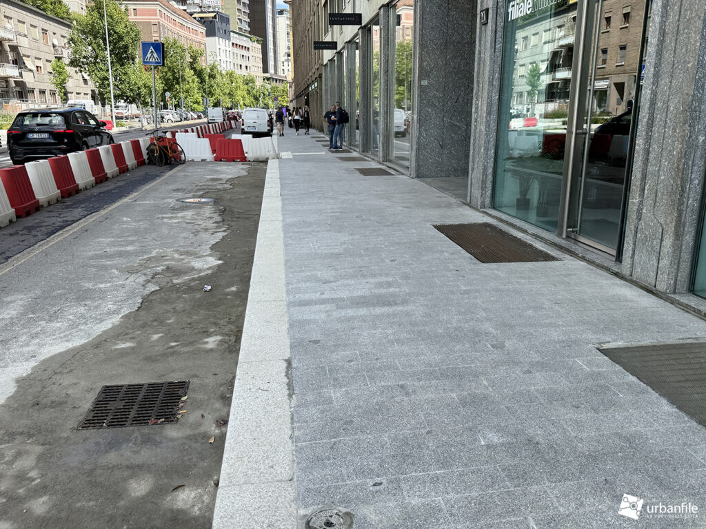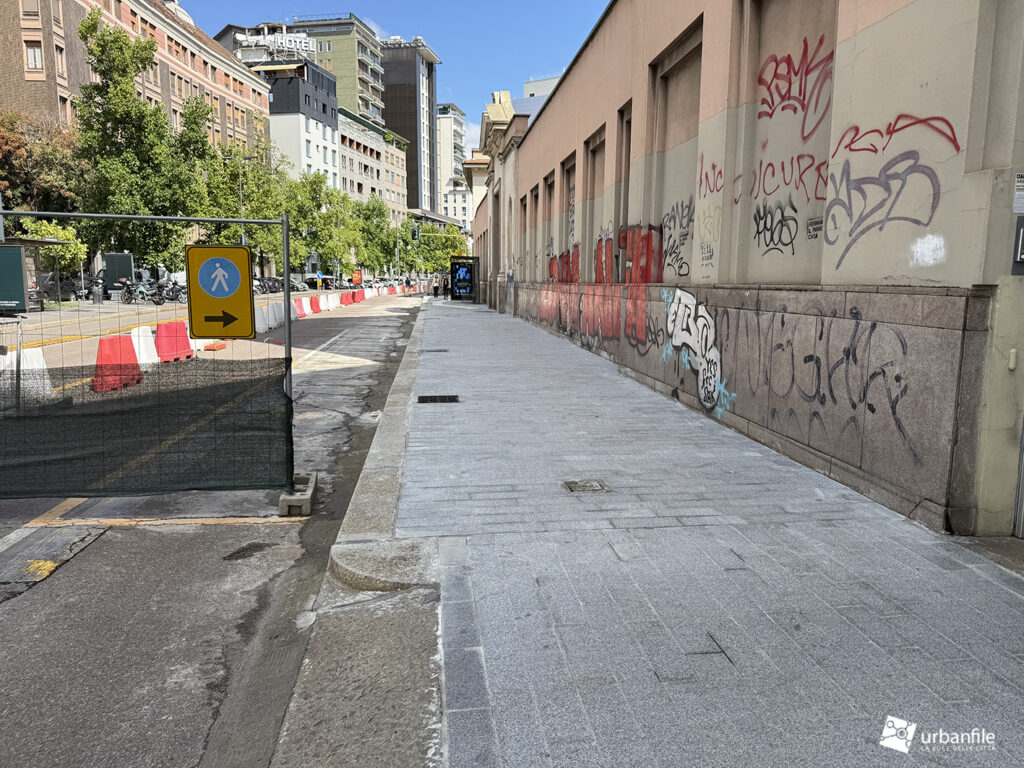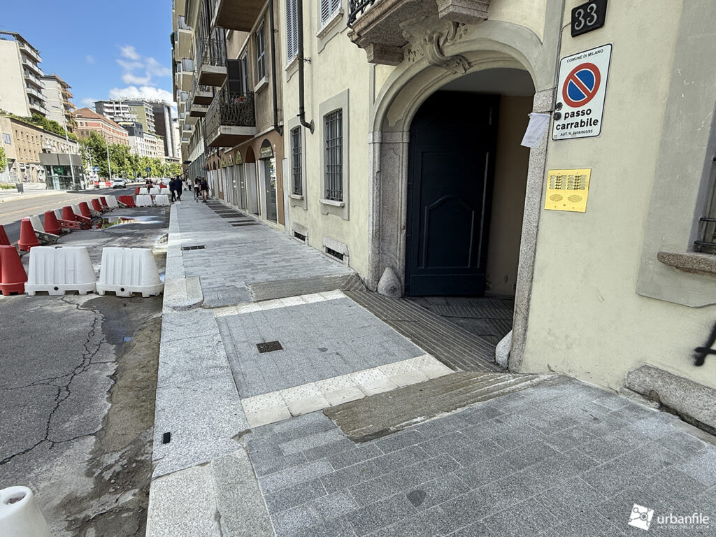 Il marciapiede dei civici pari interessato dal cantiere M4, è praticamente completato da largo Sacerdoti sino al civico 24, come si vede dalle immagini.
