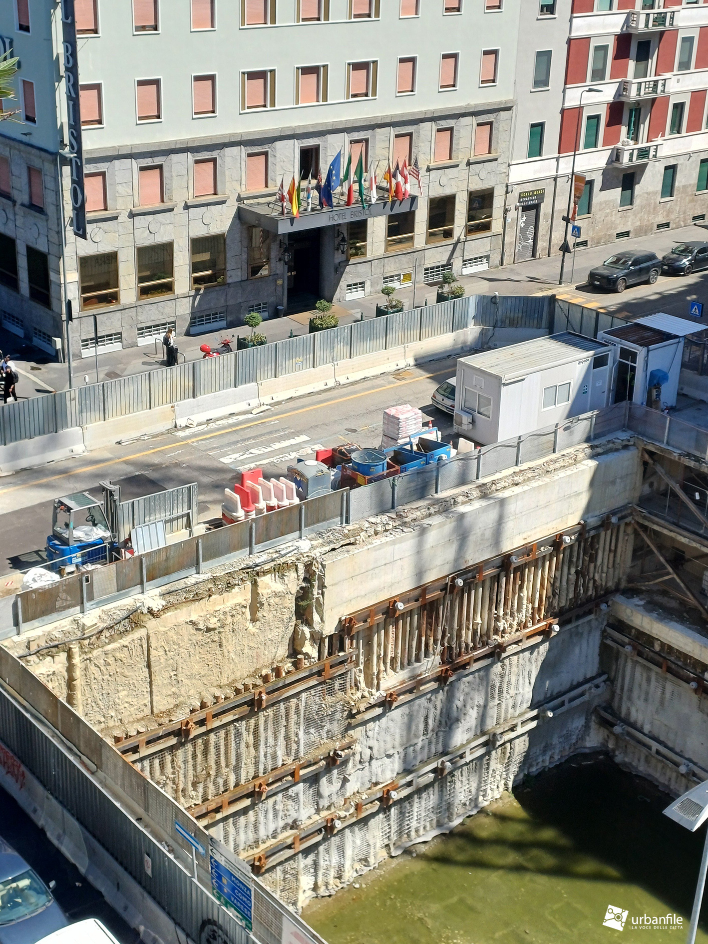 Il cantiere, dopo lo scavo e il montaggio dell’altissima gru nell’agosto 2024, è fermo completamente, senza traccia di alcun intervento, dallo scorso marzo. La falda acquifera si è presa possesso dello scavo trasformandolo in un gigantesco acquitrino a due passi dalla stazione Centrale. Non siamo riusciti a scoprire le motivazioni di questo ritardo che inizia ad essere preoccupante.