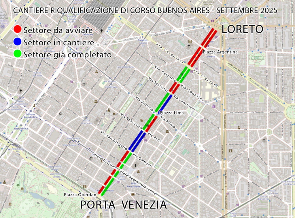 Proseguiamo verso Loreto, dove da via Francesco Redi e via Ruggero Boscovich raggiungiamo piazza Lima. Il tratto di Corso Buenos Aires sul lato dispari è stato completato, sia marciapiede, sia ciclabile e aiuole. In questo tratto il lato pari del corso non è stato ancora toccato dal cantiere.