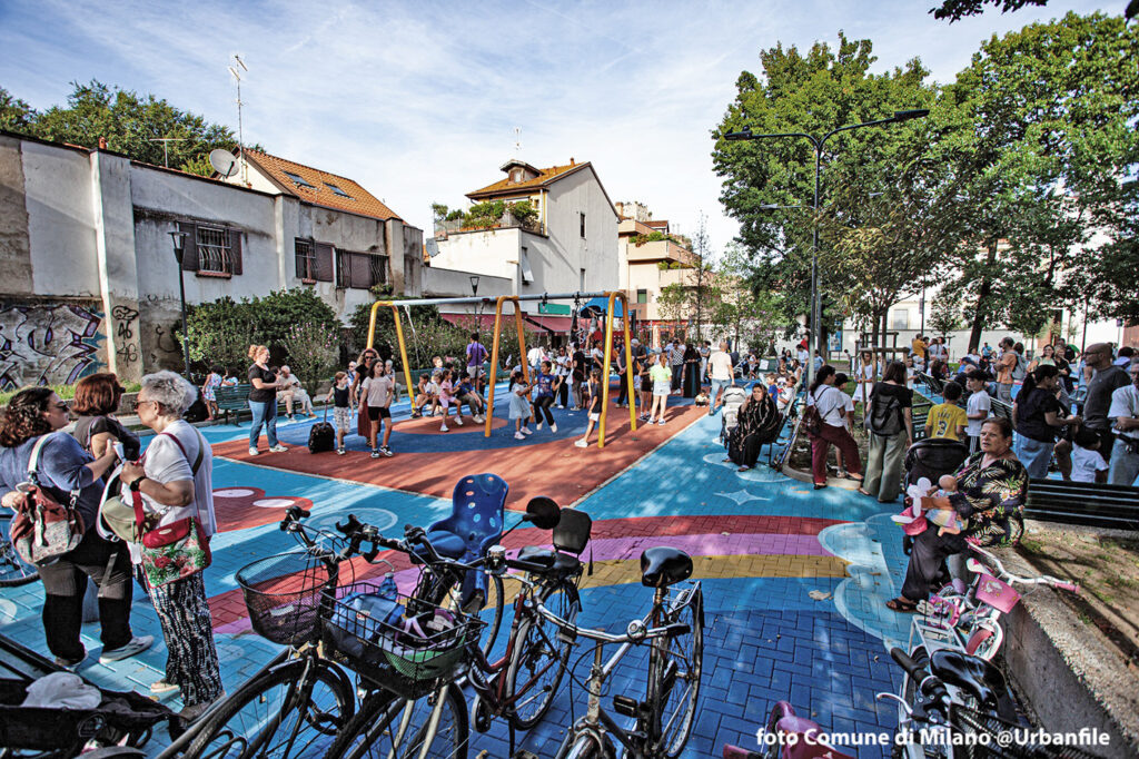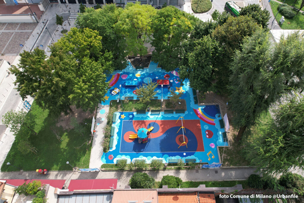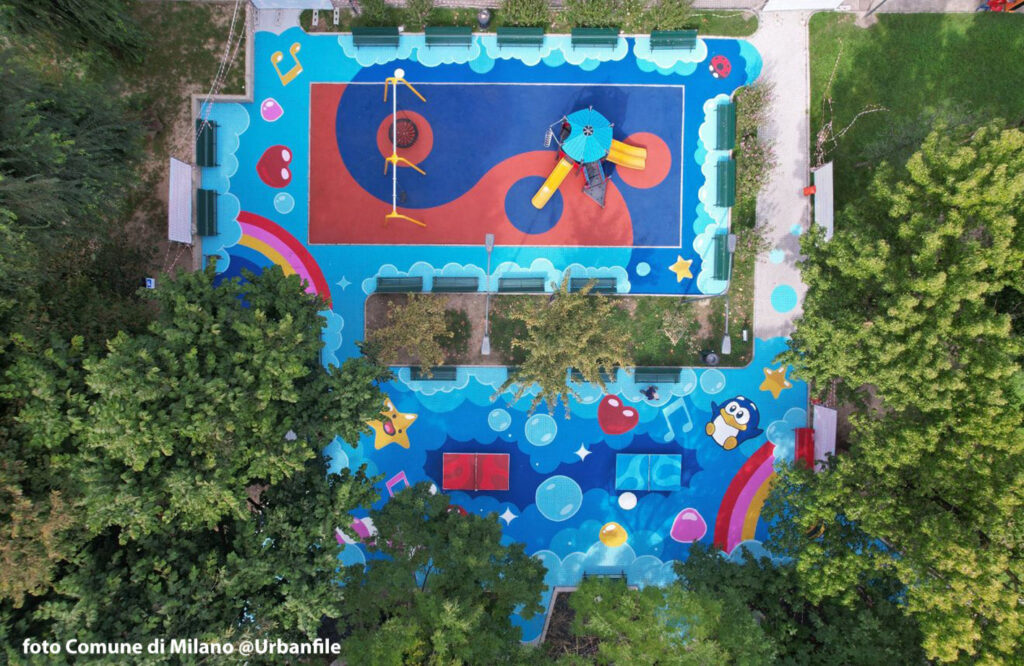 L’area giochi di piazza Belloveso a Niguarda (Municipio 9, Milano) è stata completamente rinnovata grazie a una collaborazione tecnica tra Comune di Milano e HARIBO (azienda dolciaria). Il progetto ha introdotto nuove attrezzature ludiche – altalene, torre con scivoli, parete da arrampicata – insieme a una pavimentazione anti-trauma in materiali riciclati e a una vivace decorazione realizzata dallo street artist milanese PAO.