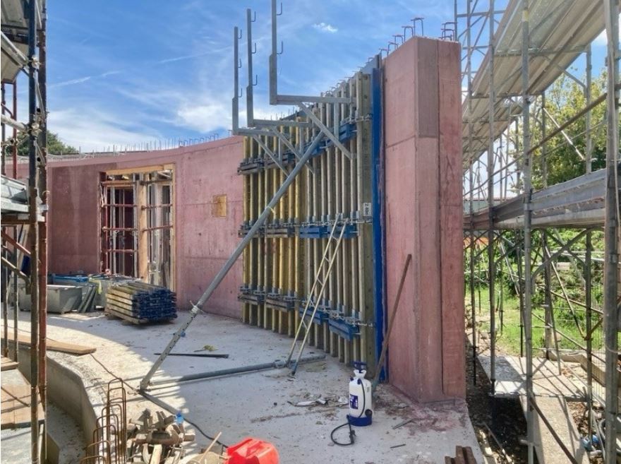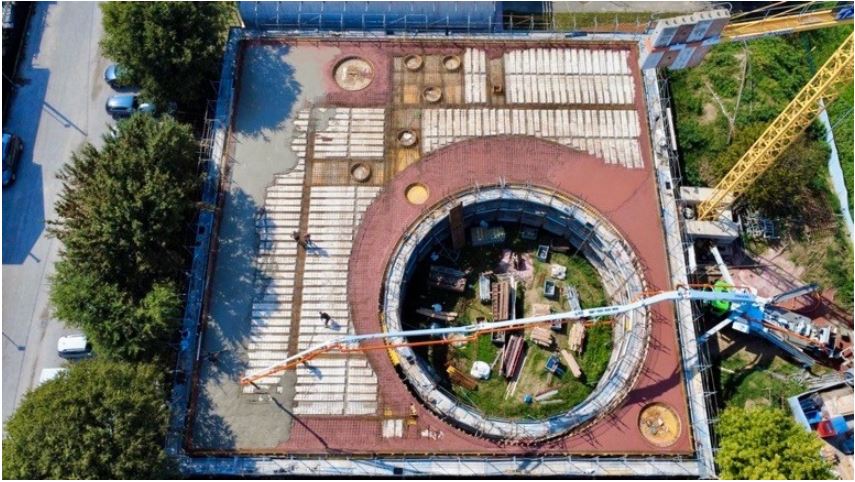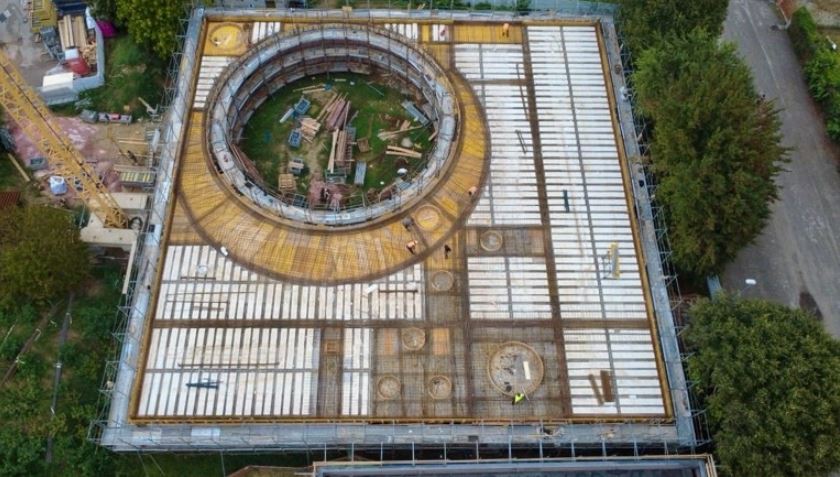 Le strutture portanti, così come le pareti in calcestruzzo armato colorato a vista, sono ormai concluse da qualche tempo. In questi  è stato gettato il solaio di copertura. Nelle prossime settimane invece inizieranno i lavori per le pareti e le strutture all’interno dell’edificio.