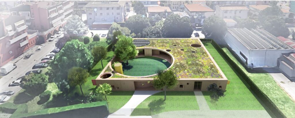 L’edificio occuperà una superficie coperta di 853mq ed un totale di 2600 mq considerando tutte le aree esterne e ospiterà 40 bambini da 0 a 3 anni. Oltre agli uffici di direzione e alla sala riunioni, l’edificio ospita le aule, la mensa e i servizi. Le tre sezioni hanno ognuna un’aula didattica, uno spazio dedicato al riposo, uno al cambio e ai servizi igienici. Il tetto sarà destinato al verde ed ospiterà anche un impianto fotovoltaico.