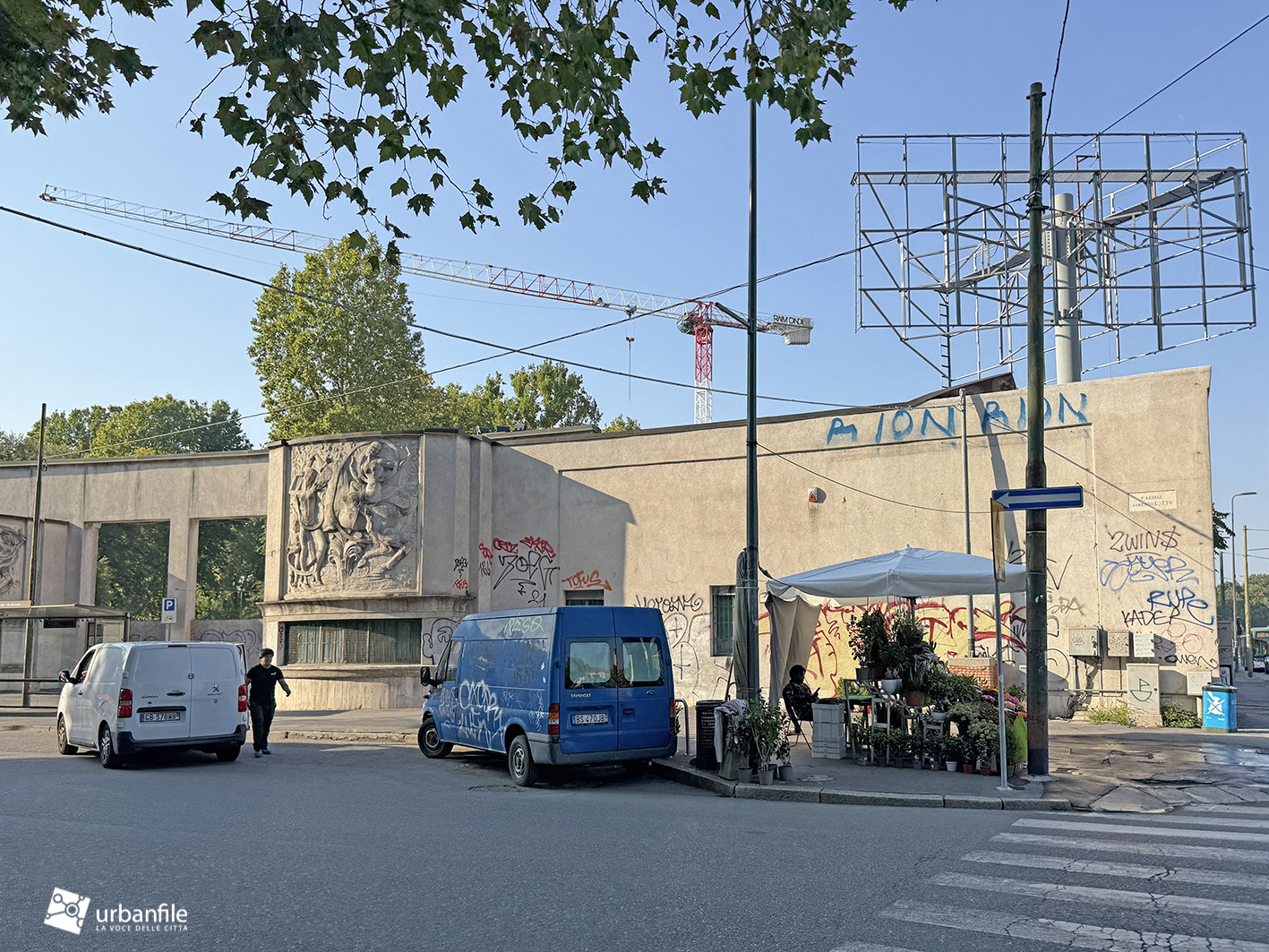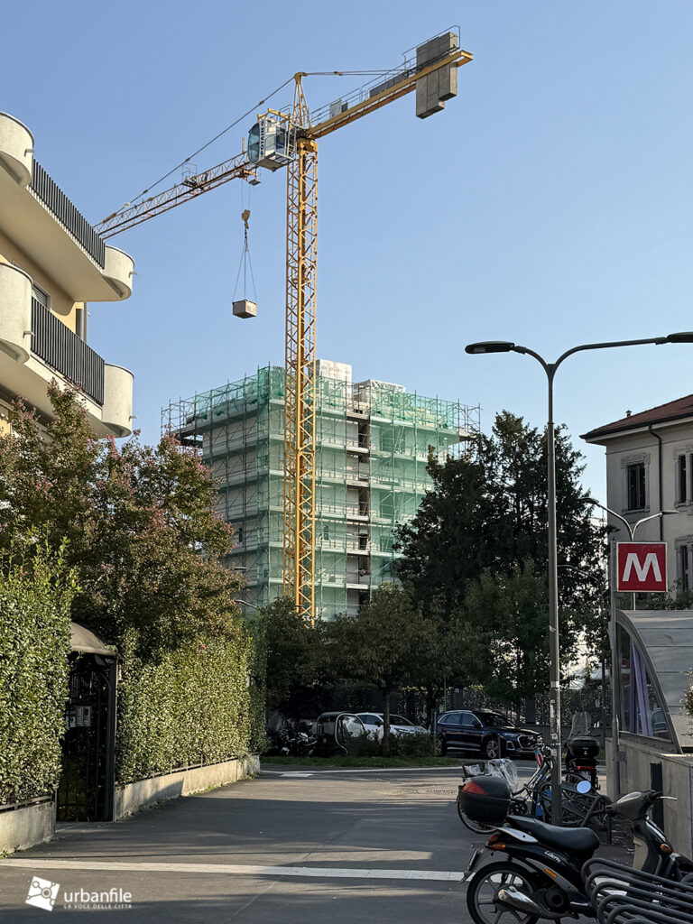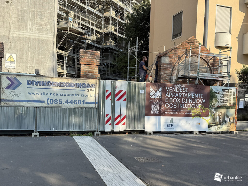 Sempre in via VIgliani ma all’angolo con piazzale Lotto troviamo il cantiere per il complesso residenziale di Milo22, il nuovo edificio che sorge nel sito della villa misteriosa e a forma di castelletto che venne smantellata pezzo per pezzo perché realizzata coi detriti dei bombardamenti della II Guerra Mondiale in maniera arbitraria dal suo proprietario e che era diventata pericolante da anni. (se volete approfondire la sua storia bizzarra qui potete leggere nel nostro articolo dedicato). Al momento qualche “frammento” di merlatura del muro di cinta della villetta lo possiamo ancora vedere da via Paolo Uccello.